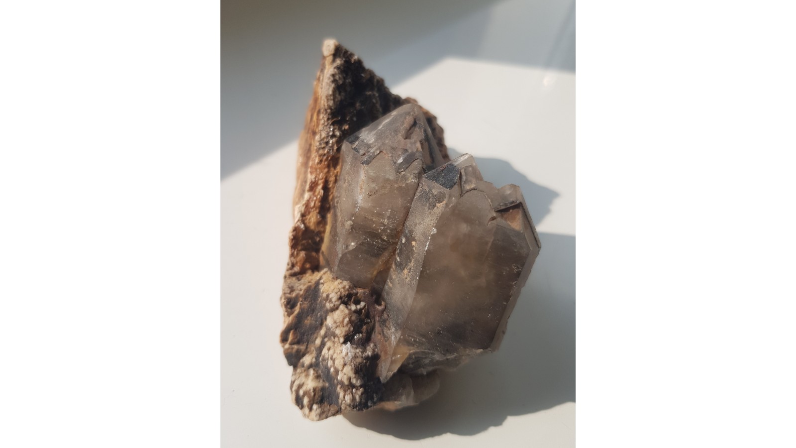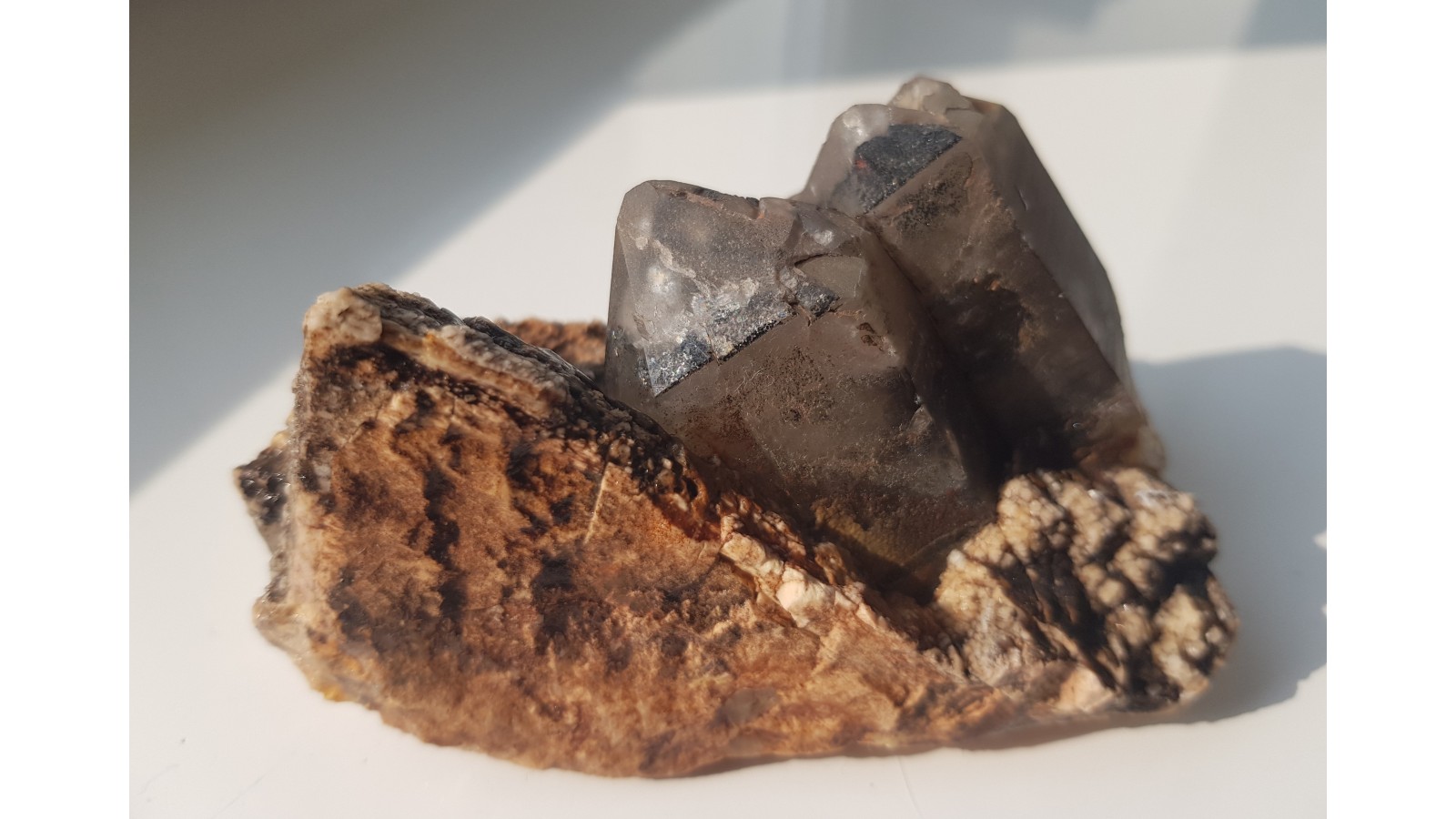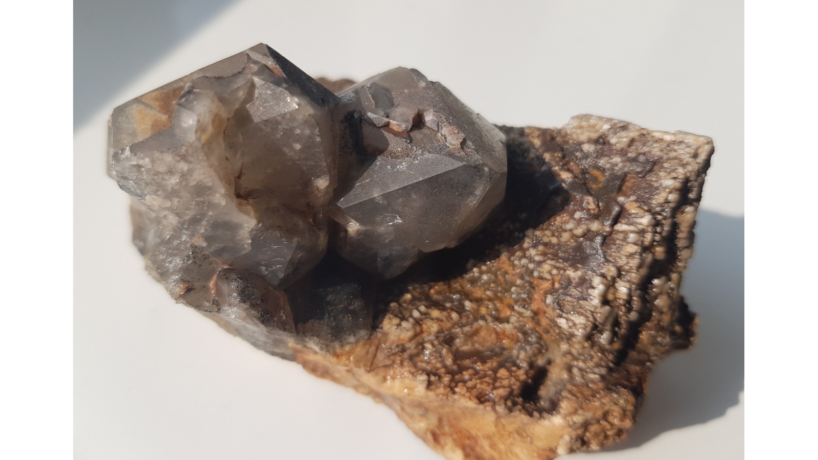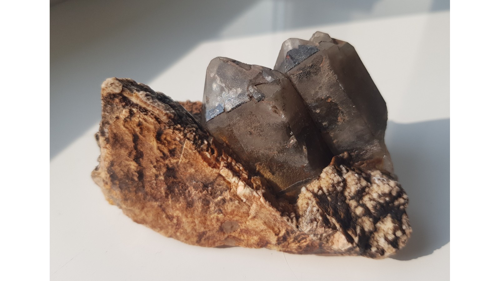 Nieuszkodzone, dwa kryształy dymne na skaleniu z pegmatytu z Cieplic k. Jeleniej Góry. Polecam.