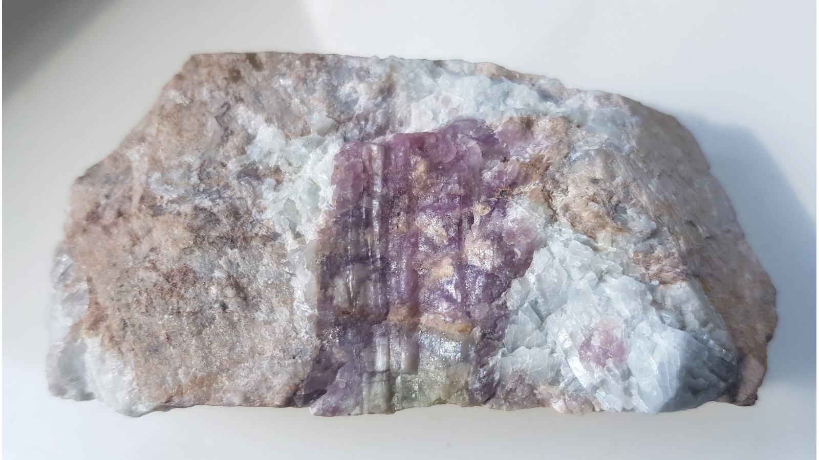 Okaz barwnego elbaitu (turmalin litowy) narastający na spodumenie z Piławy Górnej w Górach Sowich. Barwa różowa i zielonkawa. Rzadkość mineralogiczna z dotychczas jedynego znanego w polskich Sudetach stanowiska turmalinów litowych. Polecam.