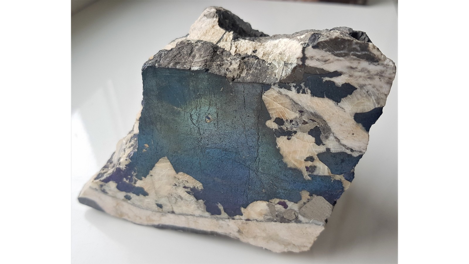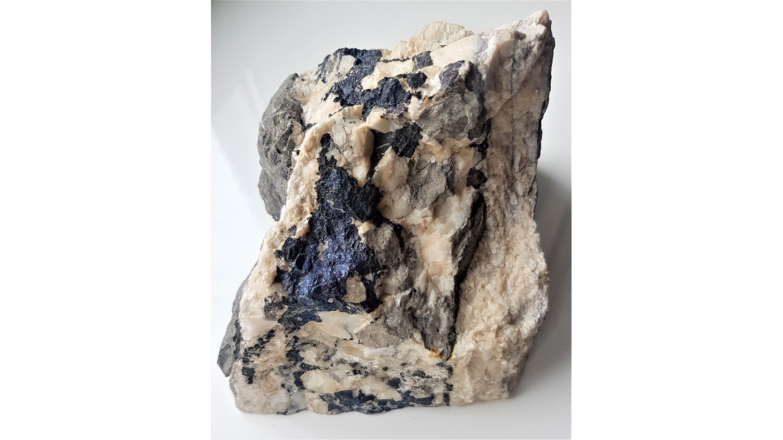 Duży okaz kowelinu w żyle barytowej. Okaz z jednej strony polerowany. Przedstawia przekrój okruszcowanej żyły barytowej z zagłębia miedziowego.