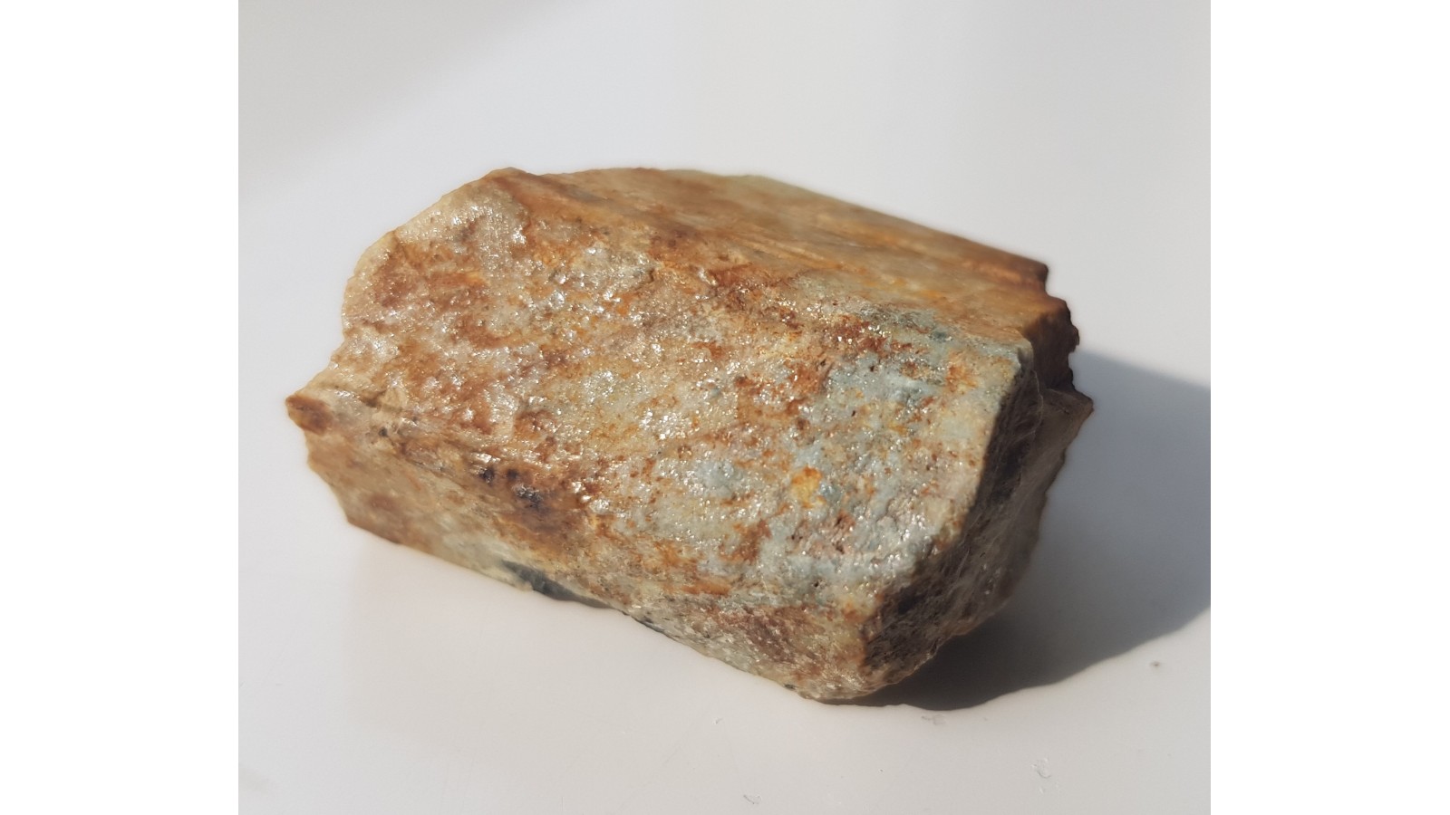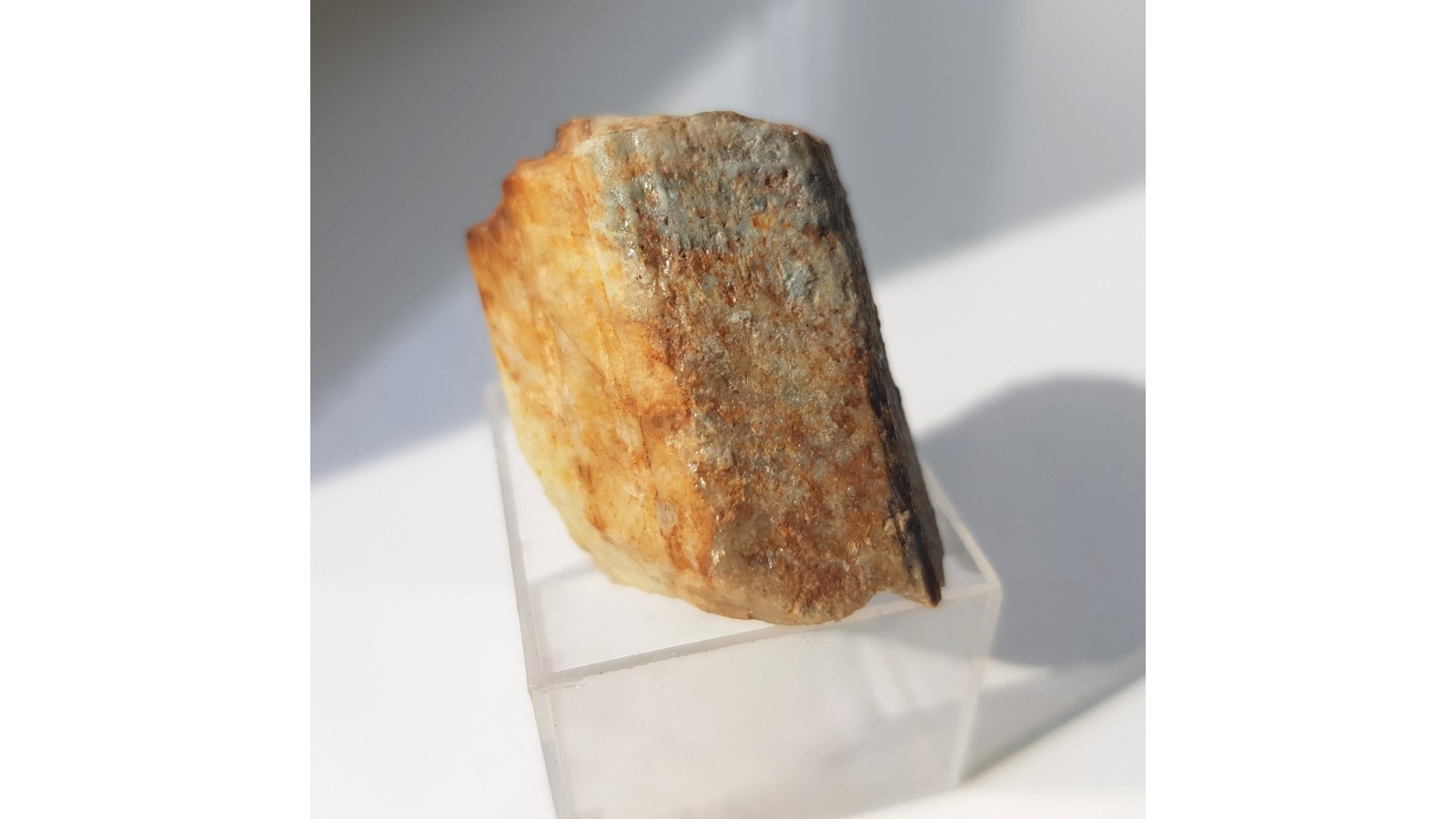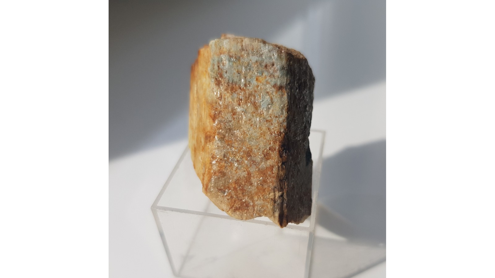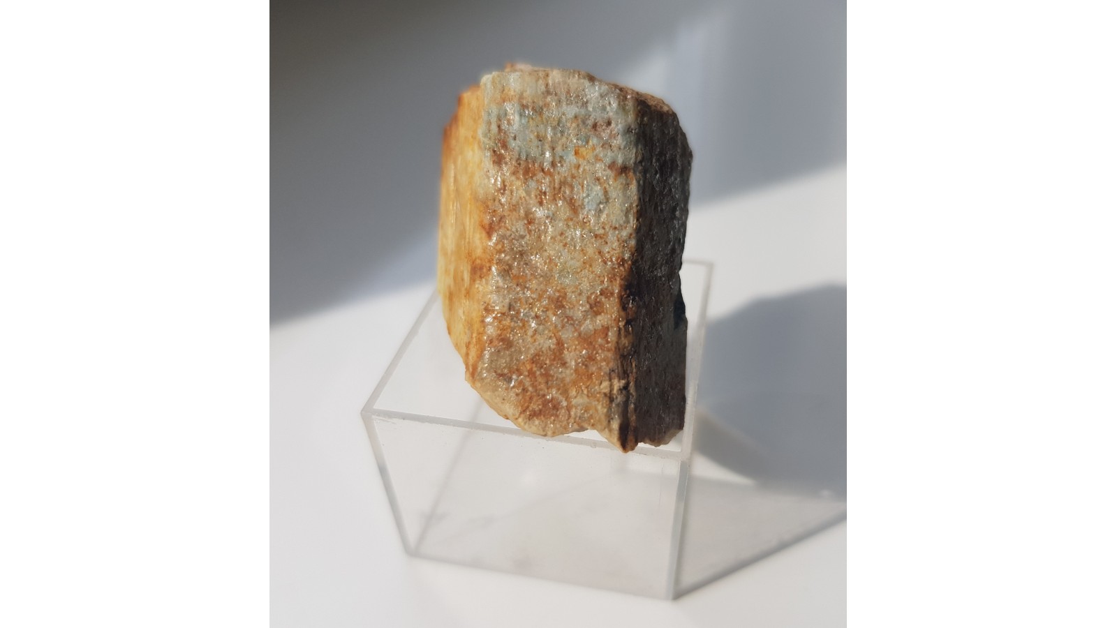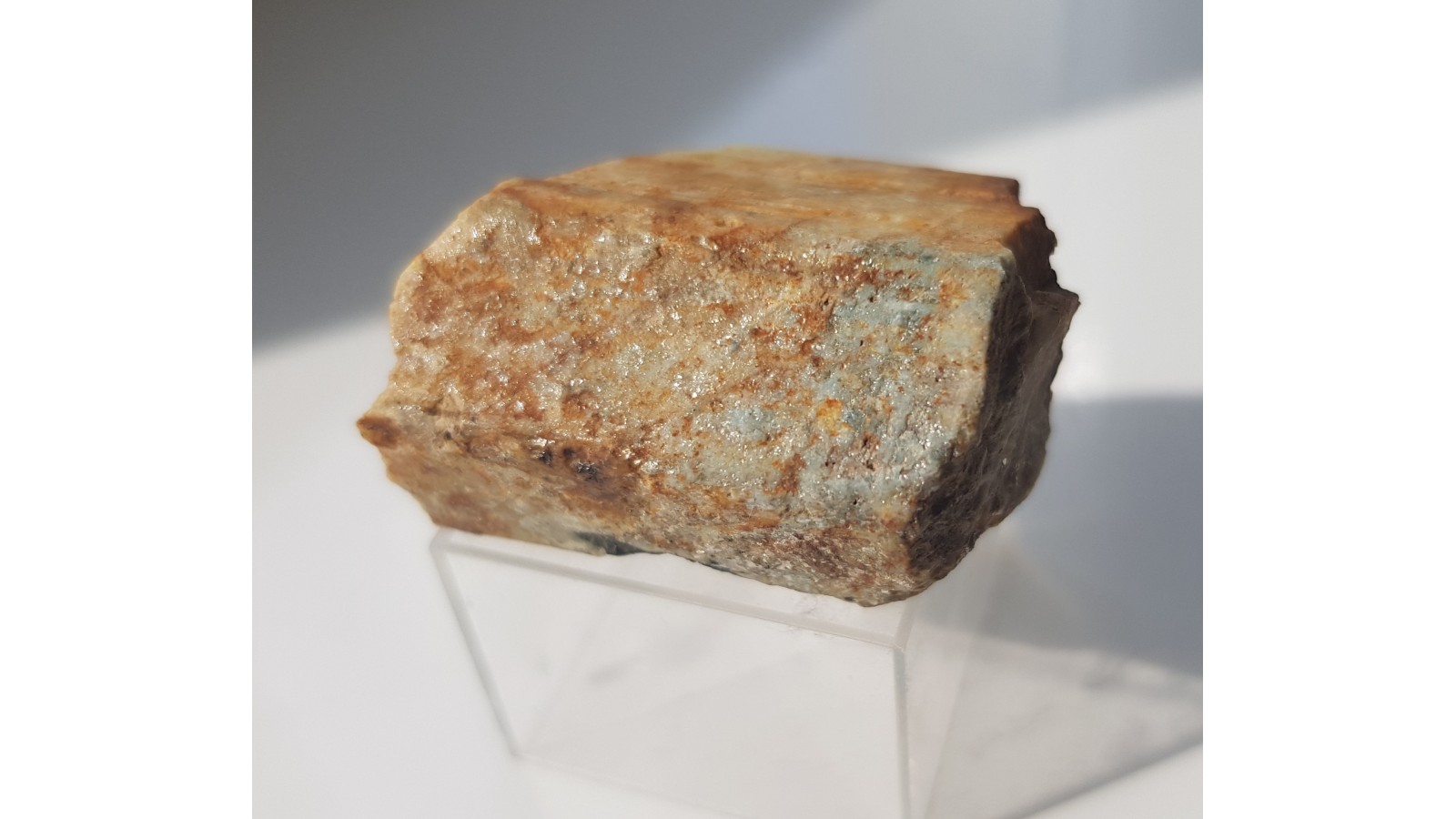 Kryształ berylu z pegmatytów sowiogórskich z okolic Kietlic k. Bielawy. Na stronie niebieskiej zmienionego wtórnie berylu widmo pokazuje występowanie fenakitu, minerału wtórnego po berylu. Część kryształu zmieniona wtórnie jest wyraźnie niebieska, pozostała to zwykły beryl. Unikat. Polecam.