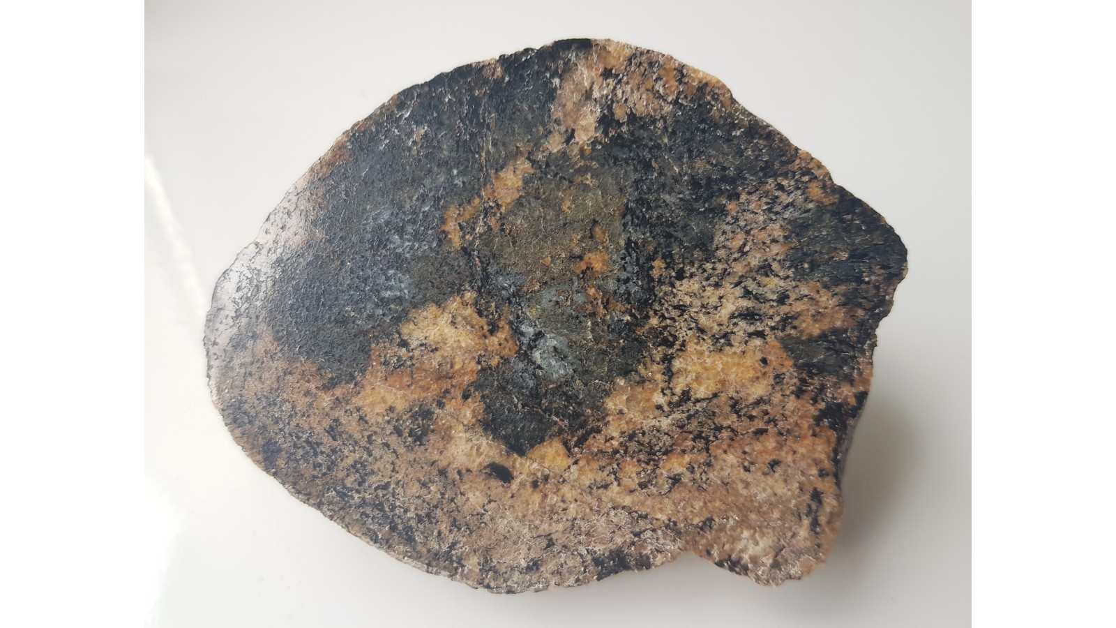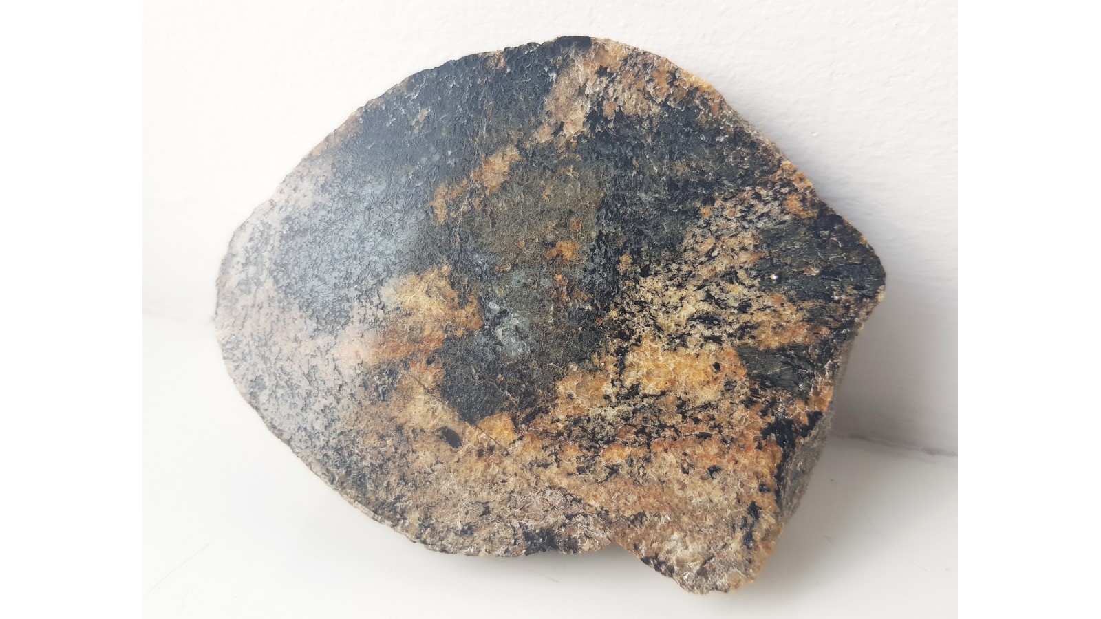 Okaz gnejsu kordierytowego z wyraźnymi skupieniami kordierytu i biotytu na jasnym tle skaleniowo-kwarcowym. Widoczna szaroniebieskawa oraz zielonawa barwa kordierytu. Okaz polerowany jednostronnie. Pochodzenie - blok gnejsowy Gór Sowich. Polecam.