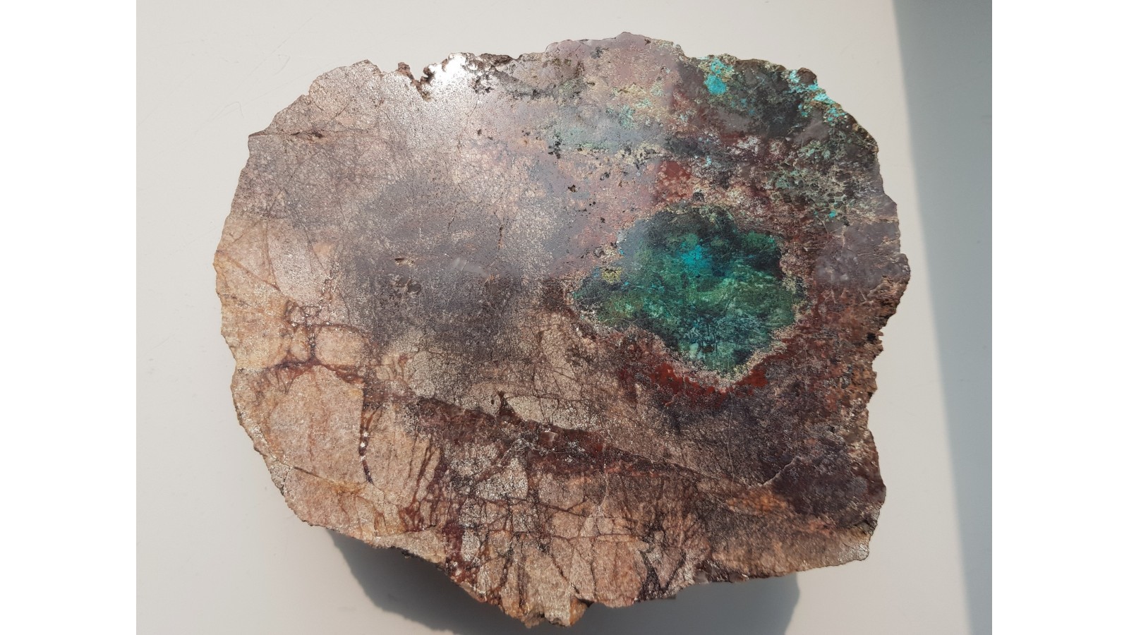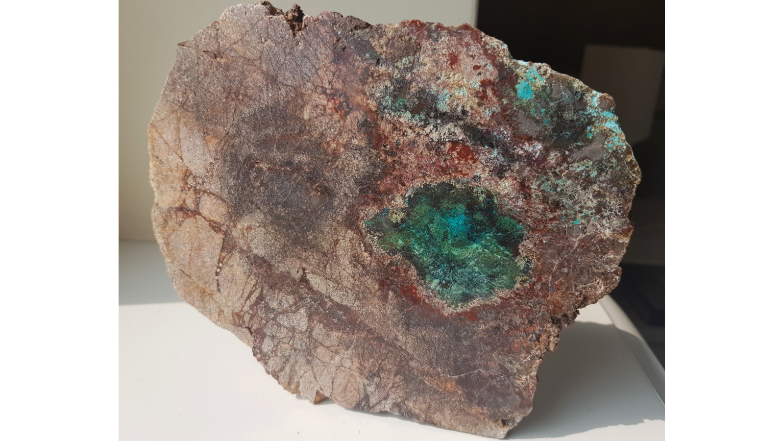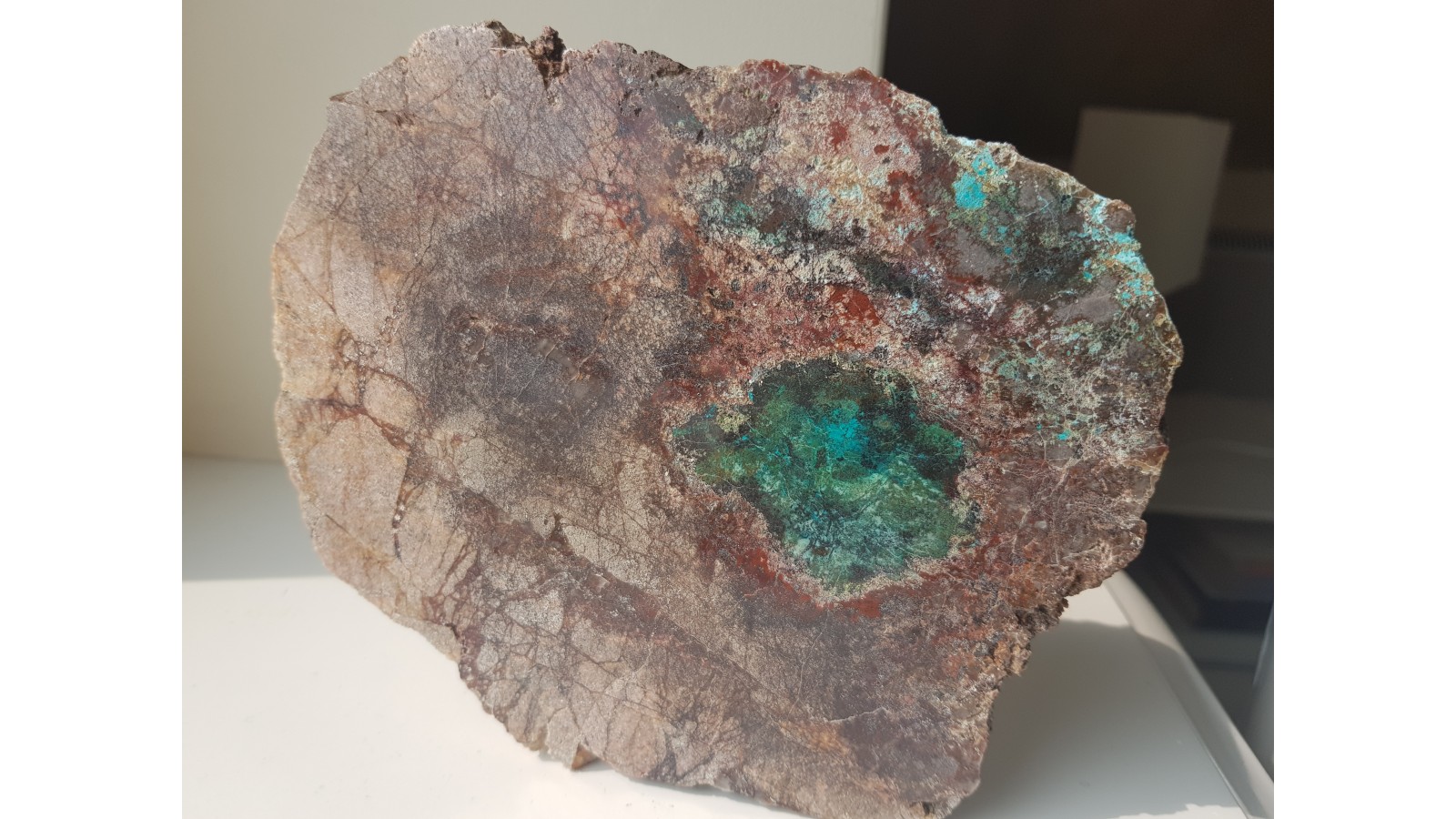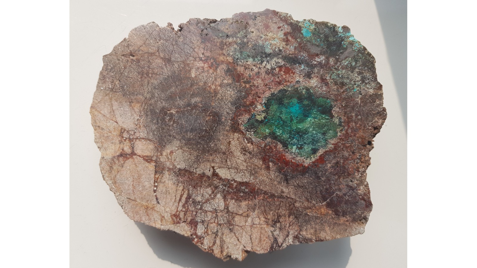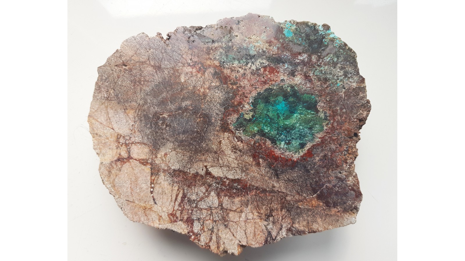 Duży, polerowany okaz dolomitu z Rędzin k. Kamiennej Góry ze strefą okwarcowania i pierwotną oraz wtórną mineralizacją miedziową. Okaz bardzo estetyczny - barwny, ciekawy teksturalnie, ozdobny, kontrastowo zabarwiony. Strona przeciwna naturalna, nie cięta. Polecam.