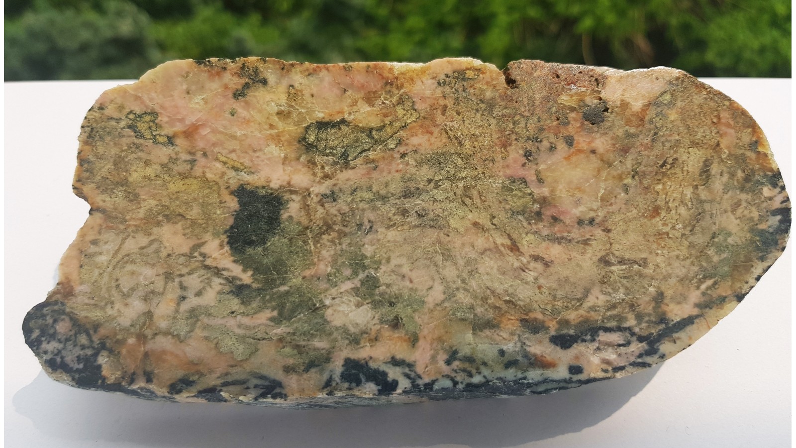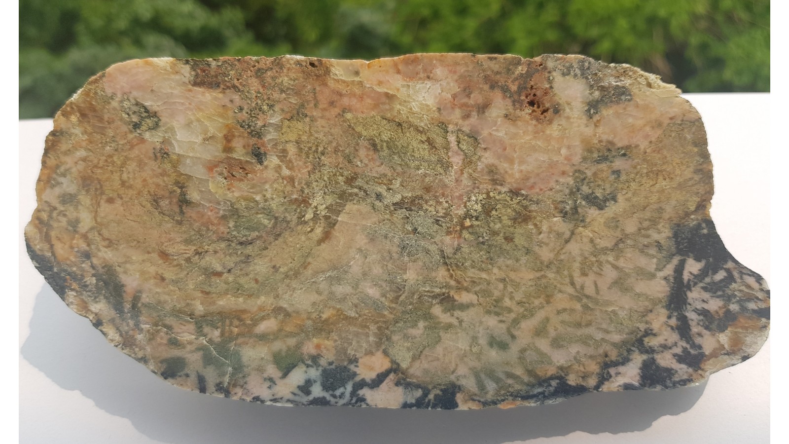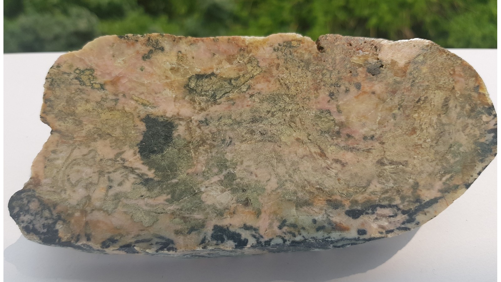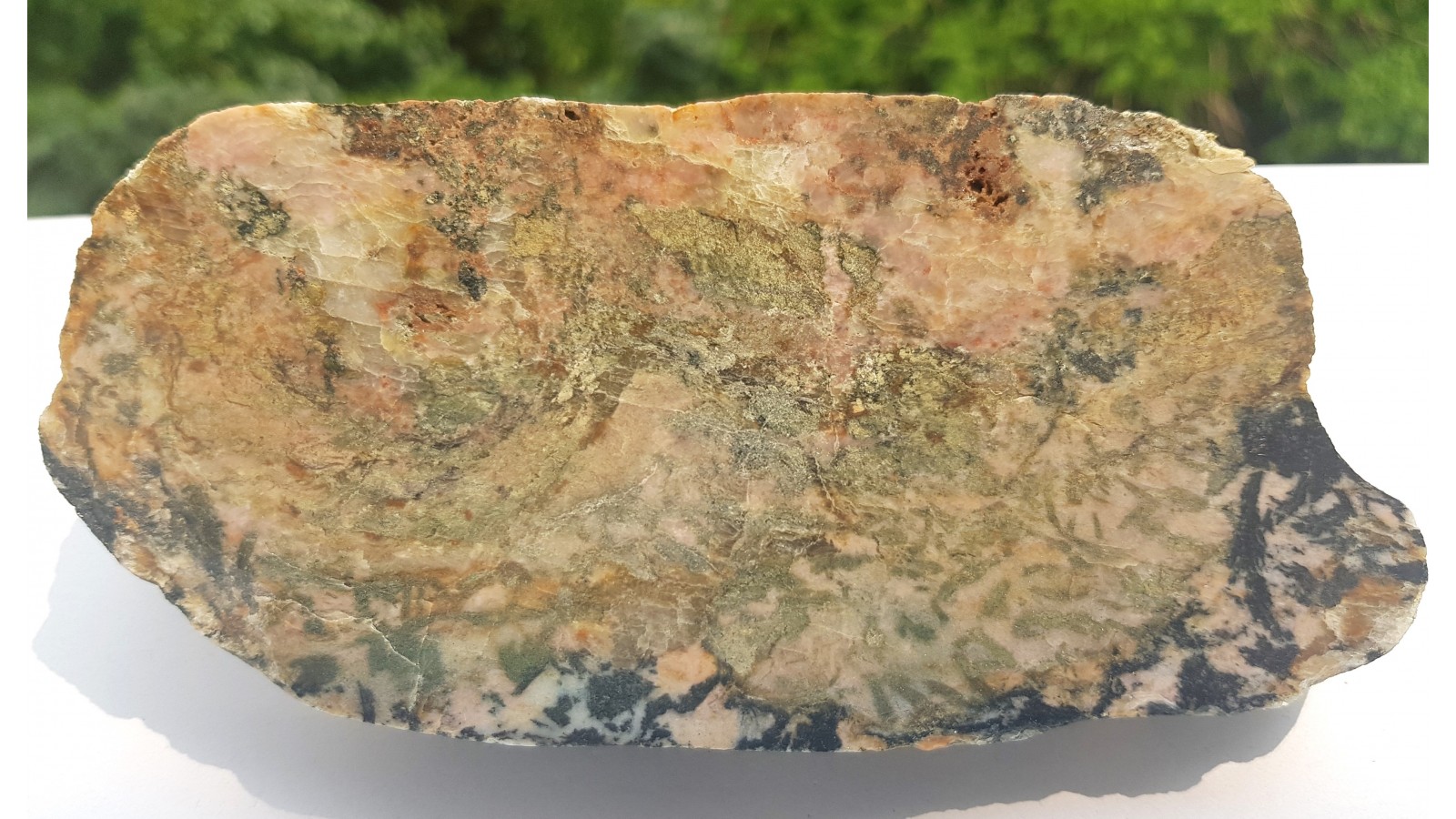 Duża strefa saussurytyzacji w amfibolitach z wyraźnym, różowym, masywnym zoisytem oraz przeobrażonymi wtórnie amfibolami. W próbce także brązowoczerwony granat. Okaz z Sudetów Wschodnich, z okolic Głuchołaz. Okaz polerowany dwustronnie. Bardzo ozdobny, estetyczny. Polecam.