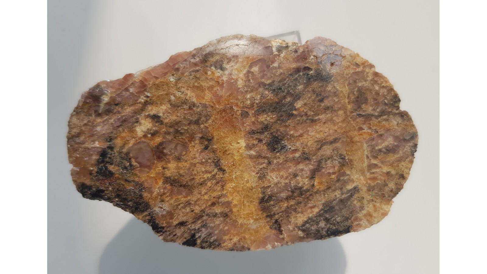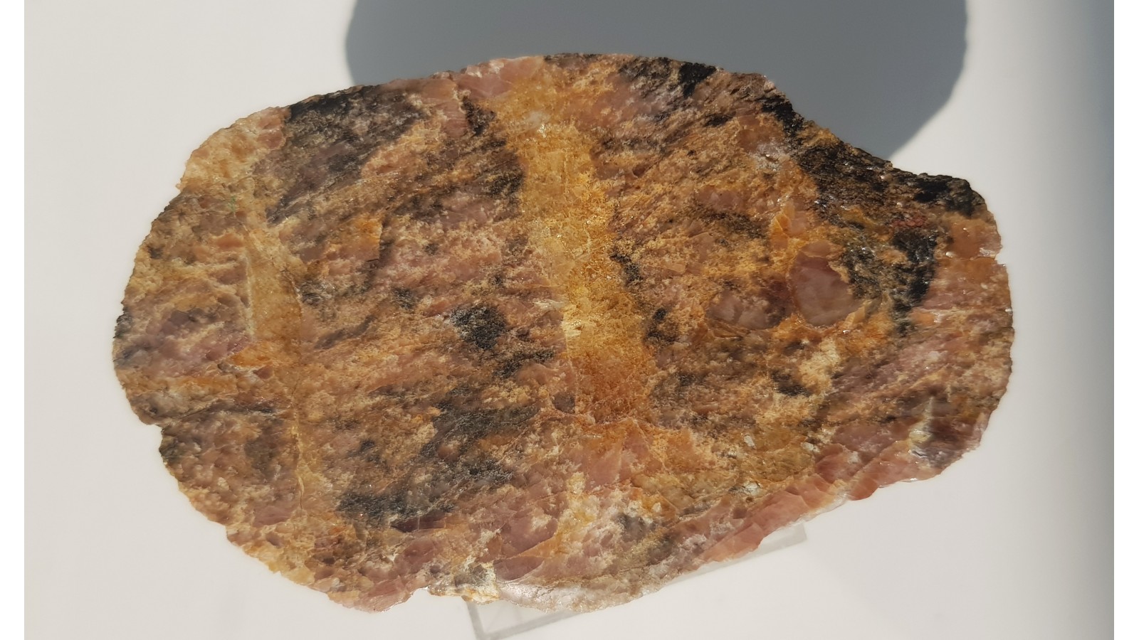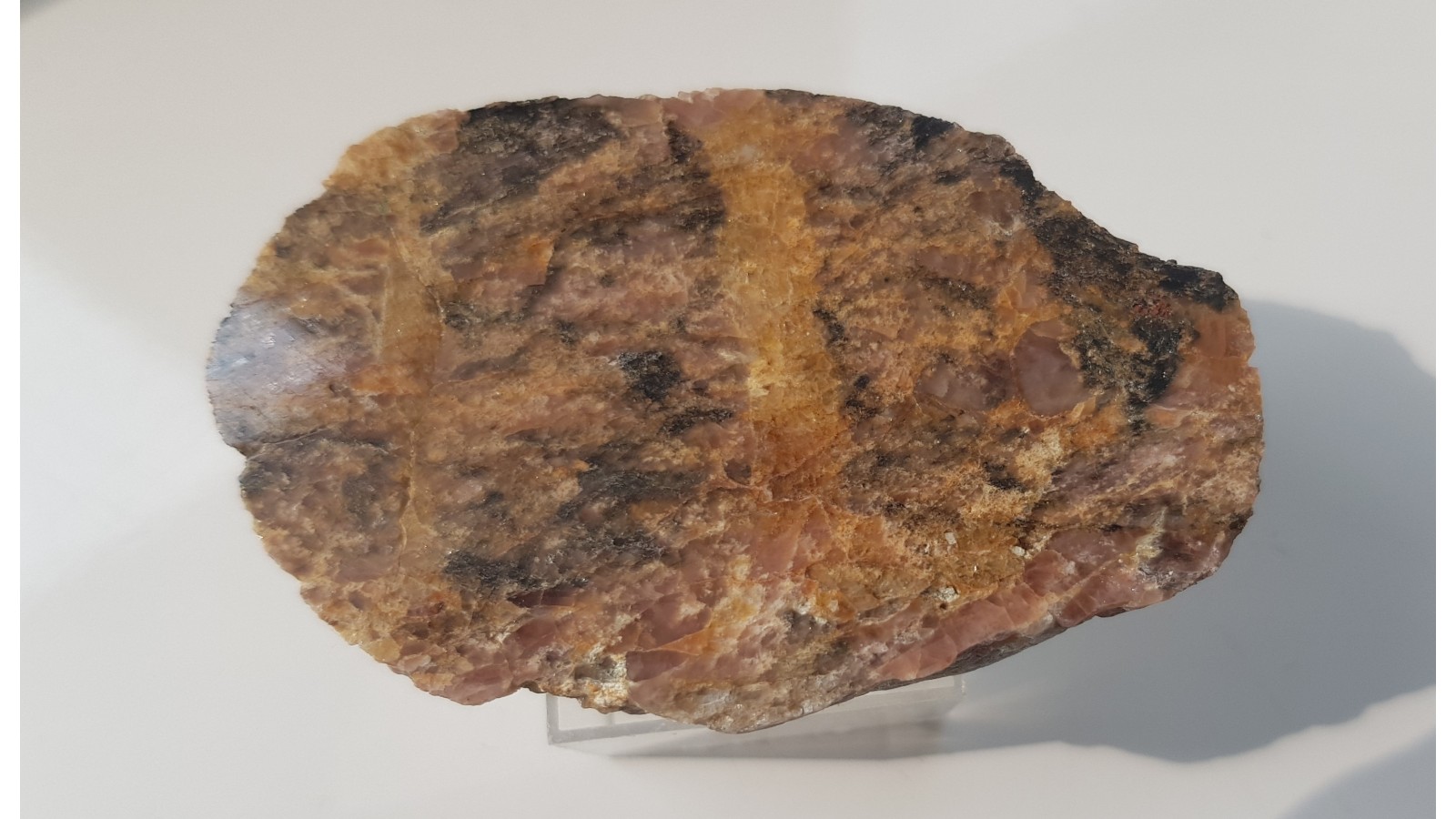 Polerowany okaz andaluzytu z Głuchołaz. Wyrazista różowa barwa andaluzytu. Nieopisywane dotąd okazy z polskich Sudetów Wschodnich. Połówka niewielkiego otoczaka, strona przeciwna naturalna. Polecam.