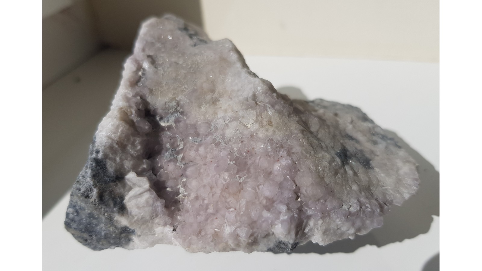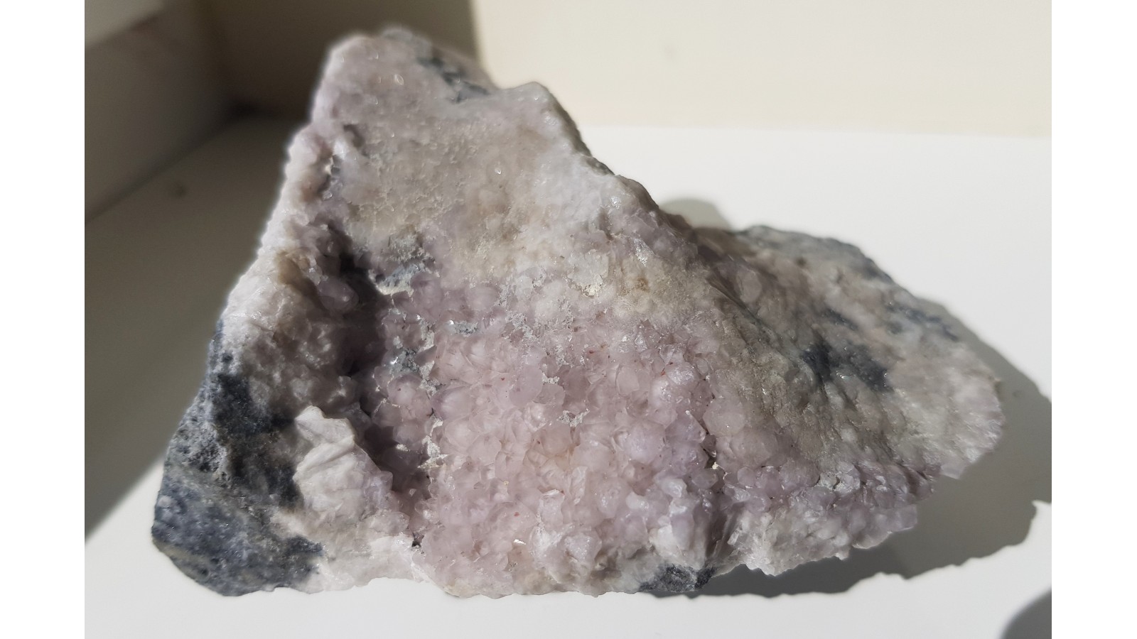 Okaz z nietypowej lokalizacji - najbliższych okolic Lądka-Zdroju. Szczotka kwarcowa z delikatnym odcieniem ametystowym. Nieuszkodzona, estetyczna. Docięta od spodu w celu zmniejszenia ilości skały. Polecam.