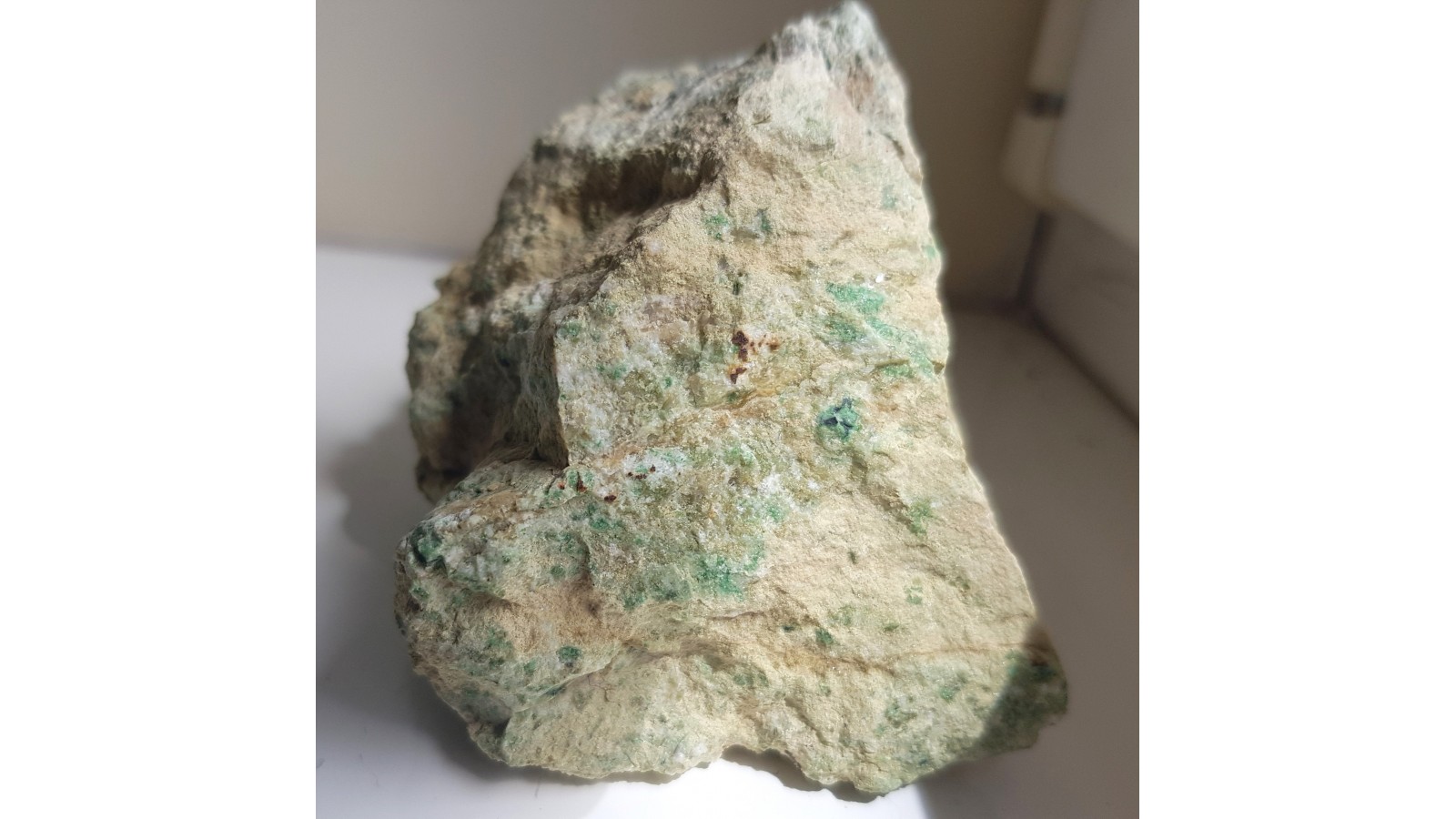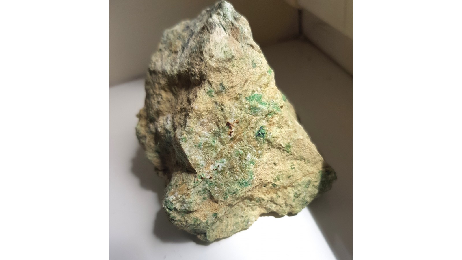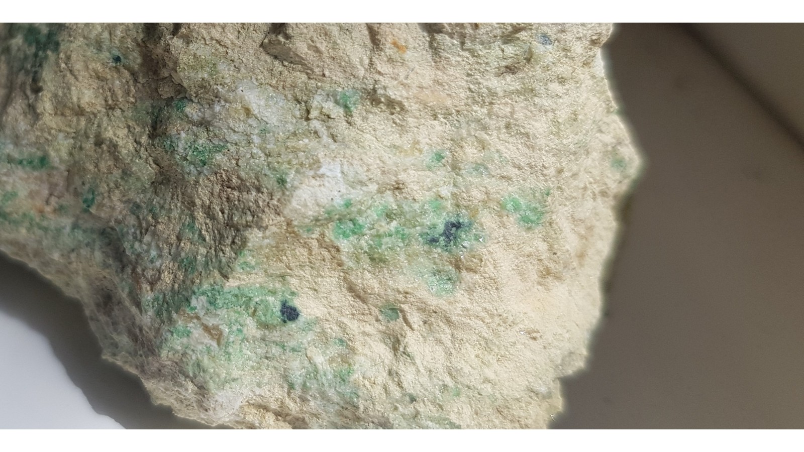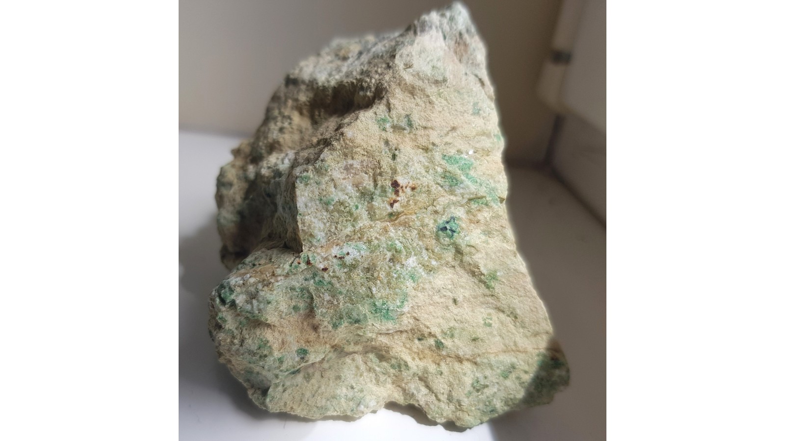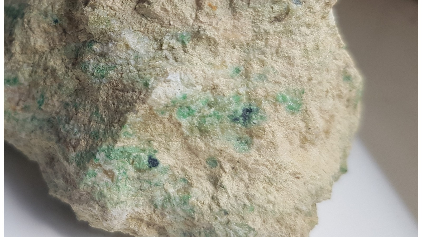 Okaz intensywnie zabarwionego, chromowozielonego grossularu-(Cr) w wrostkami ciemnych spineli w jasnym rodingicie z kamieniołomu serpentynitu w Nasławicach. Bardzo rzadka odmiana granatu chromowego. Strefa z grossularem chromowym została już wyeksploatowana. Rzadkość mineralogiczna z Sudetów. Polecam.