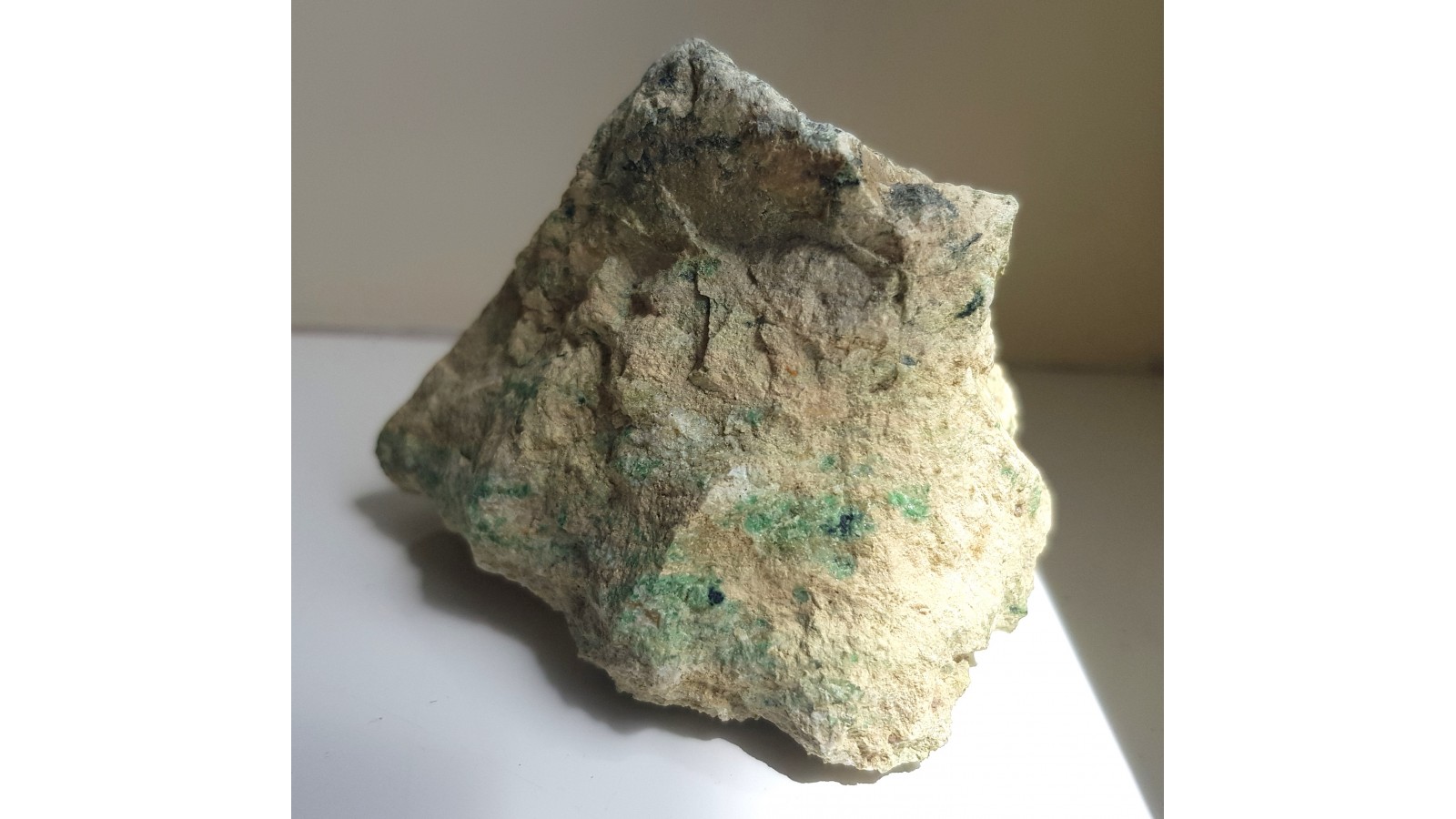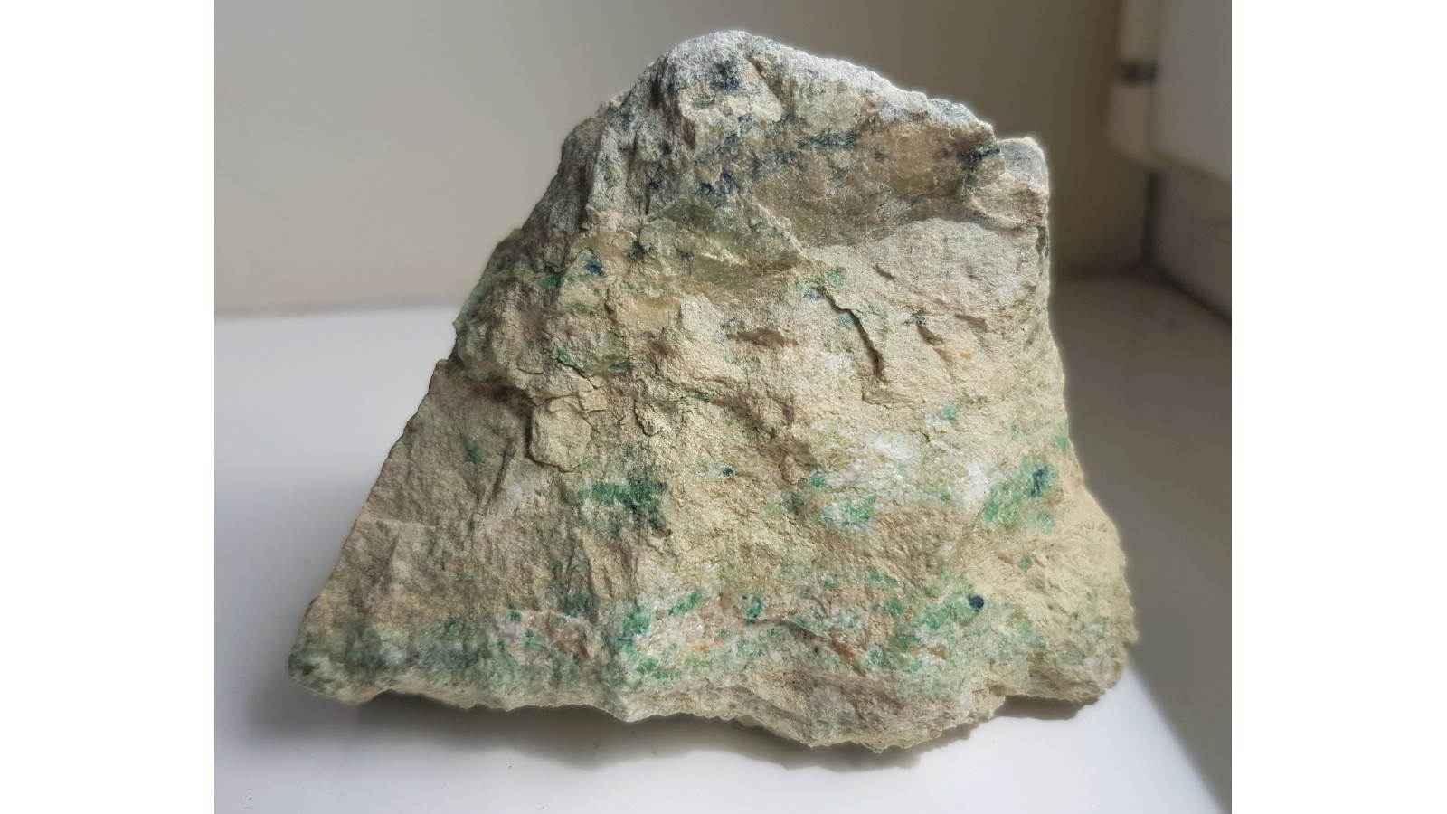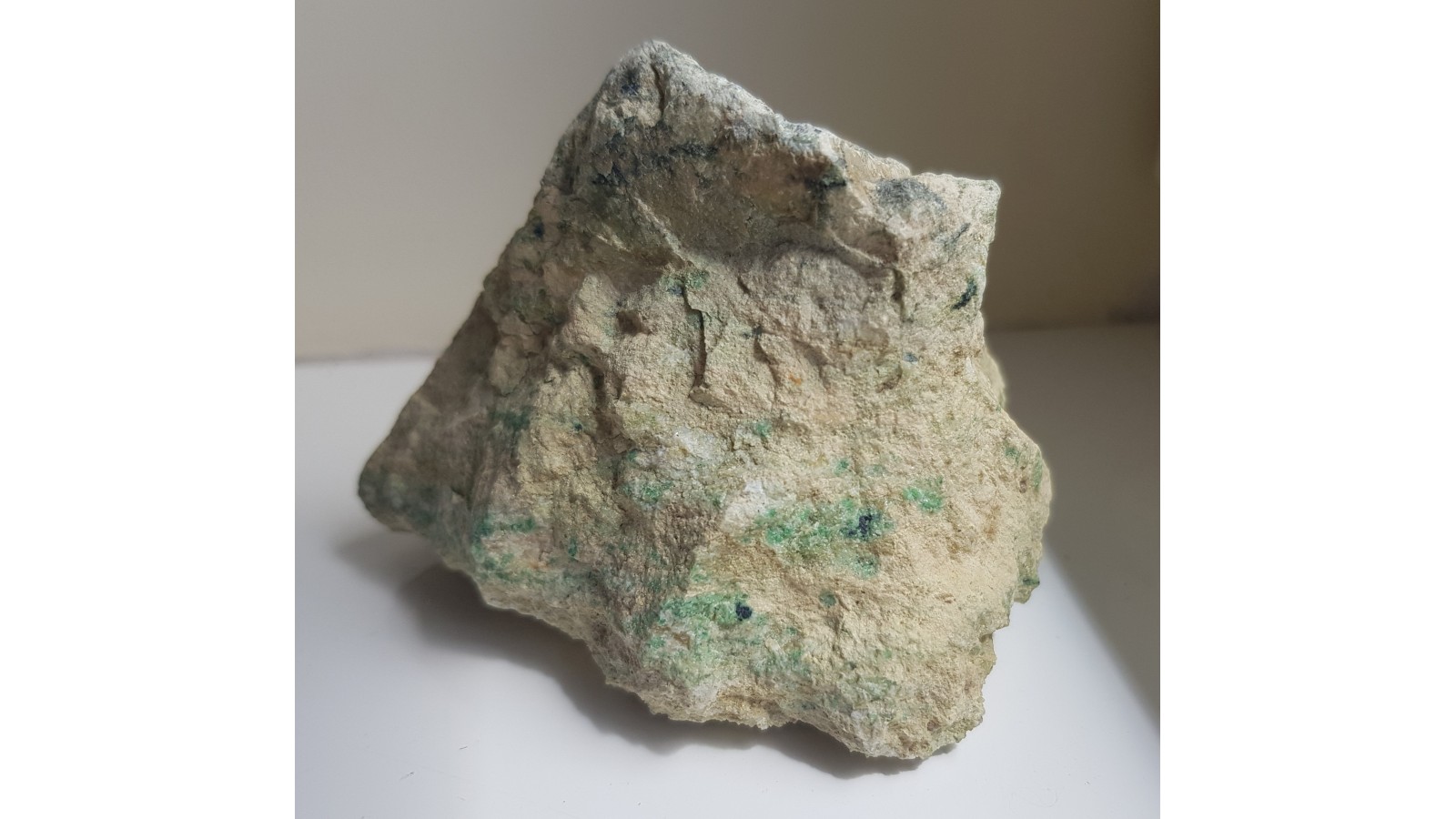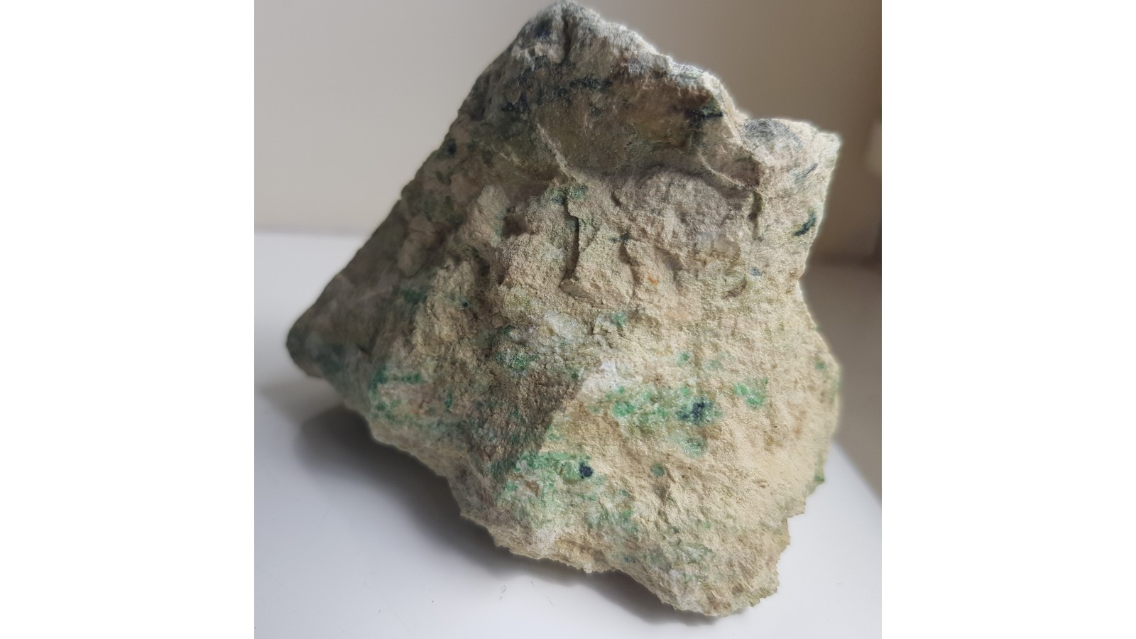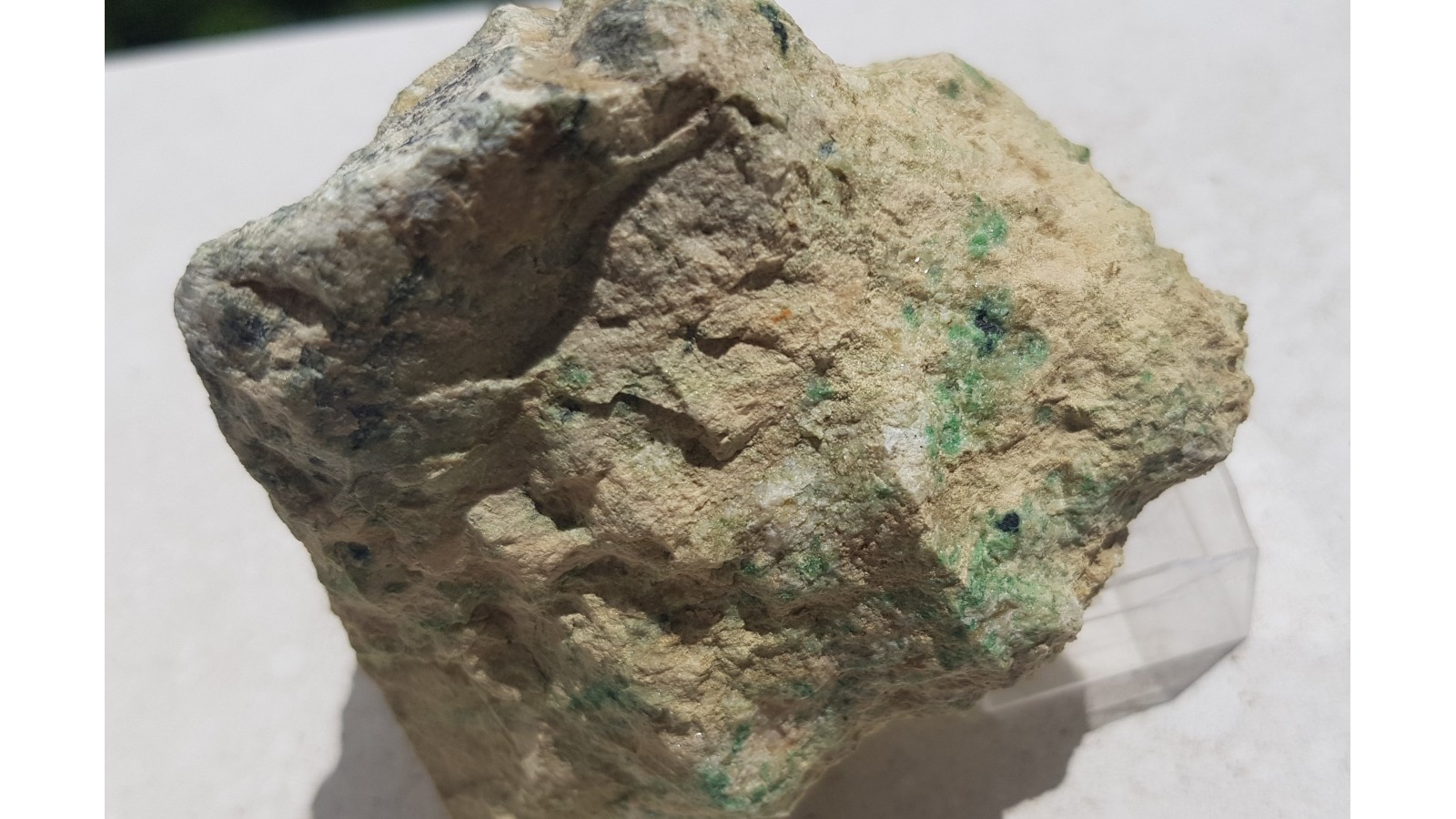 Okaz intensywnie zabarwionego, chromowozielonego grossularu-(Cr) w wrostkami ciemnych spineli w jasnym rodingicie z kamieniołomu serpentynitu w Nasławicach. Bardzo rzadka odmiana granatu chromowego. Strefa z grossularem chromowym została już wyeksploatowana. Rzadkość mineralogiczna z Sudetów. Polecam.
