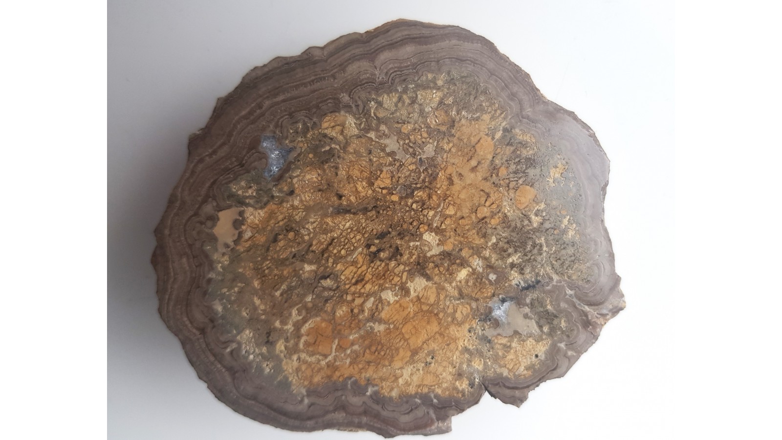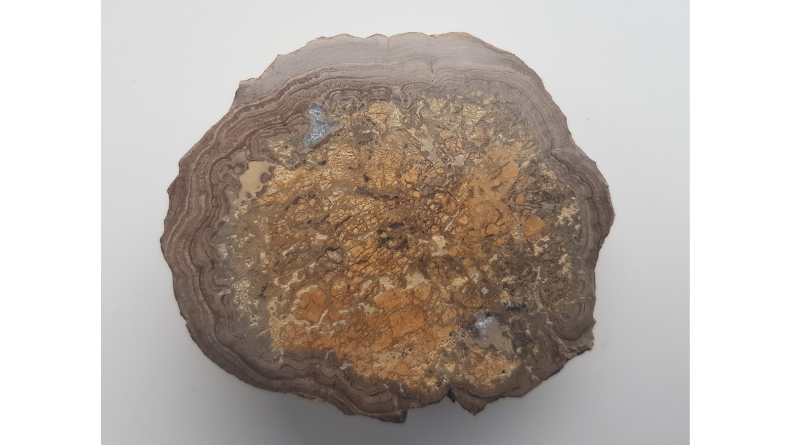 Polerowany okaz stromatolitu z wapieni jurajskich z okolic Zawiercia. Na przekroju doskonale widoczna warstwowana budowa oraz powierzchnia (na odwrocie). Stromatolity te należą do tzw. onkoidów, które tocząc się po dnie zbiornika morskiego wskutek ruchu fal obrastały sinicami z każdej strony. Rzadkość. Polecam.