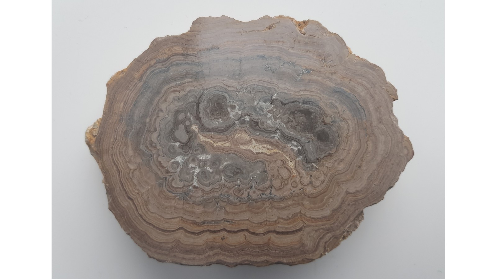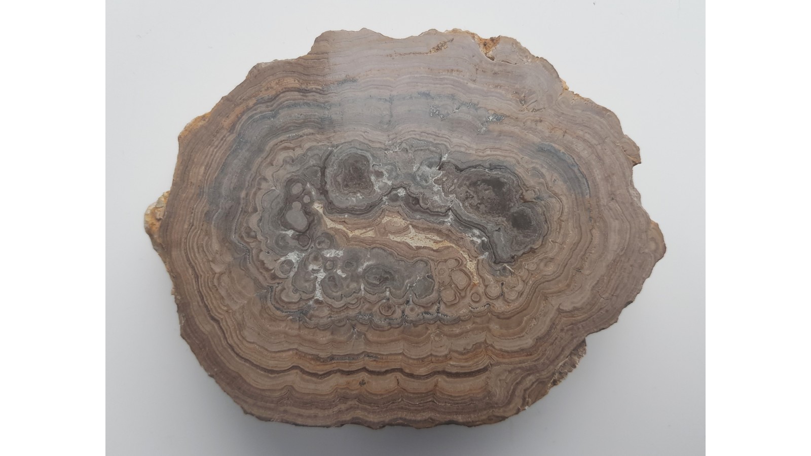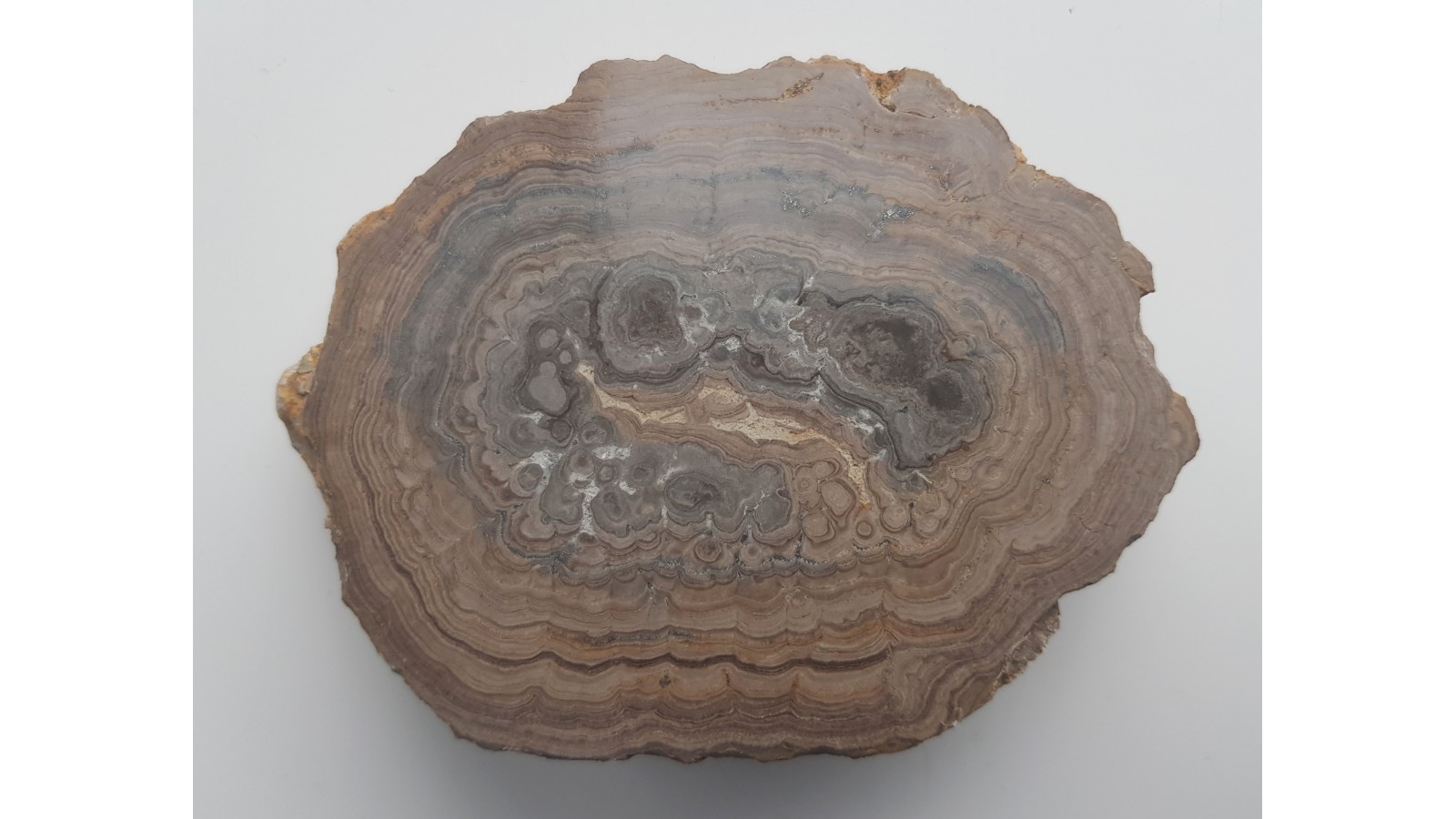 Polerowany okaz stromatolitu z wapieni jurajskich z okolic Zawiercia. Na przekroju doskonale widoczna warstwowana budowa oraz powierzchnia (na odwrocie). Stromatolity te należą do tzw. onkoidów, które tocząc się po dnie zbiornika morskiego wskutek ruchu fal obrastały sinicami z każdej strony. Rzadkość. Polecam.