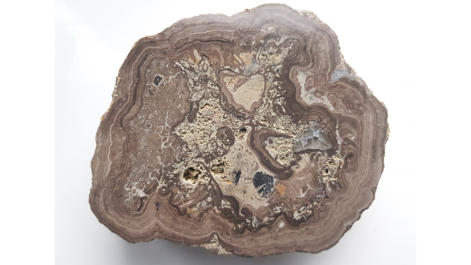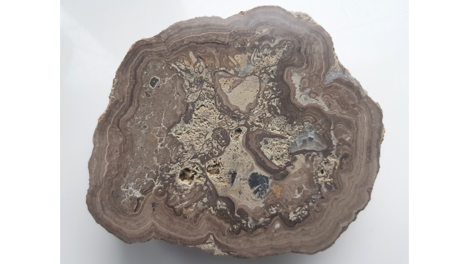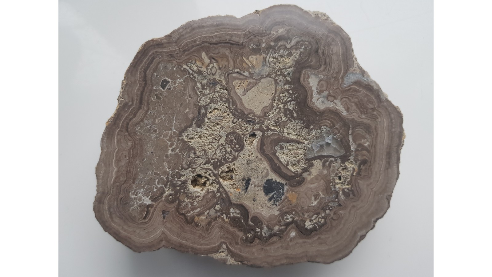 Polerowany okaz stromatolitu z wapieni jurajskich z okolic Zawiercia. Na przekroju doskonale widoczna warstwowana budowa oraz powierzchnia (na odwrocie). Stromatolity te należą do tzw. onkoidów, które tocząc się po dnie zbiornika morskiego wskutek ruchu fal obrastały sinicami z każdej strony. Rzadkość. Polecam.