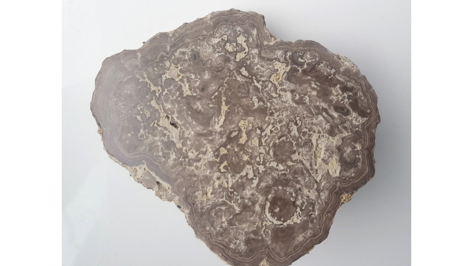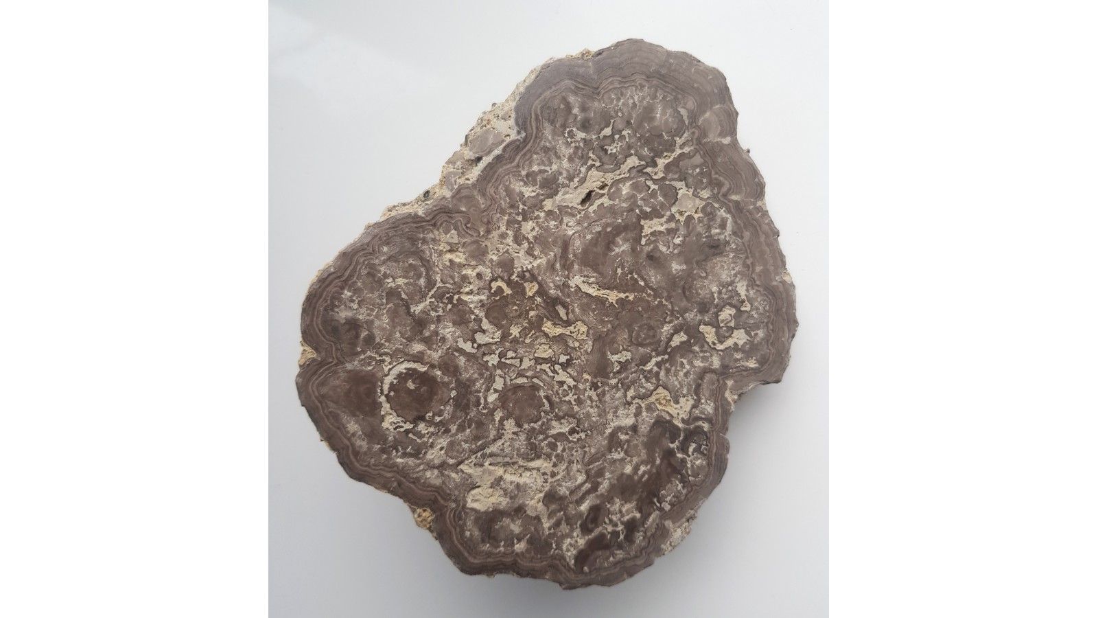 Polerowany okaz stromatolitu z wapieni jurajskich z okolic Zawiercia. Na przekroju doskonale widoczna warstwowana budowa oraz powierzchnia (na odwrocie). Stromatolity te należą do tzw. onkoidów, które tocząc się po dnie zbiornika morskiego wskutek ruchu fal obrastały sinicami z każdej strony. Rzadkość. Polecam.