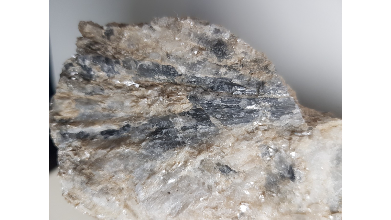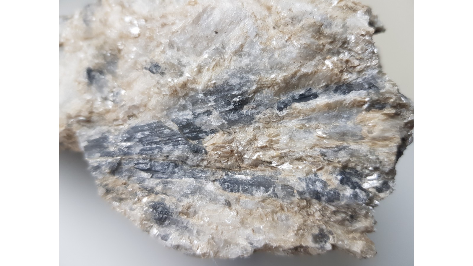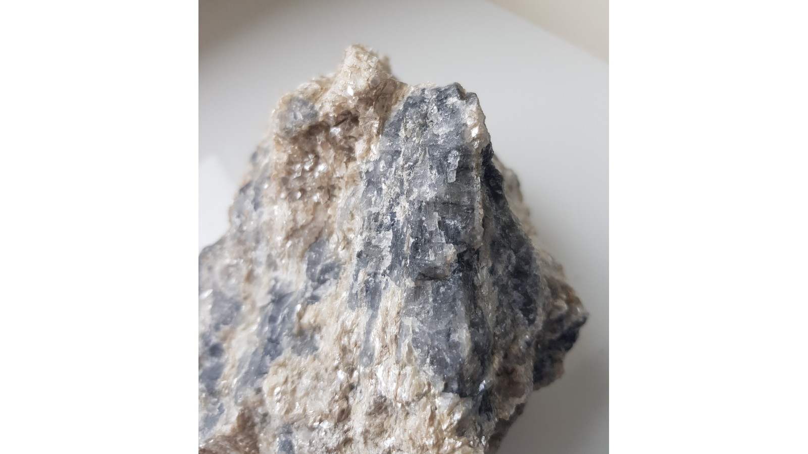 Bardzo rzadki boranokrzemian z grupy kornerupinu w postaci wrośniętych w skałę macierzystą kryształów barwy szaroniebieskawej. Skupienie wachlarzowe, promieniste kryształów. Kryształy przeświecające o połysku szklistym. Niezwykle rzadki minerał w dużych skupieniach krystalicznych. Okaz z Hasseli, Gavleborg, Szwecja. Polecam.