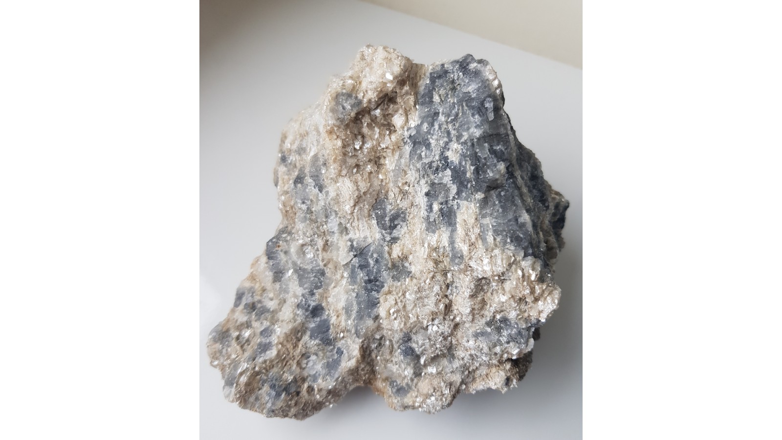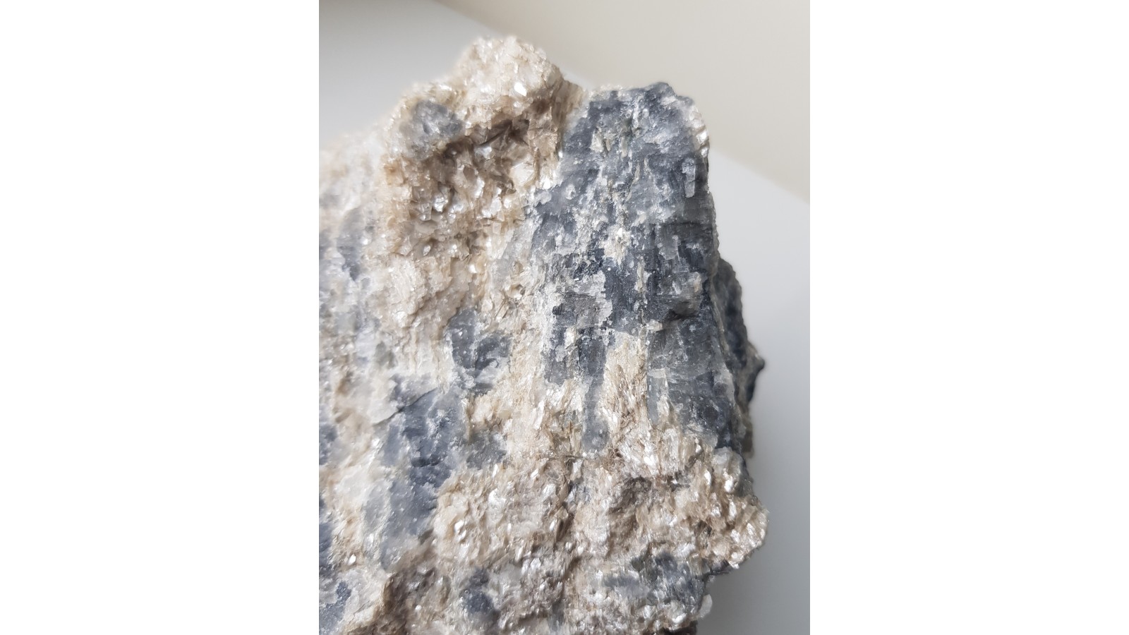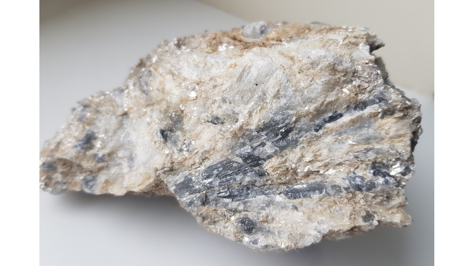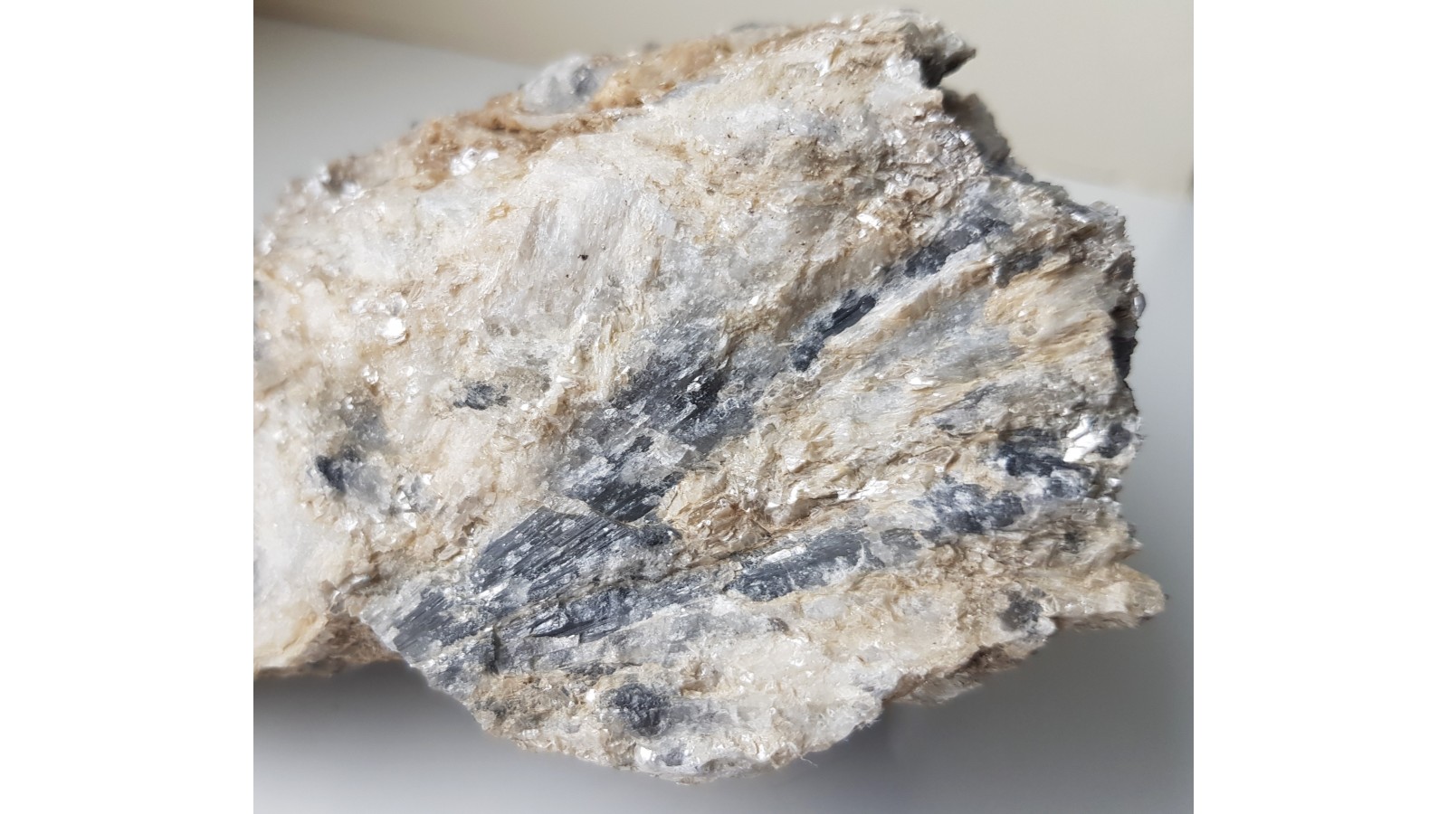 Bardzo rzadki boranokrzemian z grupy kornerupinu w postaci wrośniętych w skałę macierzystą kryształów barwy szaroniebieskawej. Skupienie wachlarzowe, promieniste kryształów. Kryształy przeświecające o połysku szklistym. Niezwykle rzadki minerał w dużych skupieniach krystalicznych. Okaz z Hasseli, Gavleborg, Szwecja. Polecam.