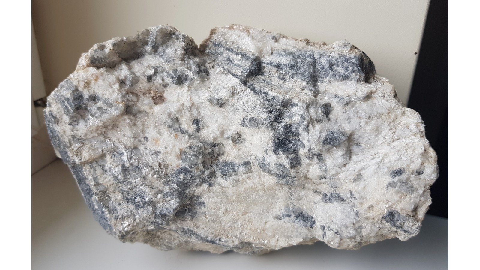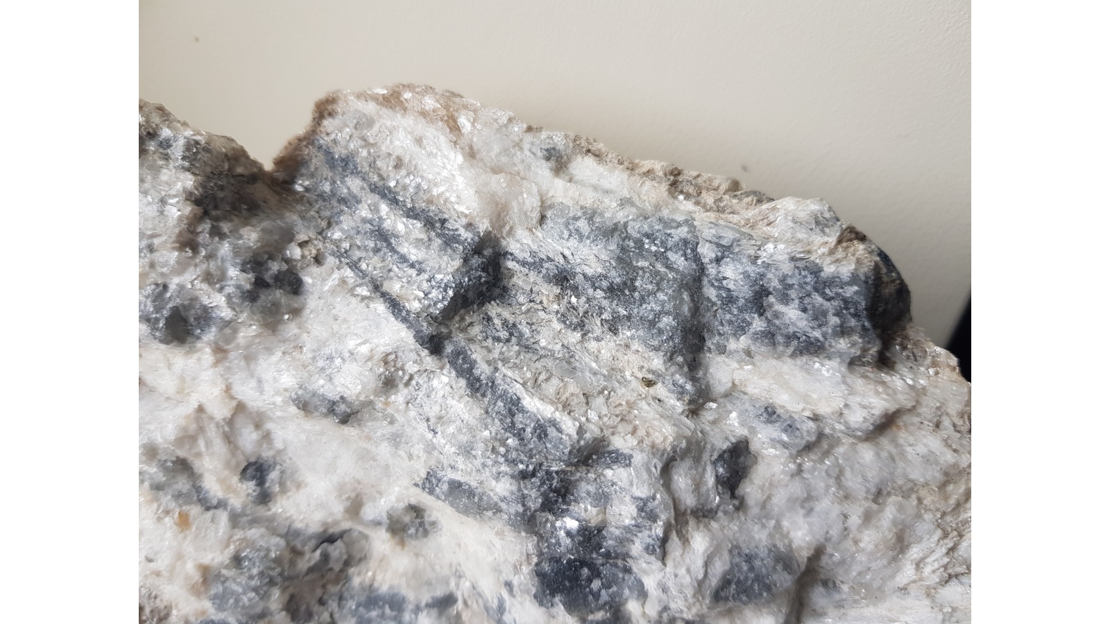 Bardzo rzadki boranokrzemian z grupy kornerupinu w postaci wrośniętych w skałę macierzystą kryształów barwy szaroniebieskawej. Skupienie wachlarzowe, promieniste kryształów. Kryształy przeświecające o połysku szklistym. Niezwykle rzadki minerał w dużych skupieniach krystalicznych. Okaz z Hasseli, Gavleborg, Szwecja. Polecam.