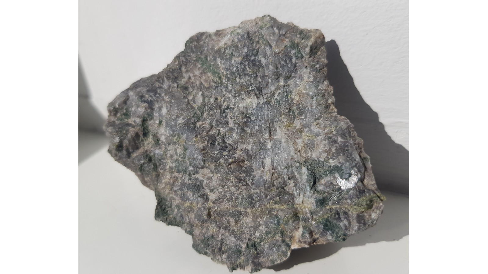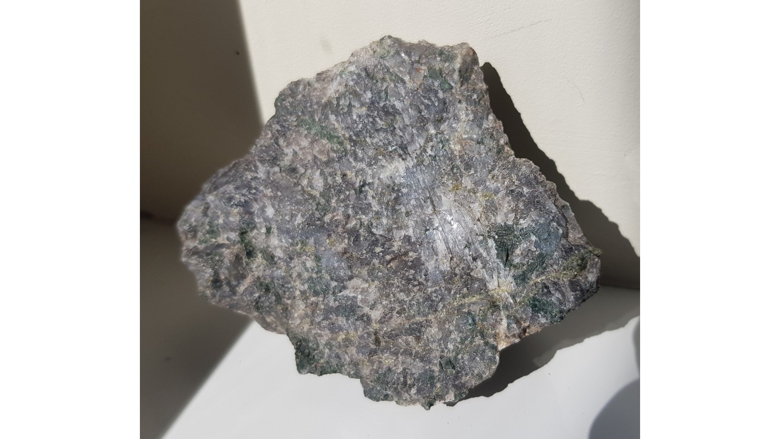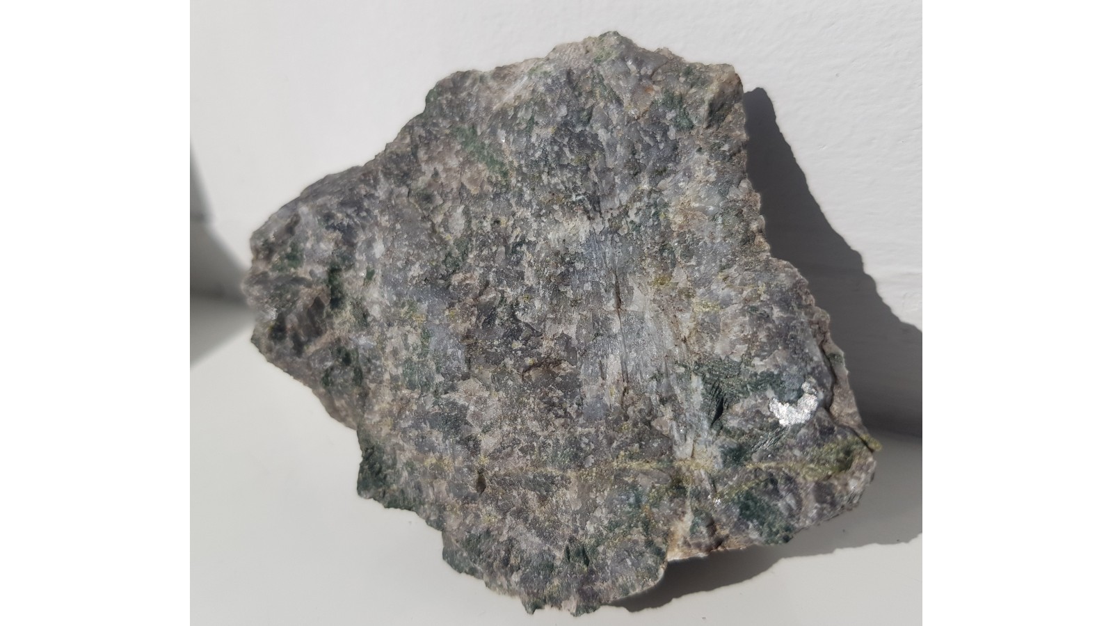 Skapolit w skarnie ze Szwecji (Svappavaara). Skapolit krystaliczny, widoczne duże, masywne osobniki o barwie szarej (w silnym świetle nieco niebieskofioletowe) w skarnie. Powierzchnie łupliwości o połysku jedwabistym. Okaz z okolic Kiruny, ze starej kopalni miedzi. Skapolit pięknie świeci na czerwono w UV 255 nm. Rzadkość. Polecam.