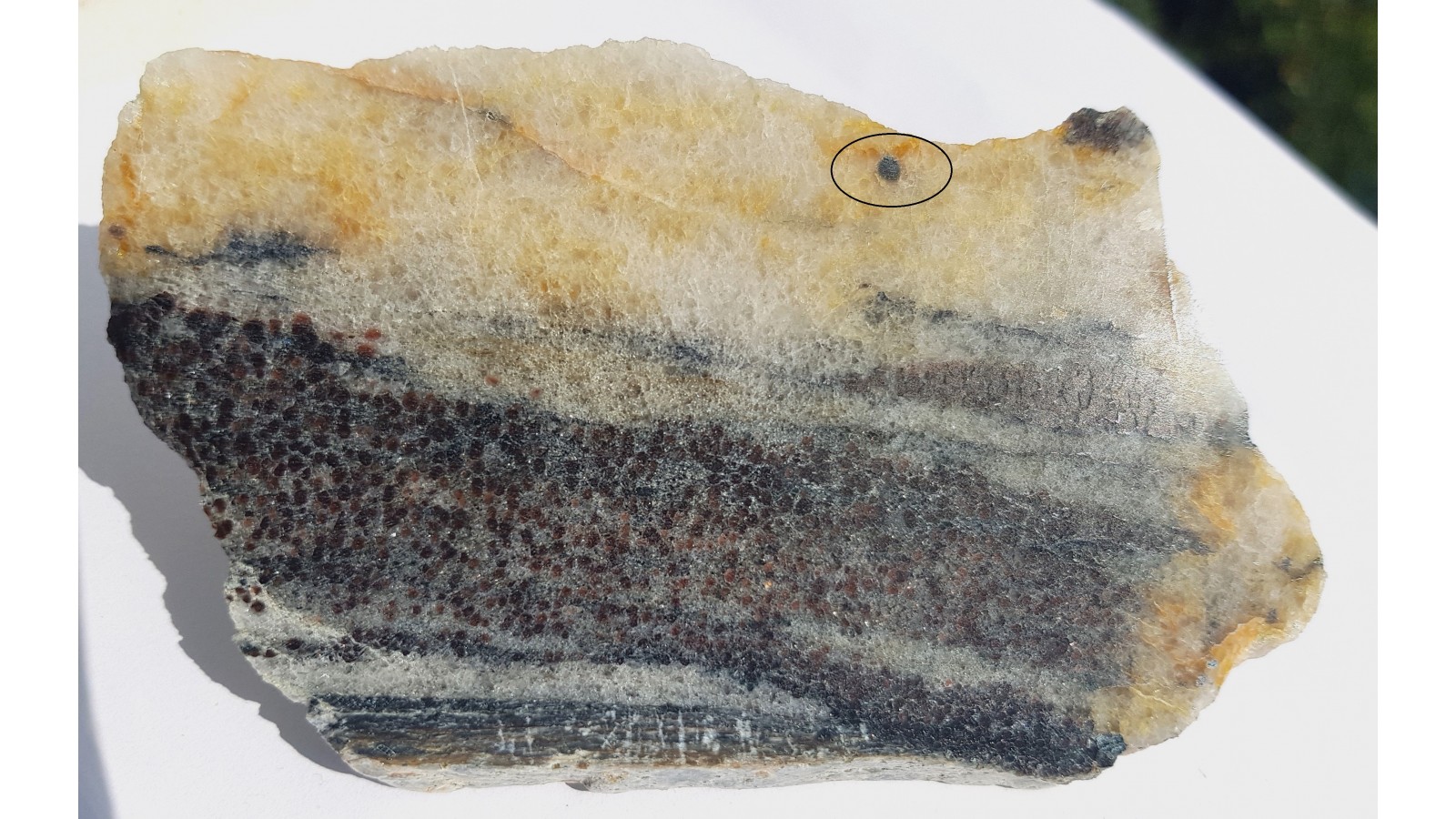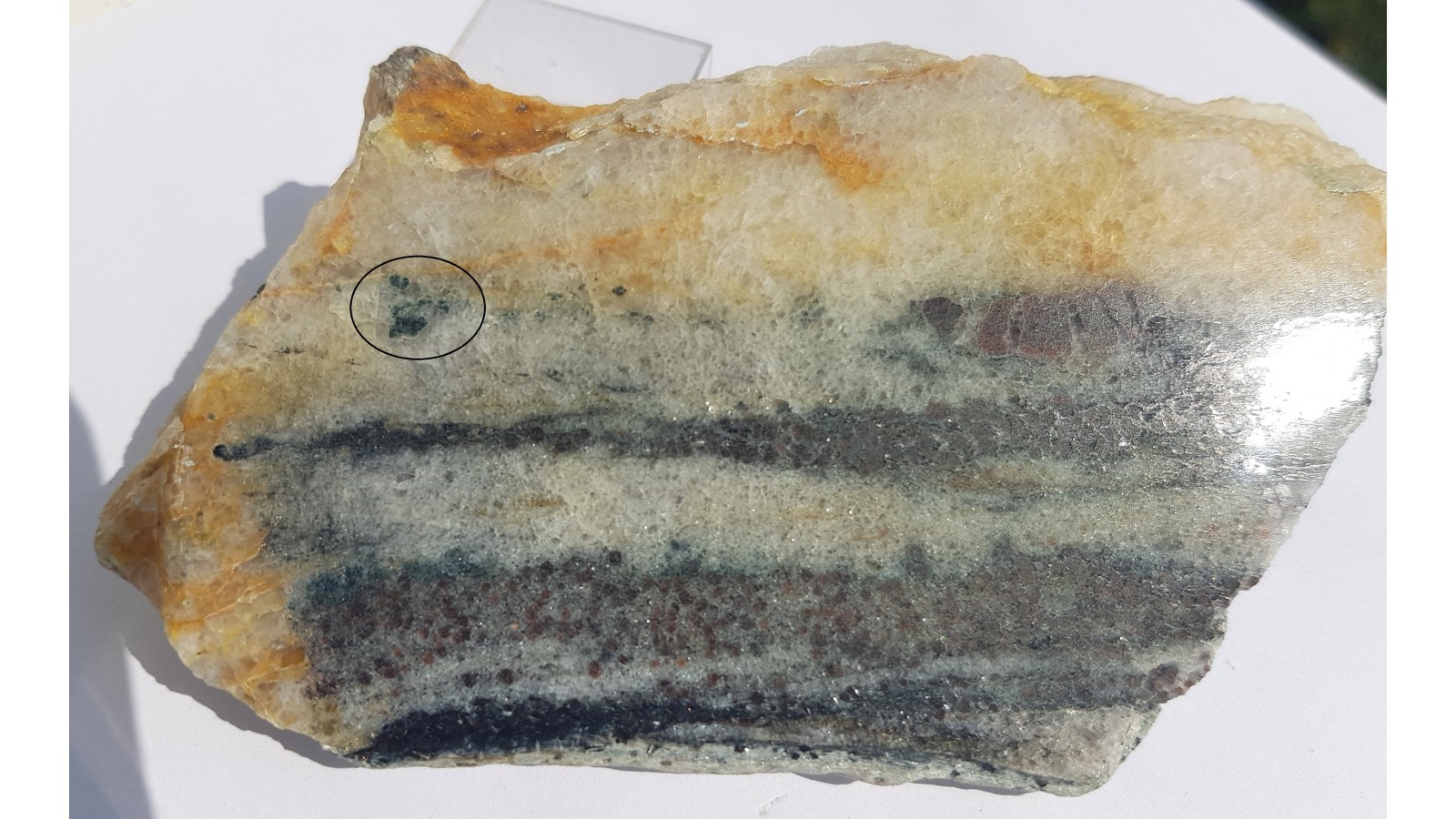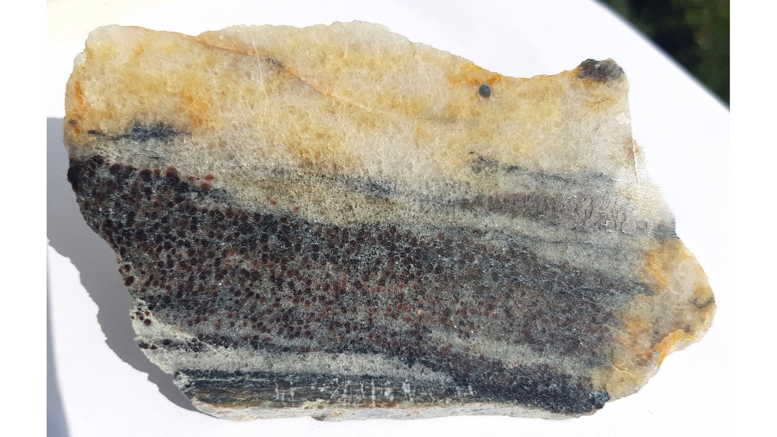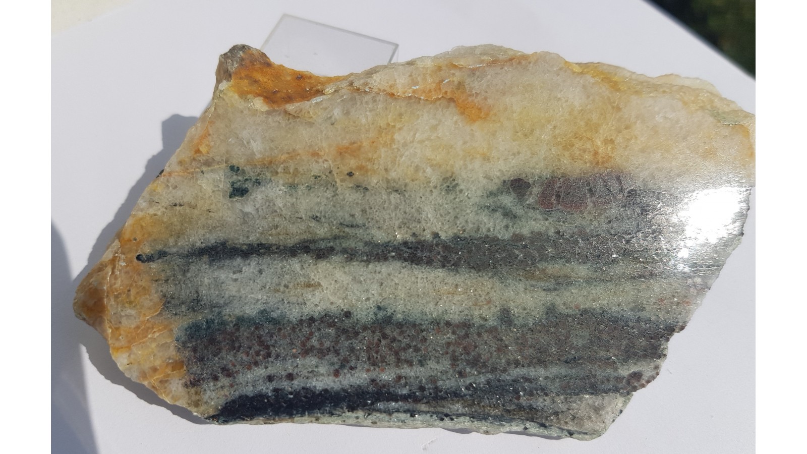 Polerowany fragment soczewki kwarcowej, w której oprócz granatów widoczne są ciemnozielone spinele cynkowe (gahnity), dosyć duże, wyraźnie widoczne na tle jasnego kwarcu. Gahnity widoczne są po obydwu stronach okazu. Rzadkość mineralogiczna Sudetów. Obydwie strony polerowane. Polecam.