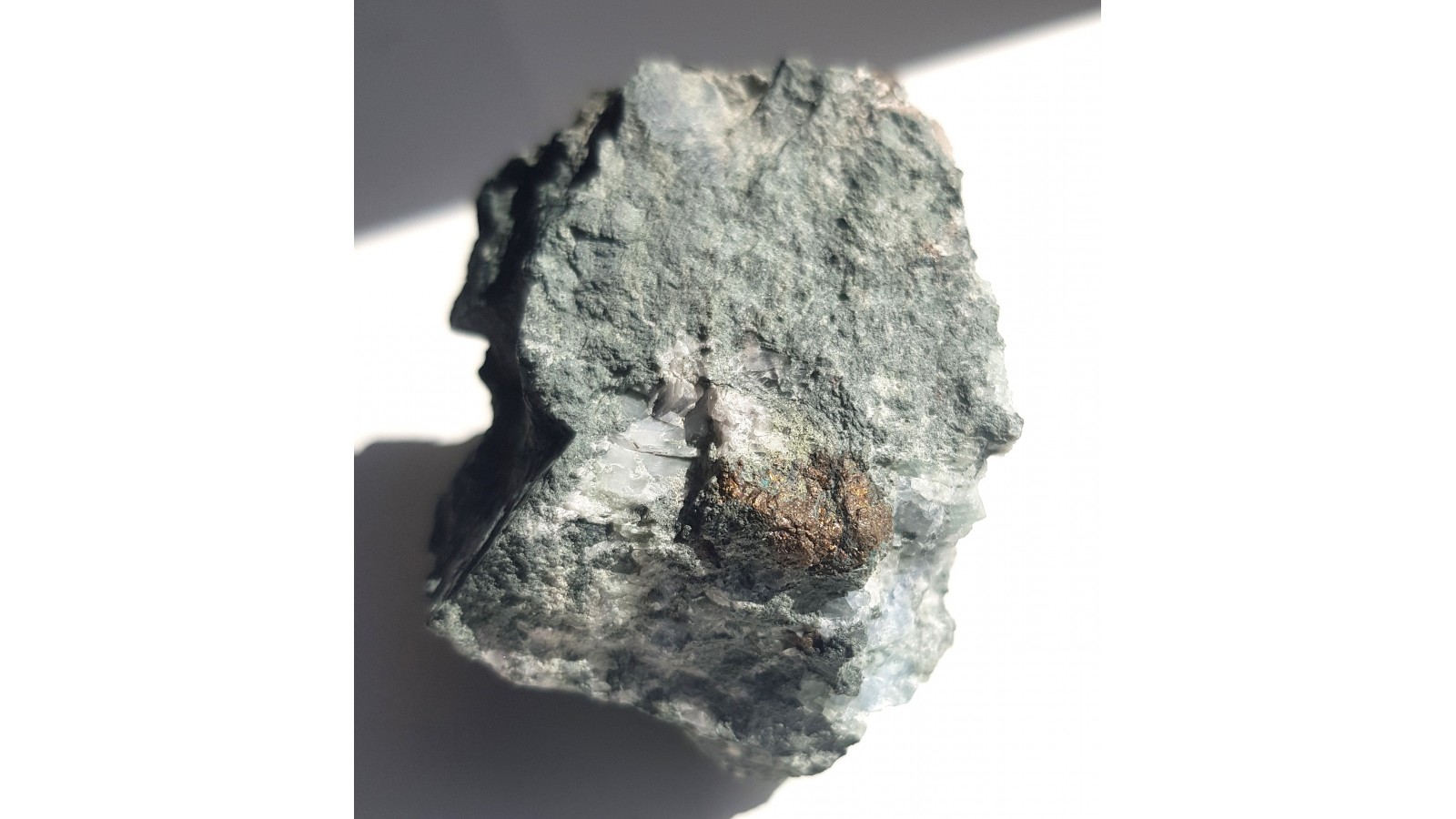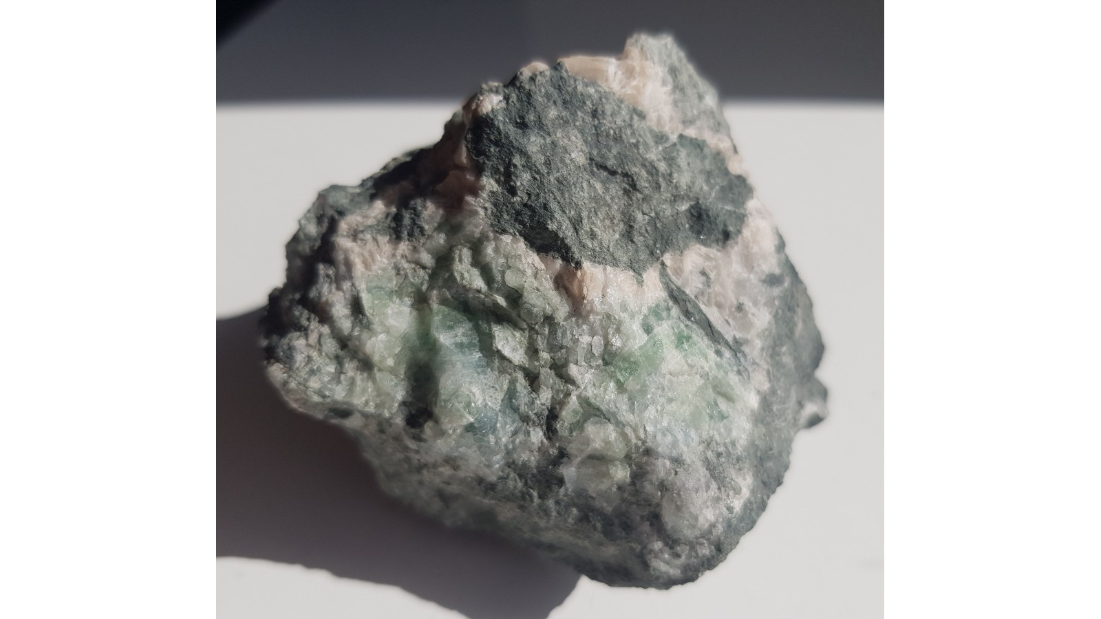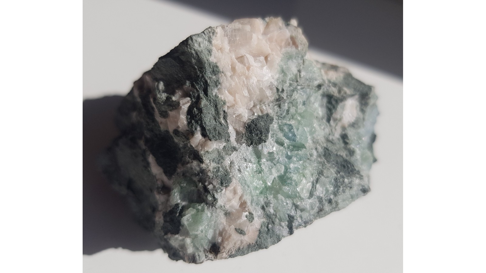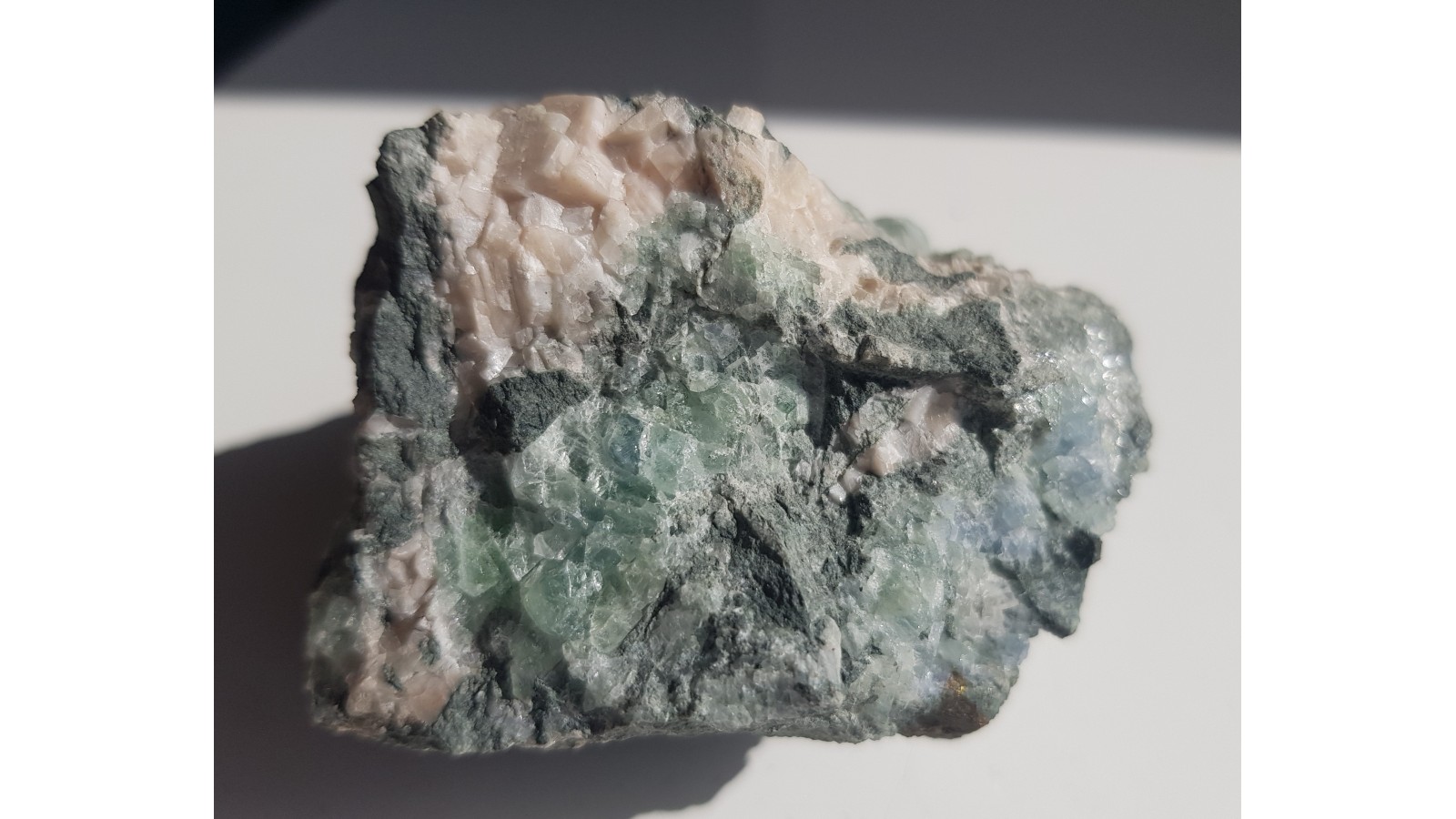 Fluoryt i kalcyt z Ciechanowic k. Janowic Wlk. Wyrazisty, zielony kolor fluorytu oraz różowy kalcytu. Całość w łupku amfibolowym. Estetyczny okaz, bez obróbki. Polecam.