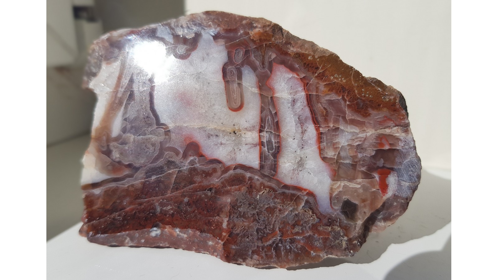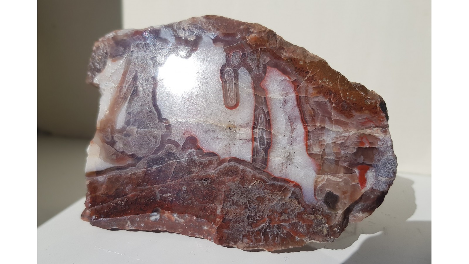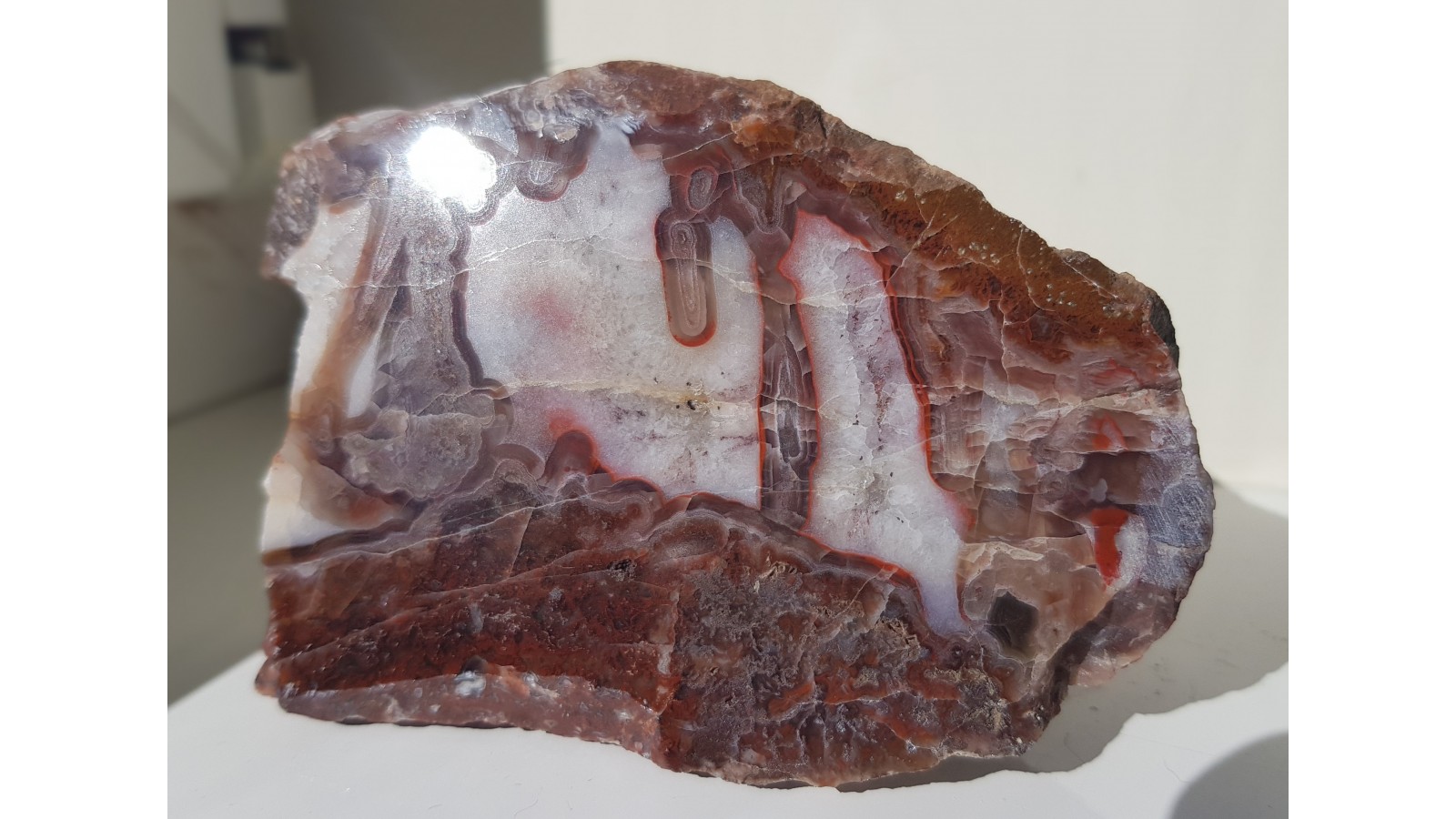 Okazały, pseudostalaktytowy agat z Suszyny k. Kłodzka. Solidny, duży okaz. Na przekroju widoczne pseudostalaktyty, kwarc oraz jaspisowa otoczka. Estetyczny i wyrazisty okaz. Strona przeciwna naturalna, nie cięta. Niezwykły okaz sprzed wielu lat. Polecam.