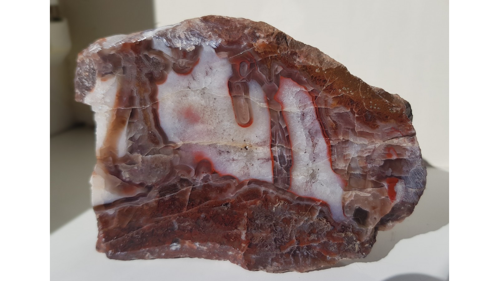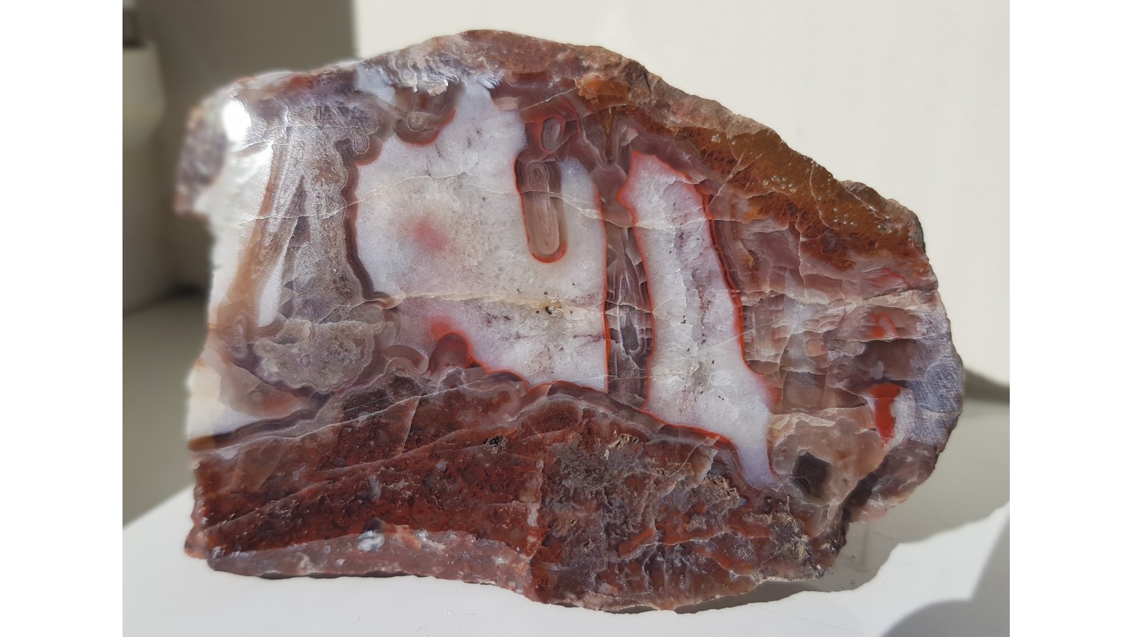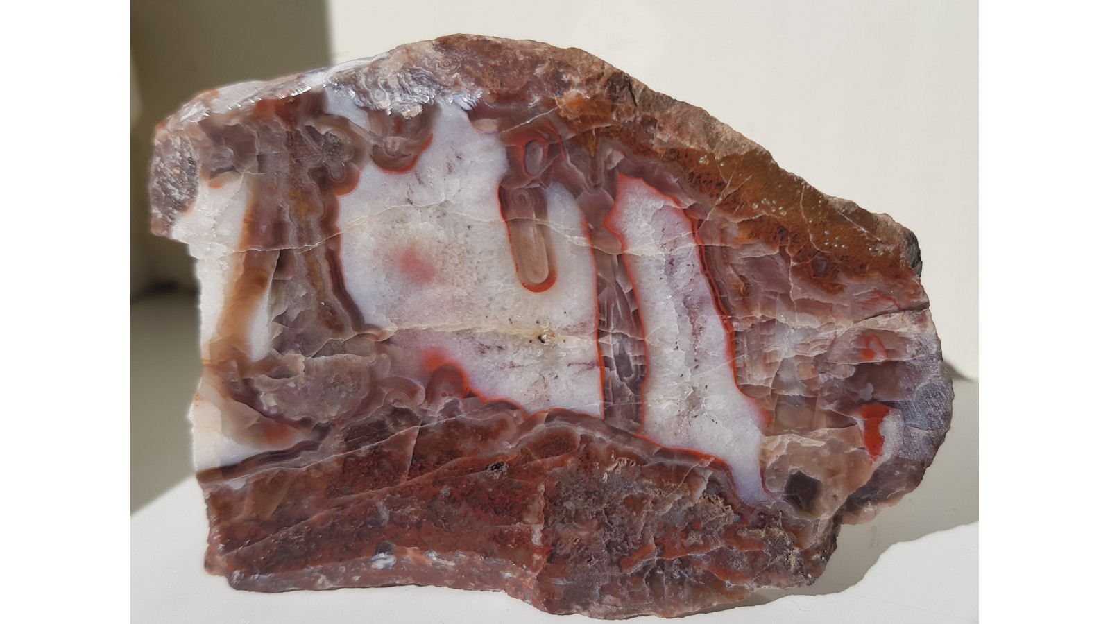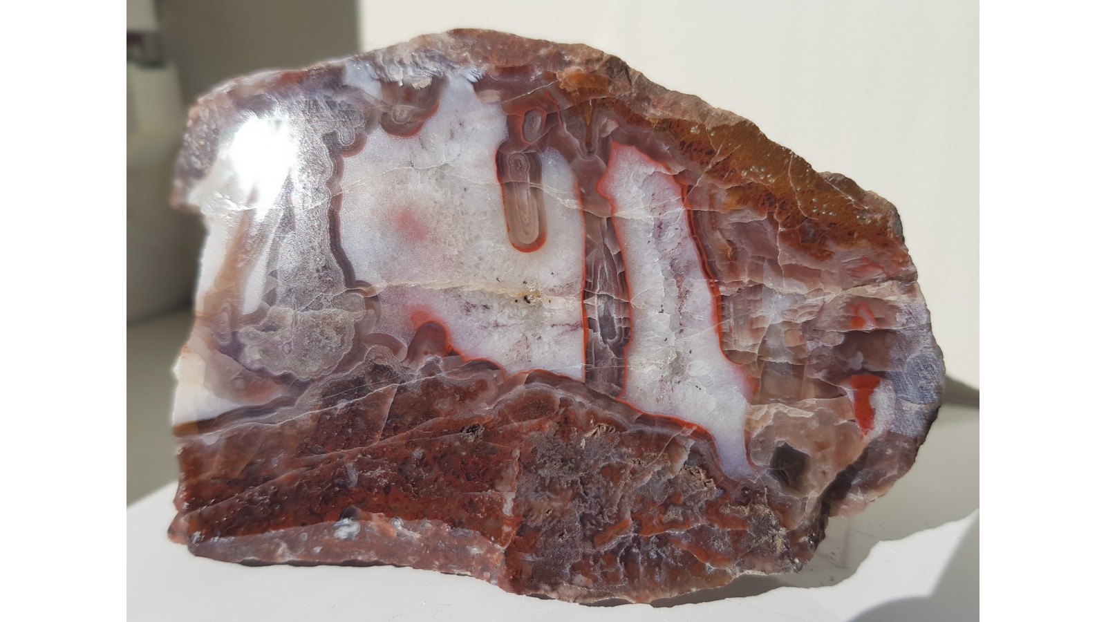 Okazały, pseudostalaktytowy agat z Suszyny k. Kłodzka. Solidny, duży okaz. Na przekroju widoczne pseudostalaktyty, kwarc oraz jaspisowa otoczka. Estetyczny i wyrazisty okaz. Strona przeciwna naturalna, nie cięta. Niezwykły okaz sprzed wielu lat. Polecam.