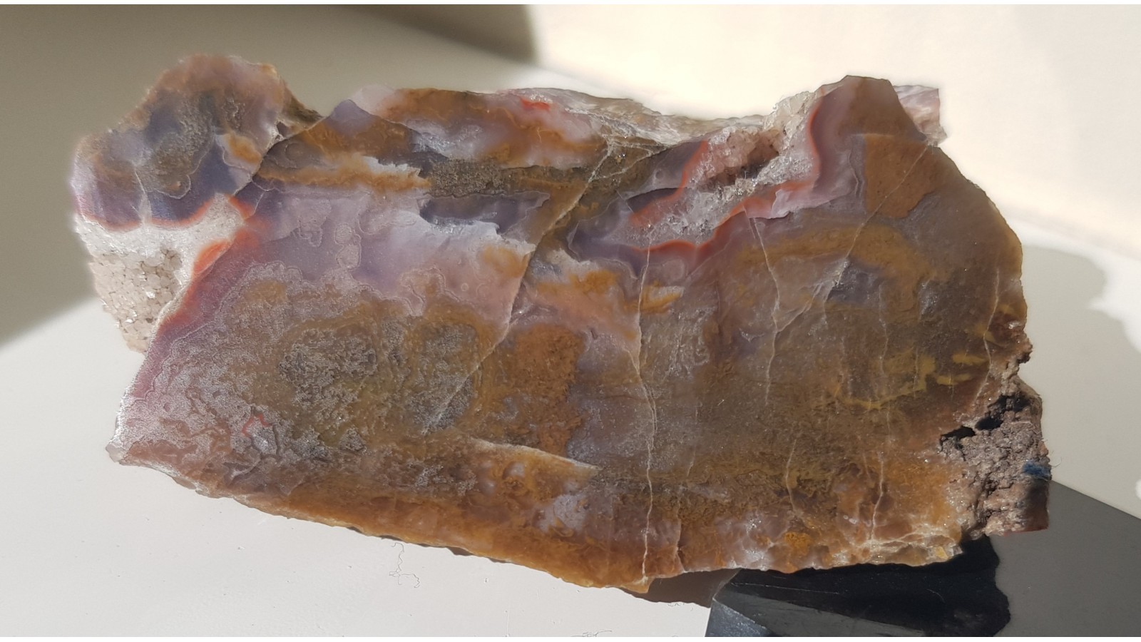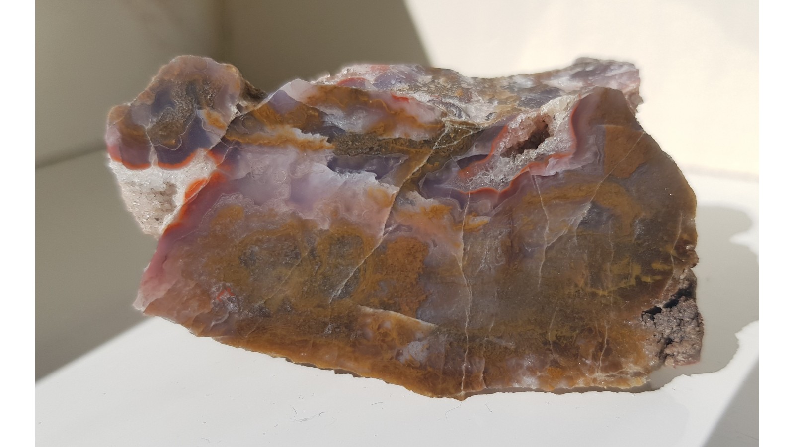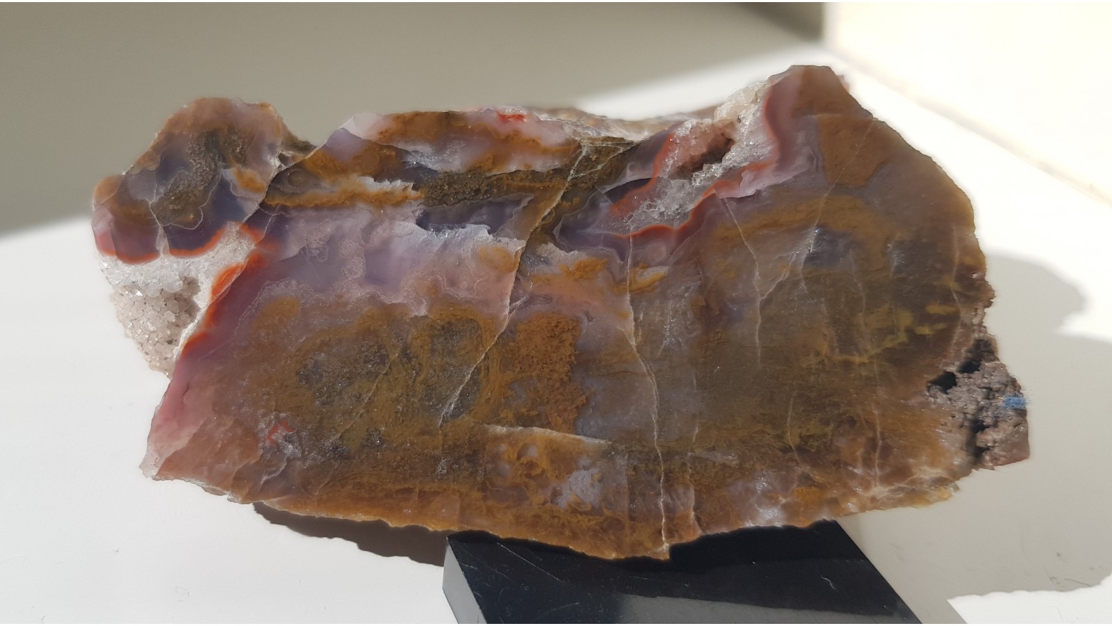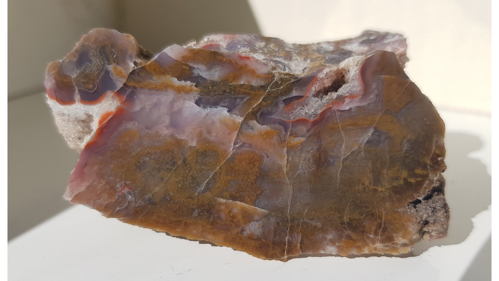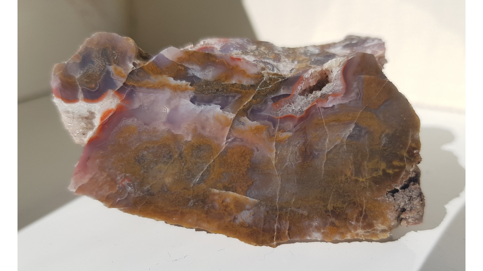 Okaz jaspisu ze strefami agatowymi z Suszyny k. Kłodzka. Wyjątkowe, piękne zabarwienie, od rudego do fioletowego i intensywnej czerwieni. Bardzo barwny i ciekawy. Strona przeciwna naturalna, nie cięta. Polecam.