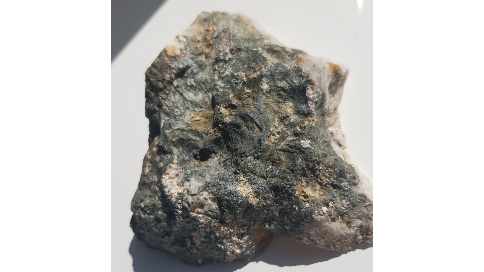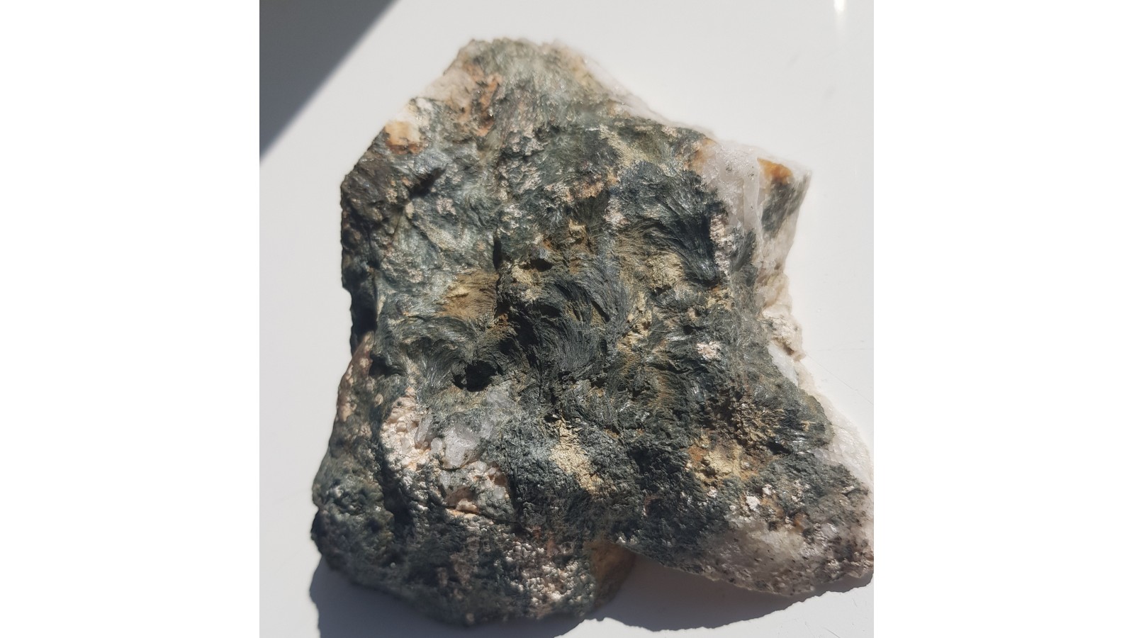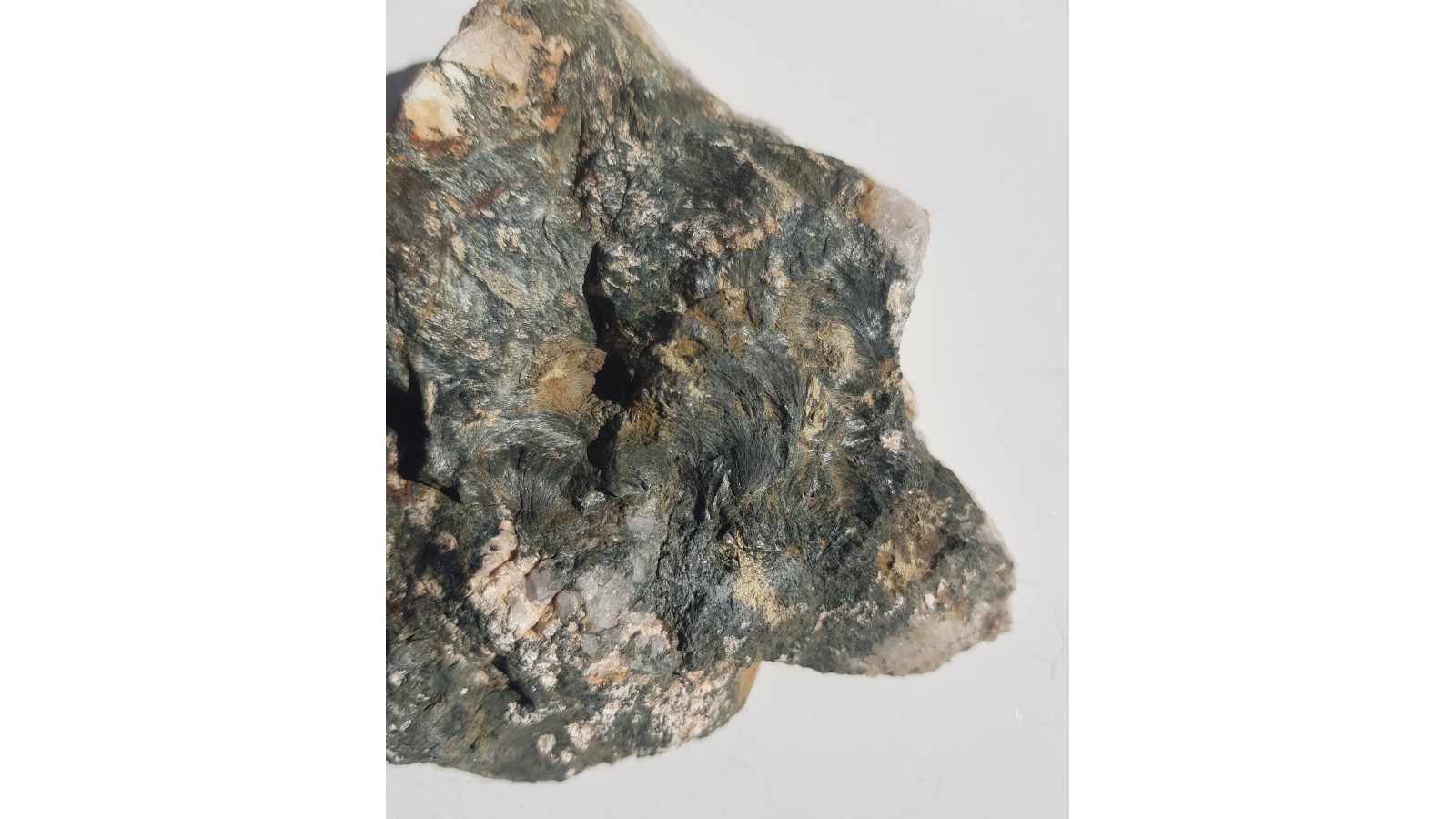 Piękny okaz wachlarzowo wykształconych skupień amfiboli z Kotliny k. Świeradowa Zdroju pochodzący dokładnie ze strefy kontaktowej leukogranitów oraz łupków chlorytowych Pasma Kamienieckiego. Okaz bez obróbki z dociętą podstawą. Polecam.