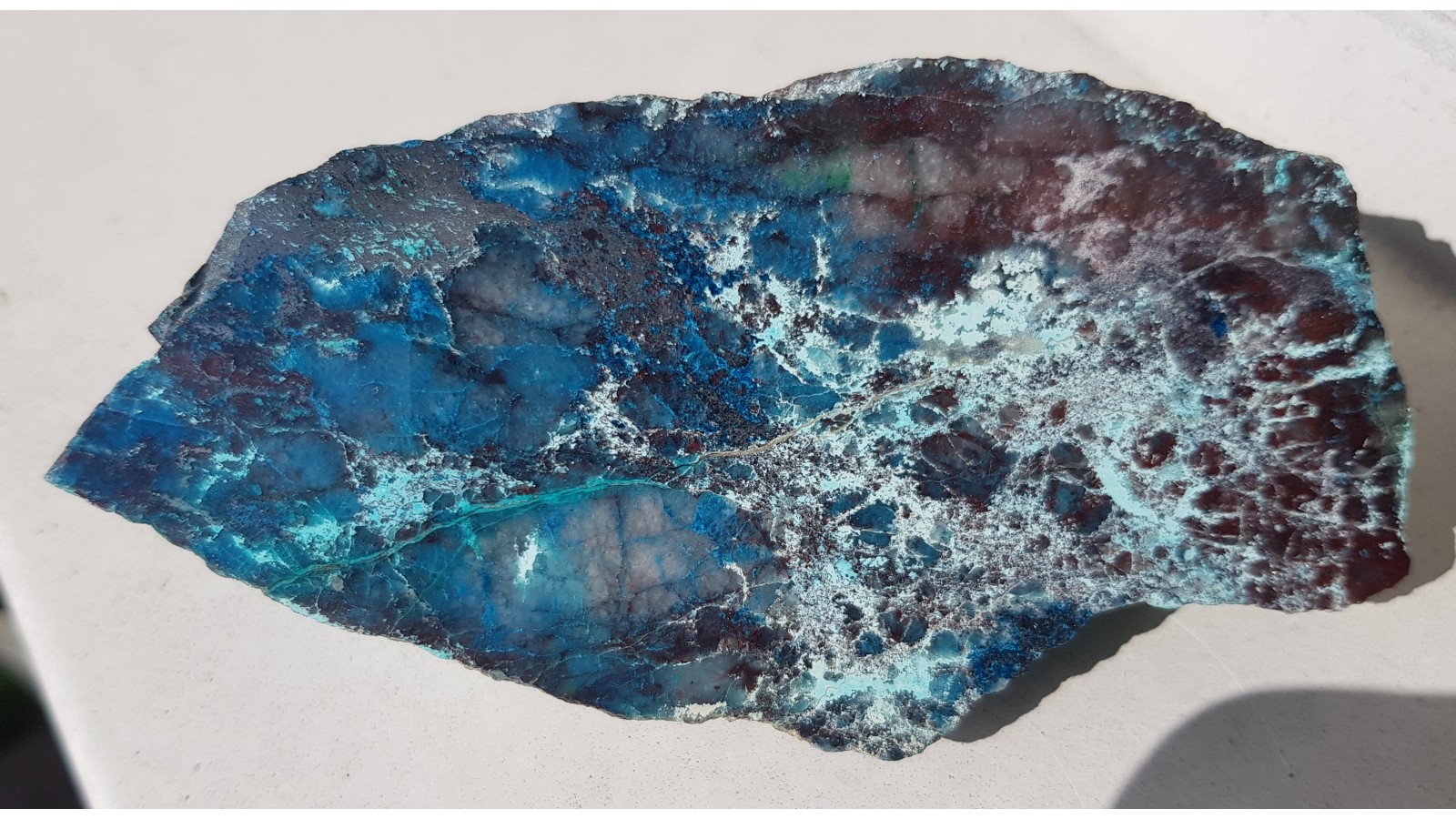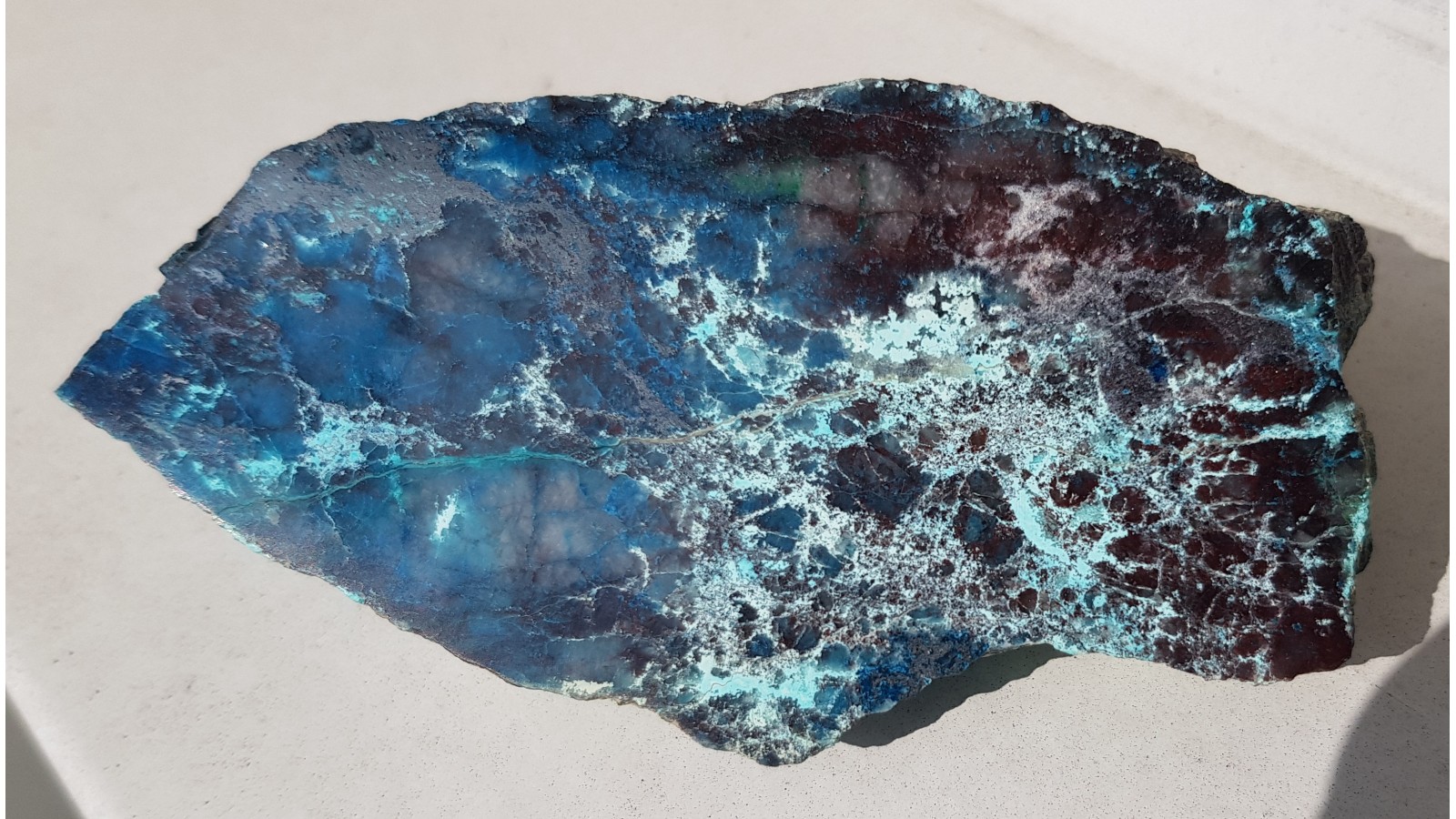 Polerowany okaz shattuckitu oraz kuprytu w bardzo bogatej rudzie miedzi i złota z Kandese w okolicach miasta Opuwo, region Kunene w północnej Namibii. Bardzo piękna ruda, masywna, przesycona krzemionką. Spektakularny okaz idealnej wielkości z bardzo bogatym, niebieskim shattuckitem. Polecam.