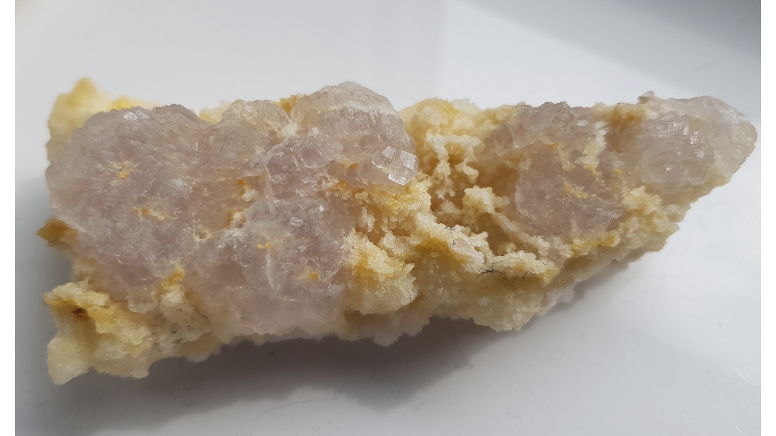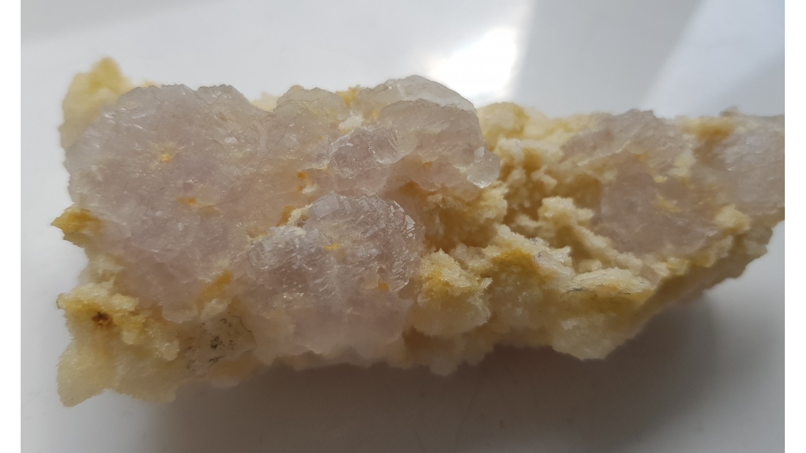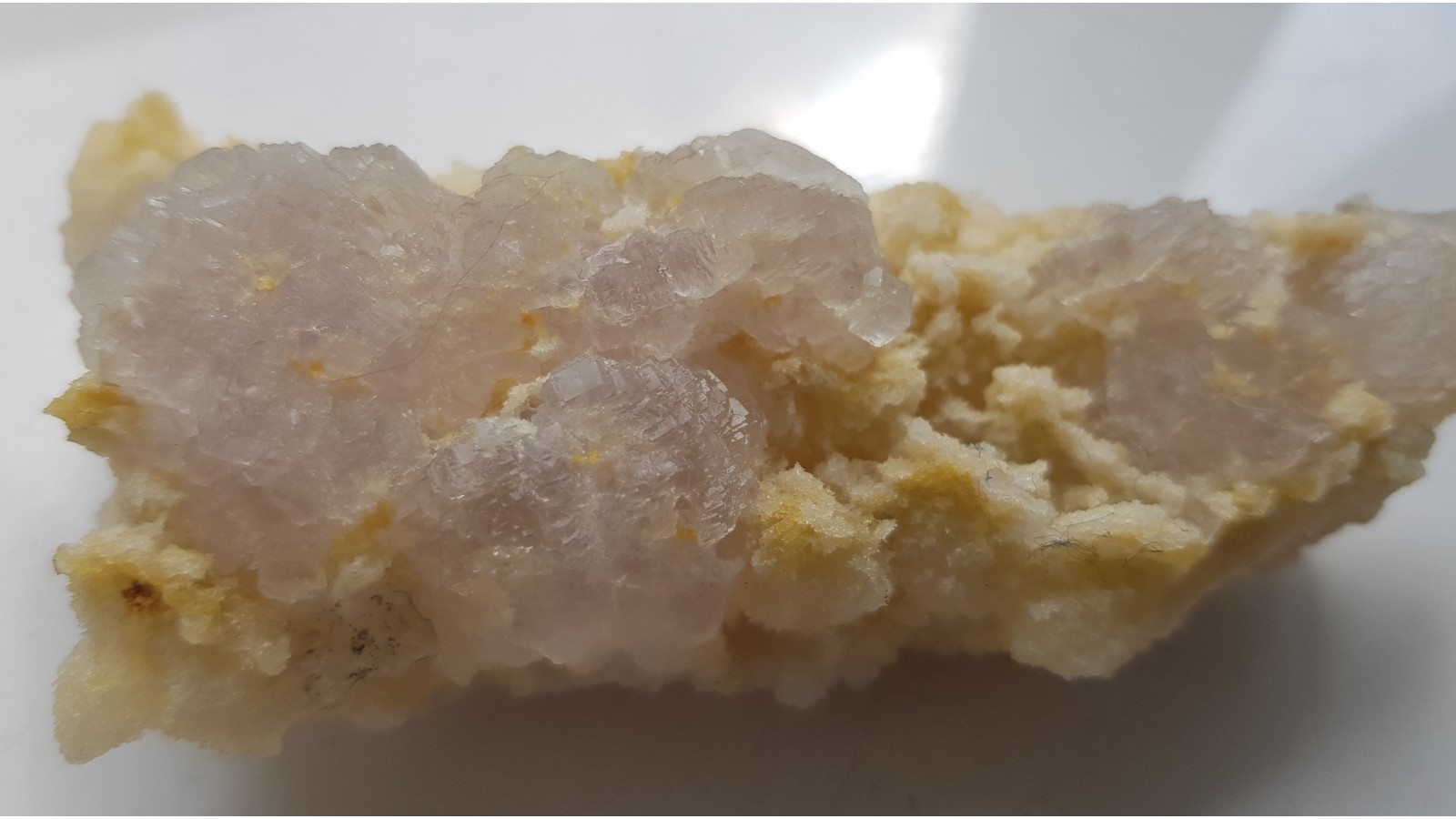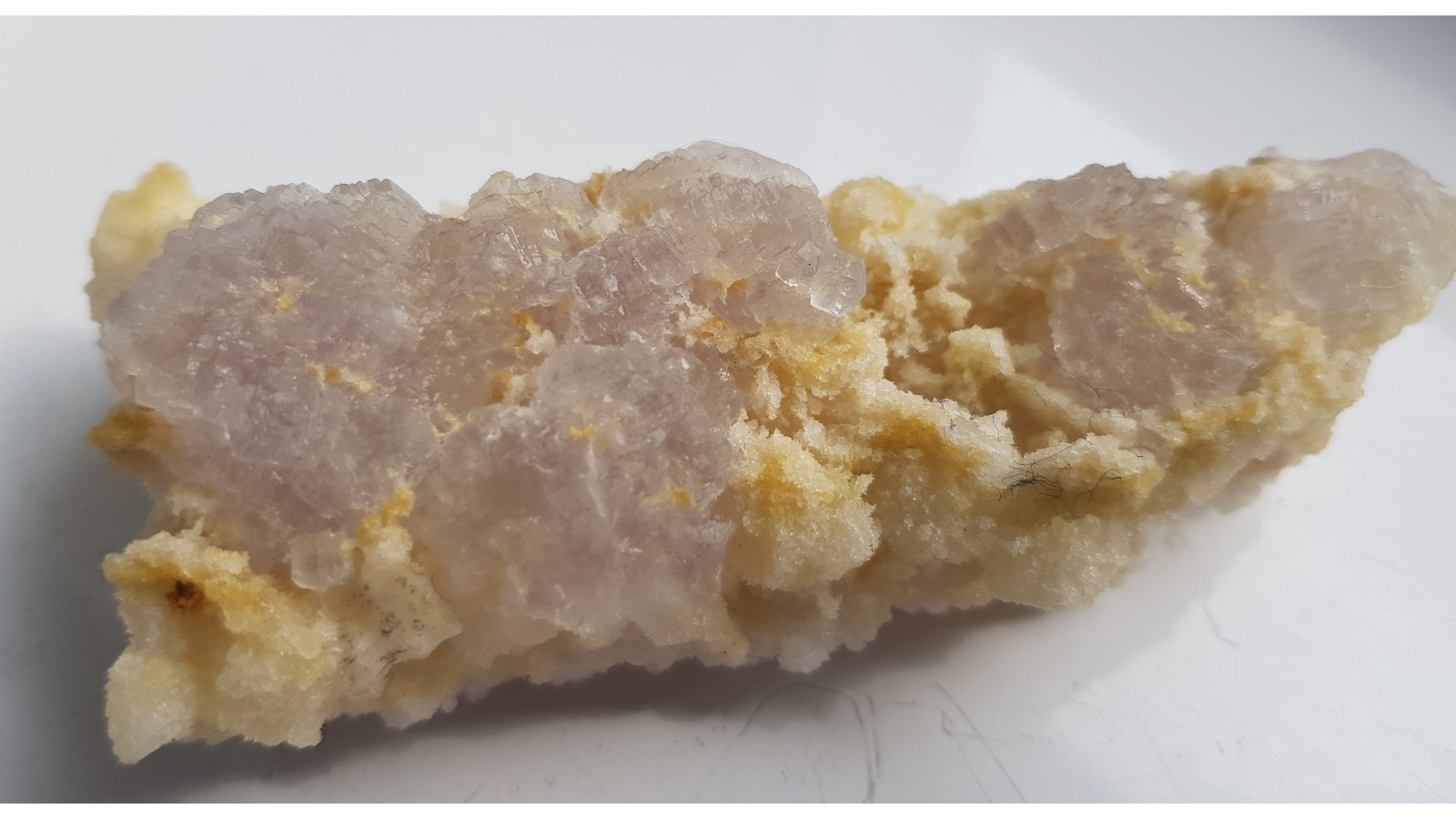 Szczotka kryształów fluorytu z kopalni Mihalkovo w Bułgarii. Wydobywane bezpośrednio ze sztolni, bez uszkodzeń, delikatnie wytrawione z pokrywy kalcytowej narastają na kwarcowym, porowatym podłożu. Okazy na mindat. Niemal bezbarwne, kryształy z dobrym połyskiem, całość bardzo estetyczna i widowiskowa. Polecam.