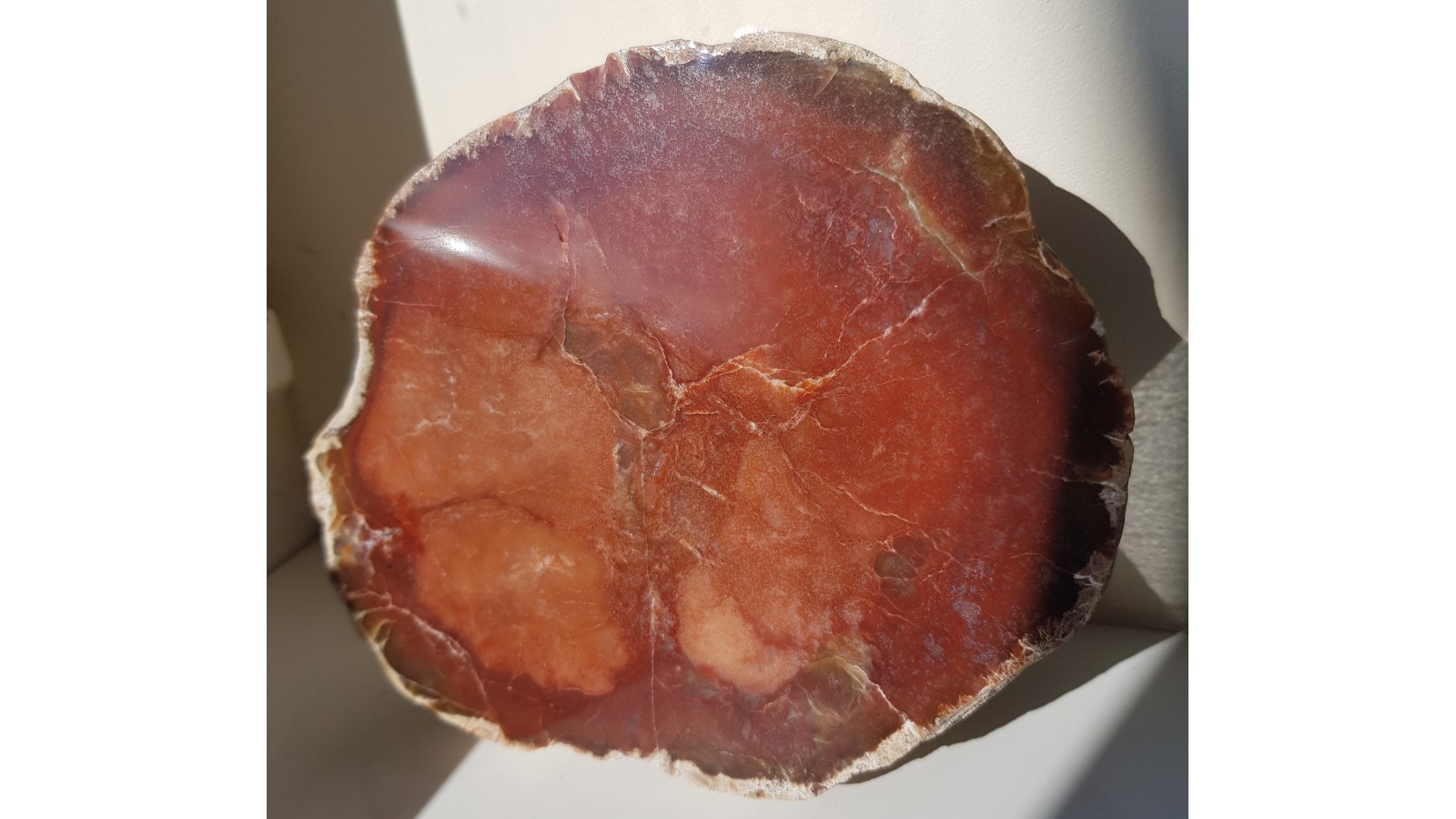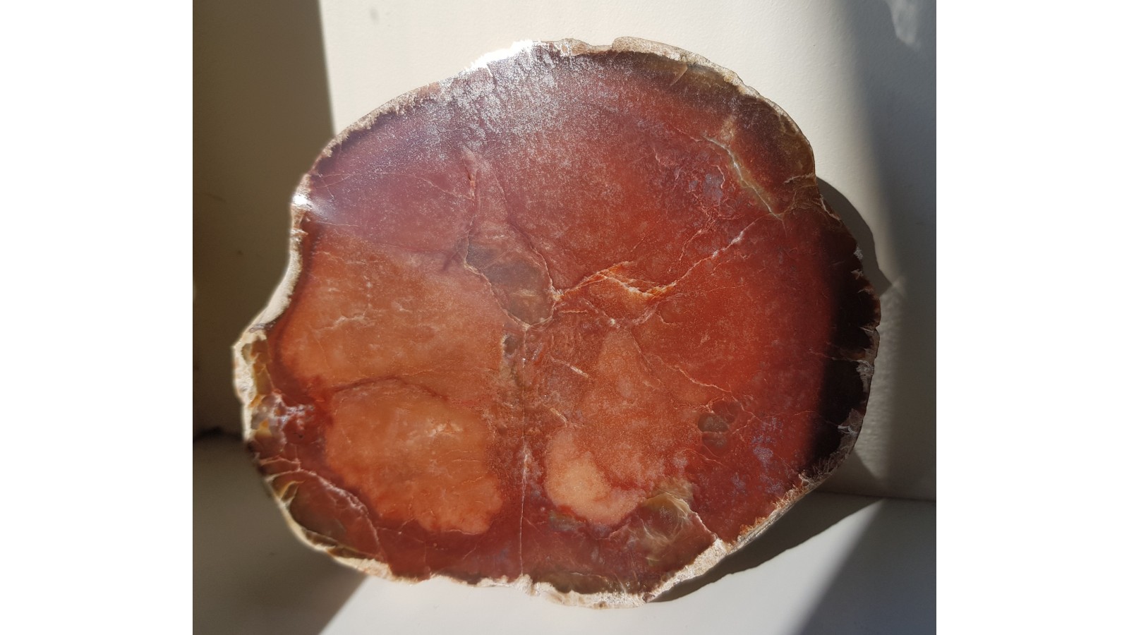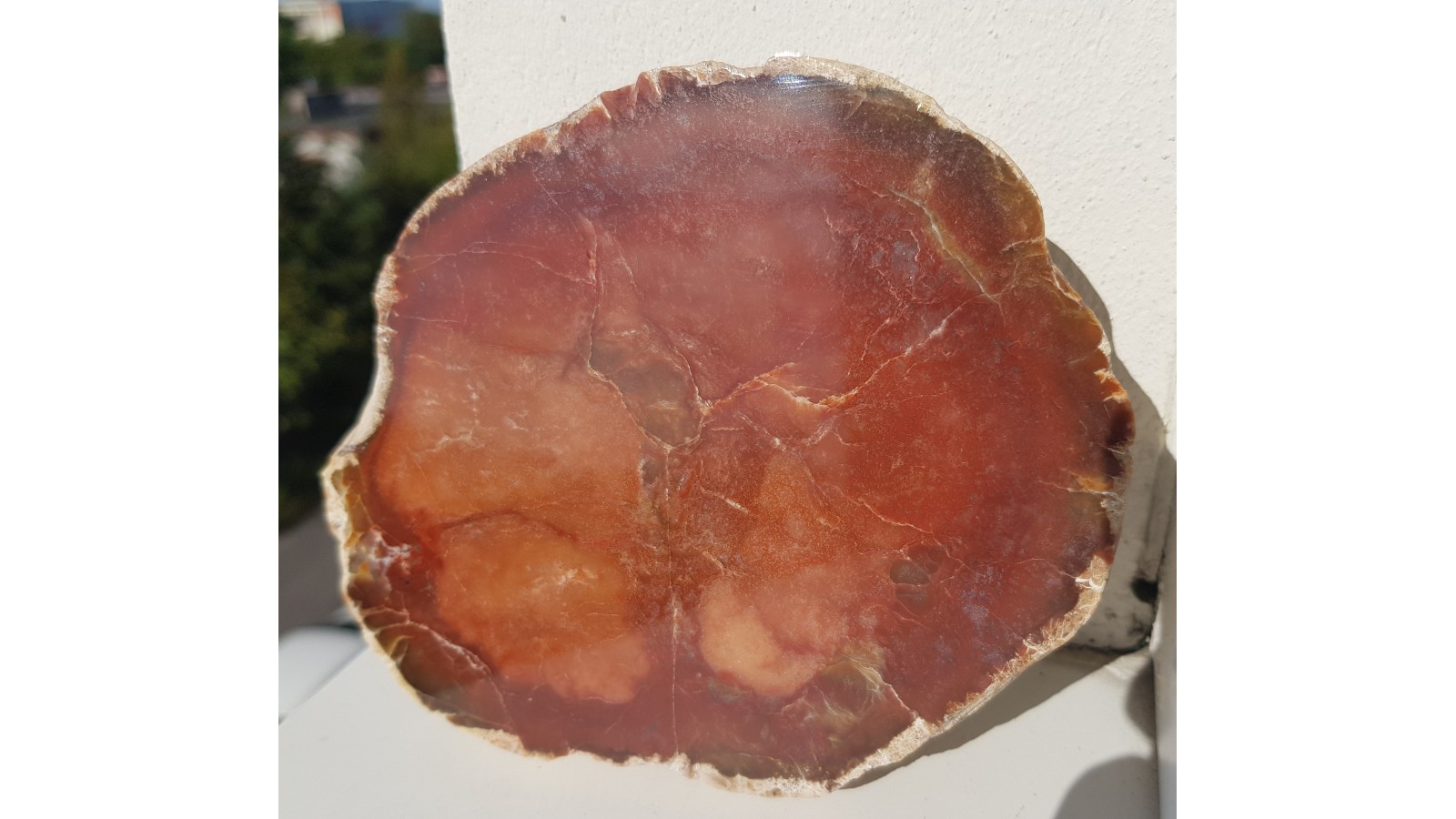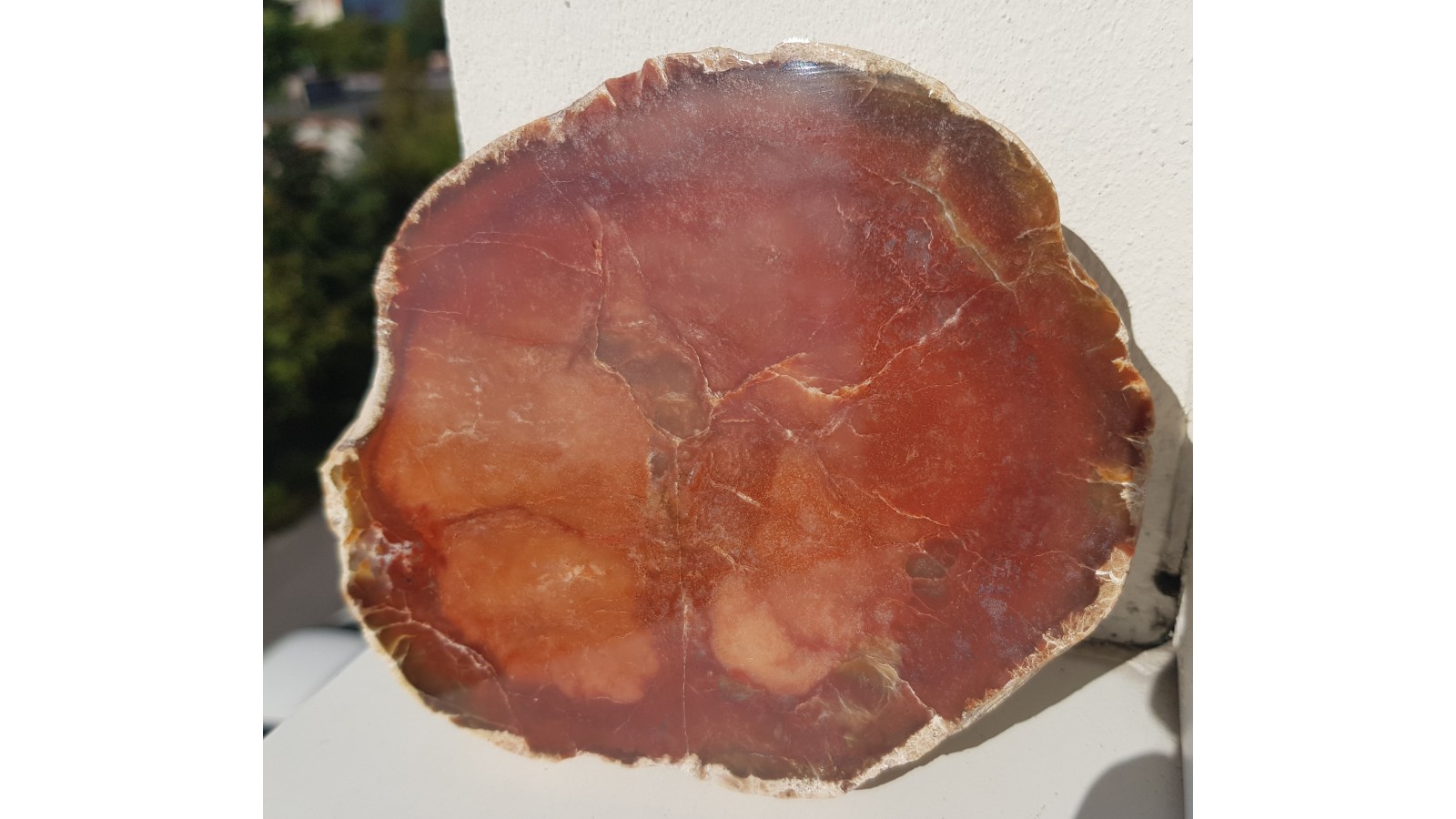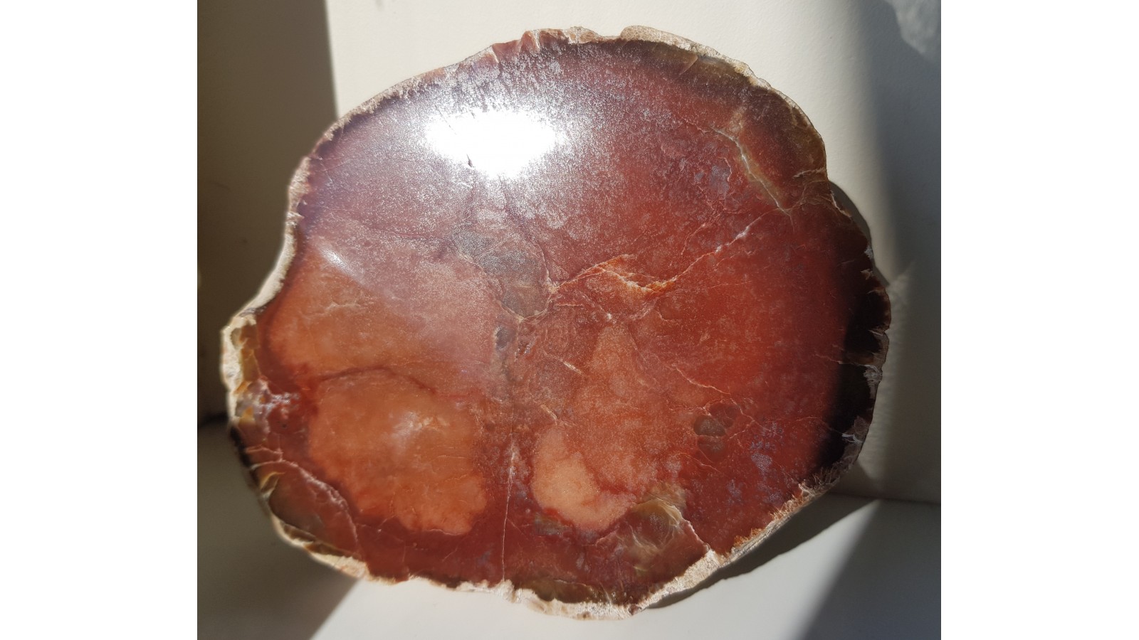 Duża konkrecja chalcedonowa czerwonej barwy. Piękny poler. Strona tylna naturalna, nie cięta. Okaz pochodzi z aluwiów Nysy Kłodzkiej, ze zbiornika Pilce. Duży i spektakularny. Polecam.