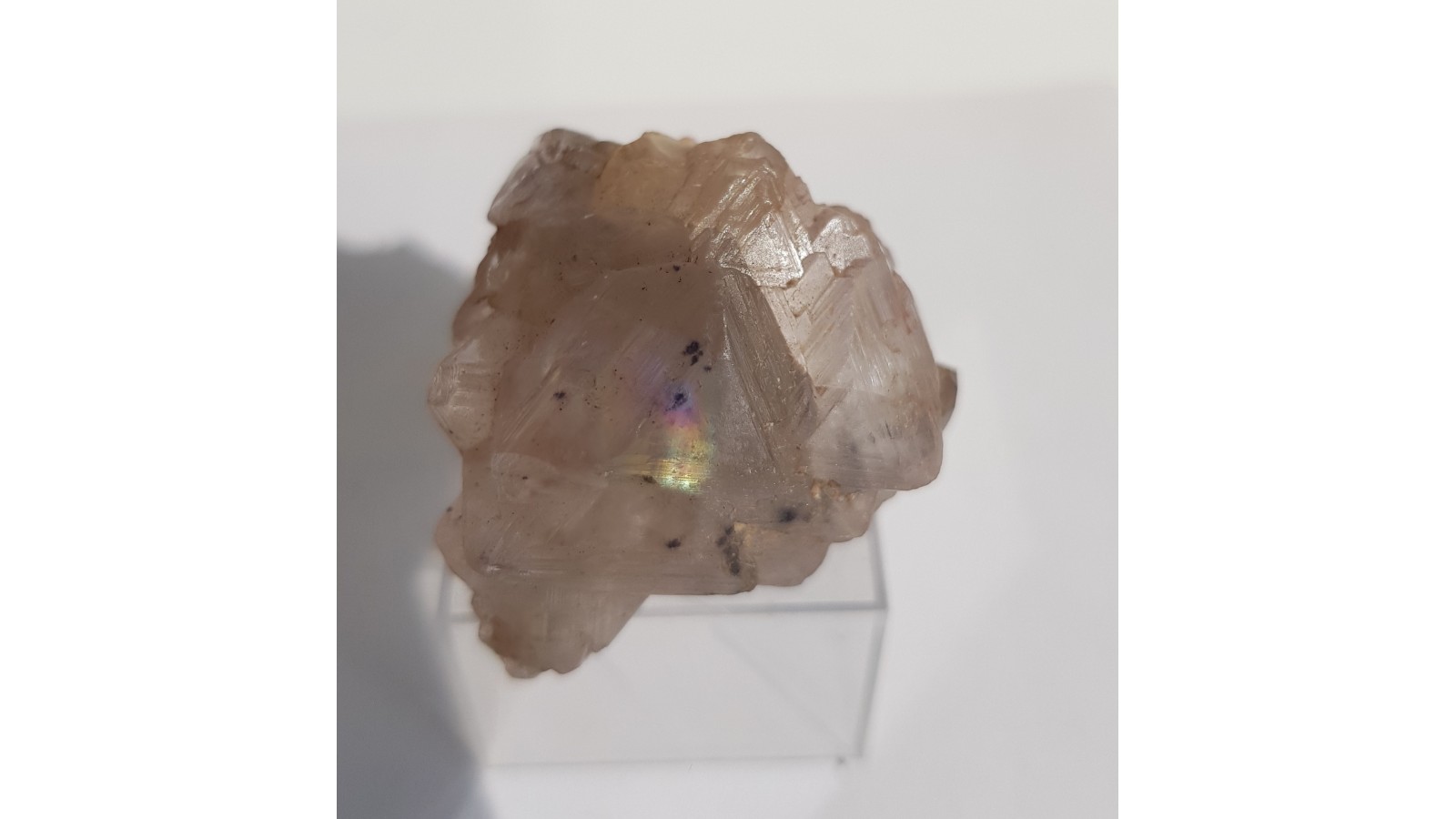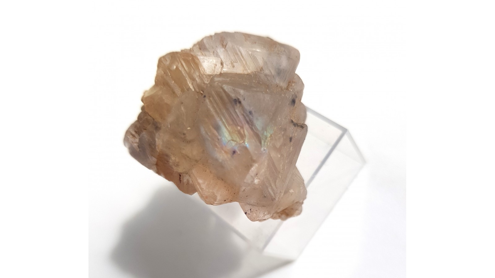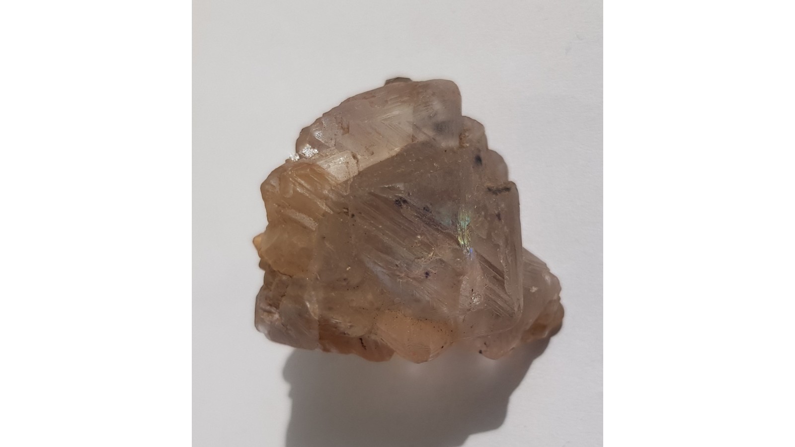 Idealnie wykształcony fluoryt ze Strzegomia, zrost prawidłowy kilku kryształów. Bez żadnych uszkodzeń. Na spodzie nieco skalenia oraz mały kwarc dymny. Niemal bezbarwny, z połyskiem na ścianach. Idealna forma krystalograficzna, masywny. Polecam.