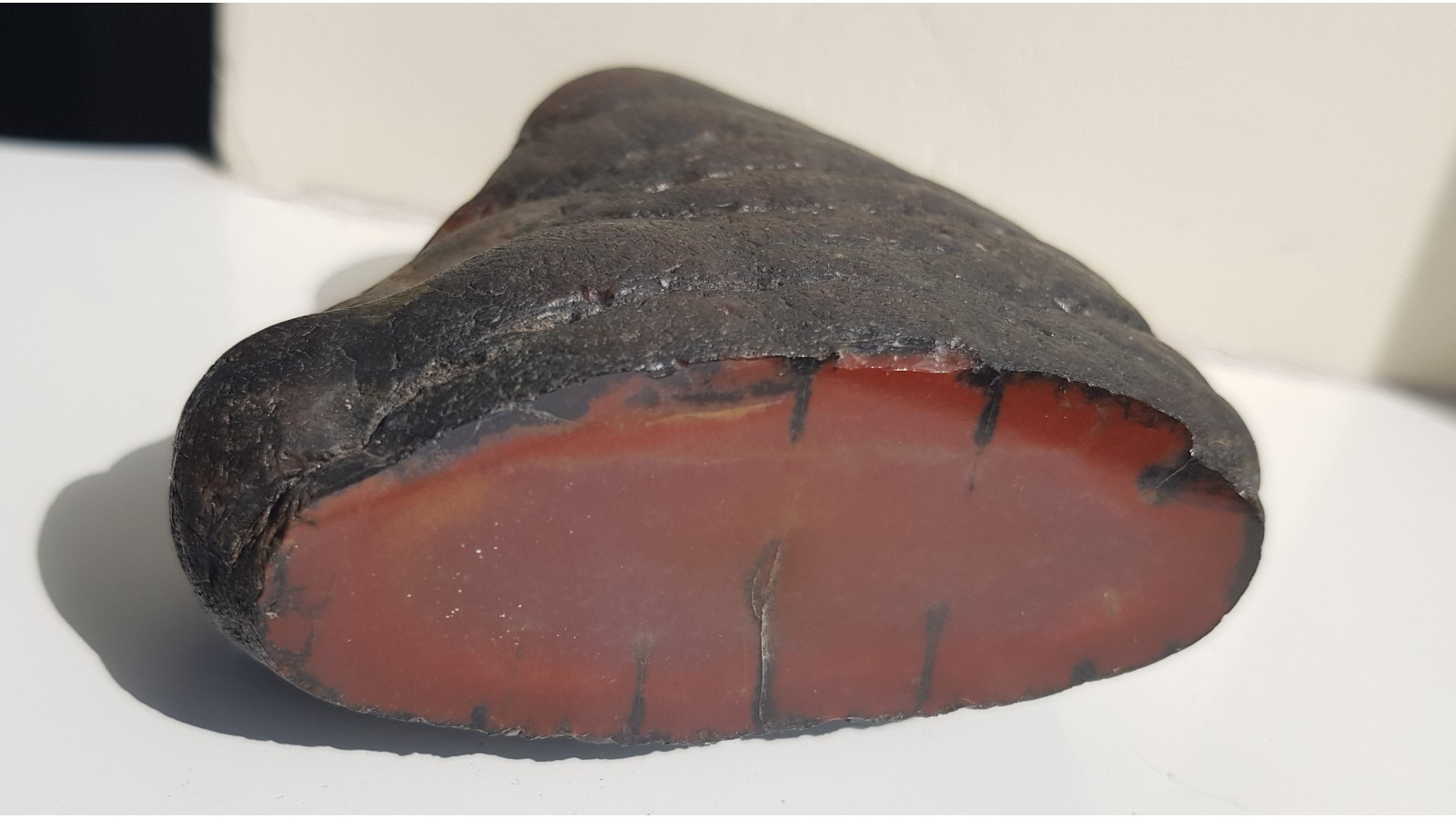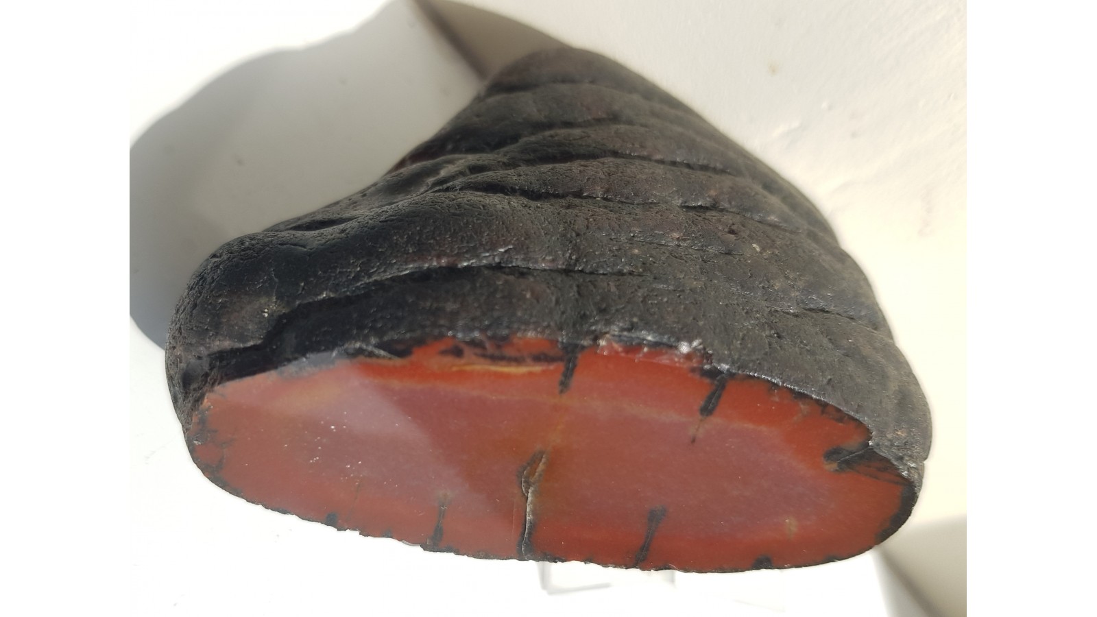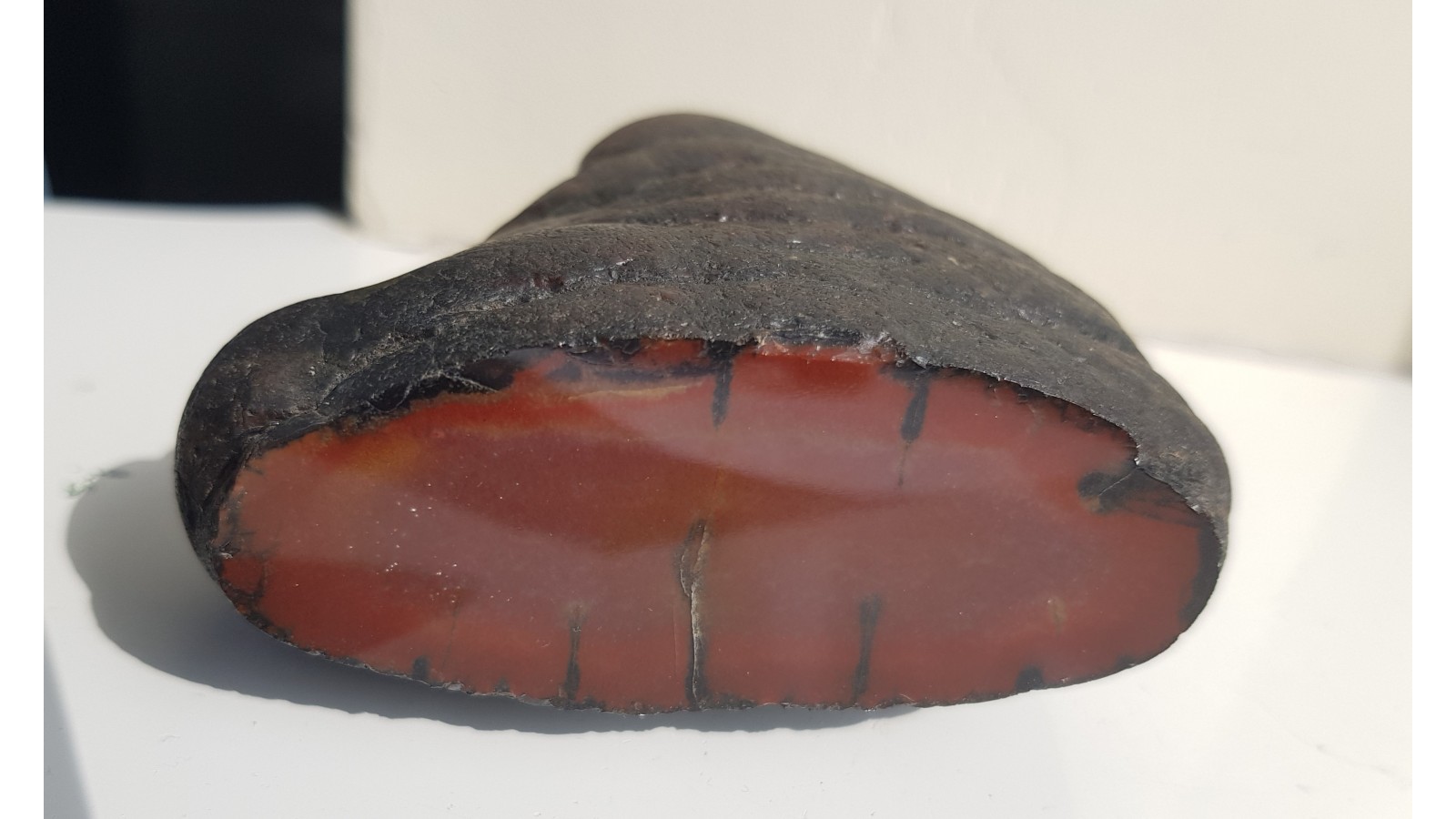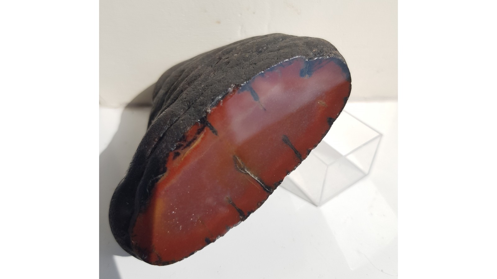 Bardzo estetyczna konkrecja chalcedonowa czerwonej barwy. Piękny poler. Strona tylna naturalna, nie cięta. Okaz pochodzi z aluwiów Nysy Kłodzkiej, ze zbiornika Pilce. Wyjątkowy okaz. Polecam.