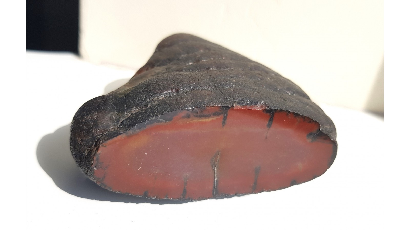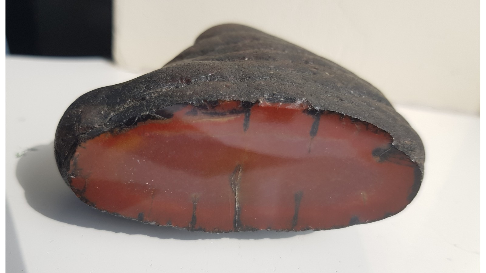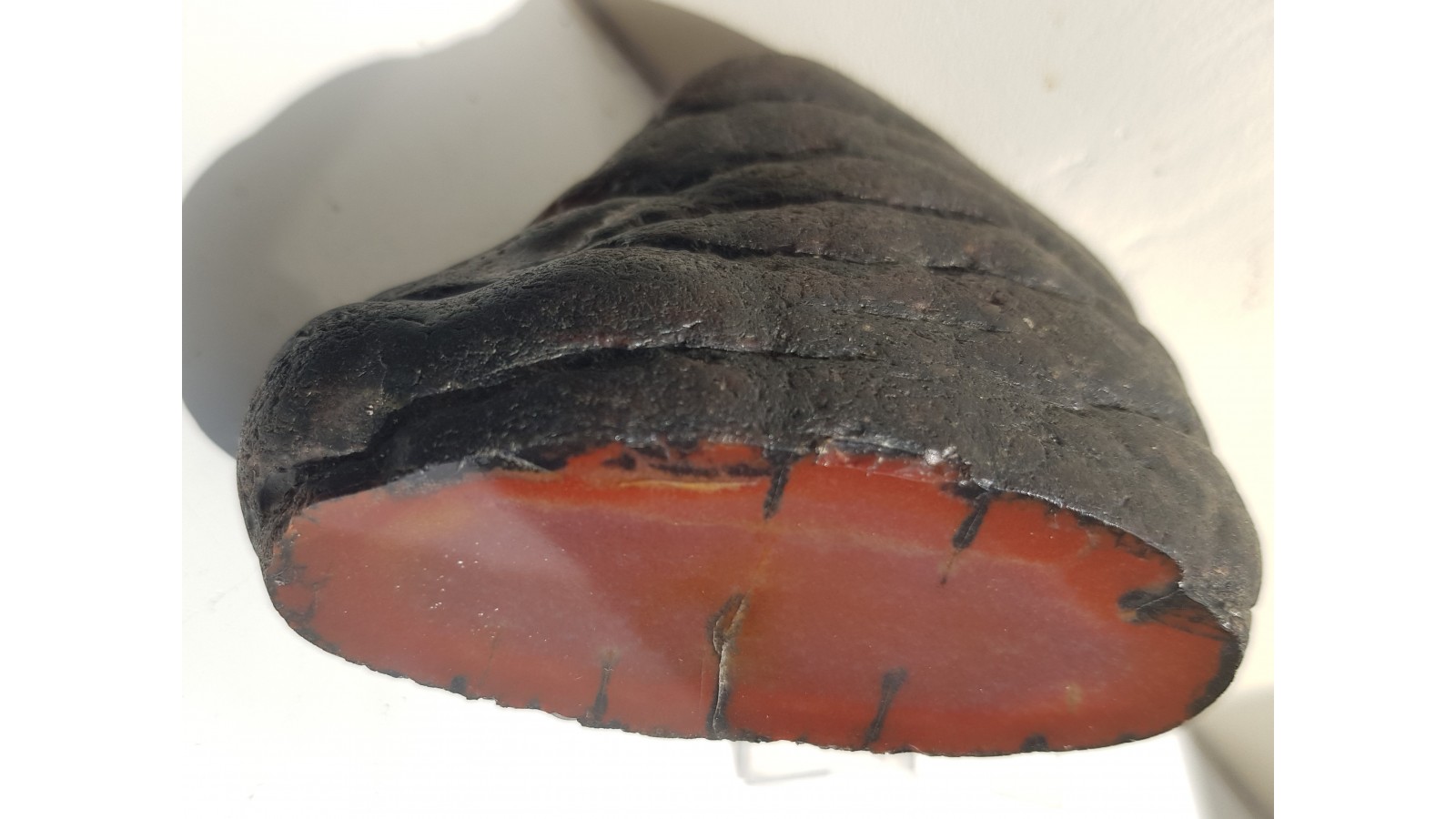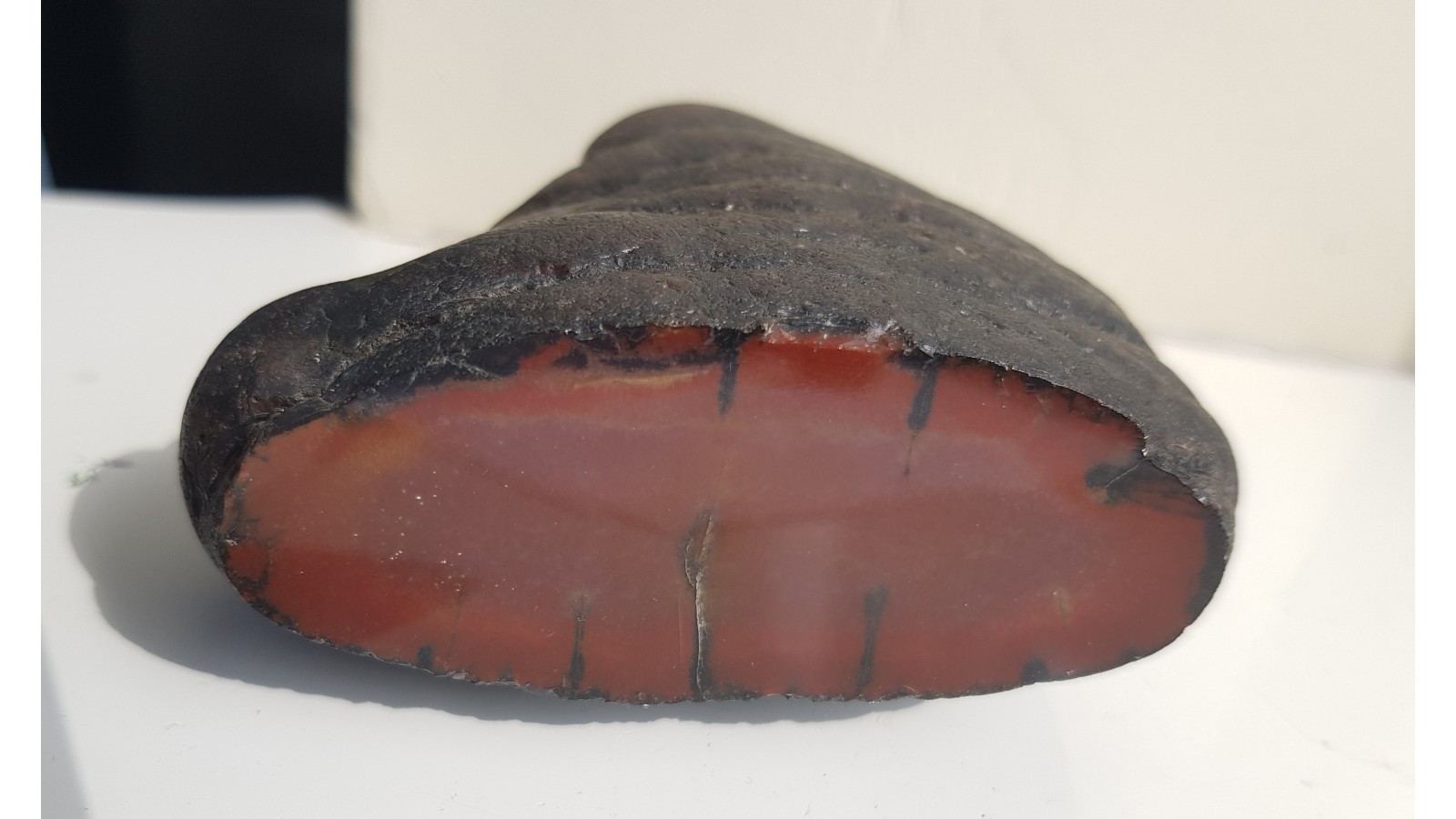 Bardzo estetyczna konkrecja chalcedonowa czerwonej barwy. Piękny poler. Strona tylna naturalna, nie cięta. Okaz pochodzi z aluwiów Nysy Kłodzkiej, ze zbiornika Pilce. Wyjątkowy okaz. Polecam.