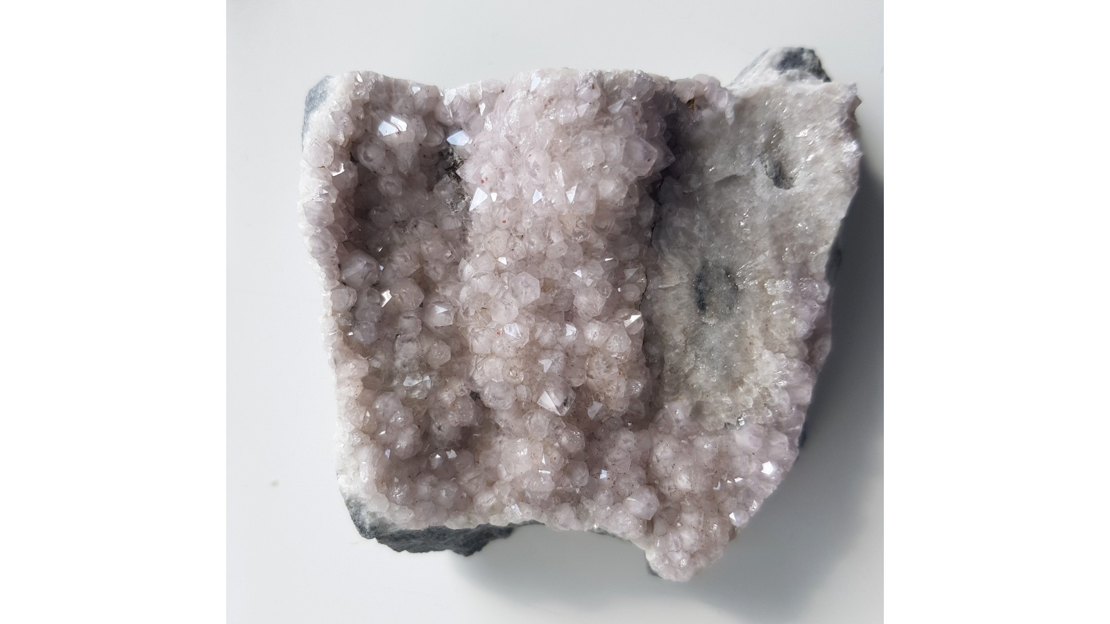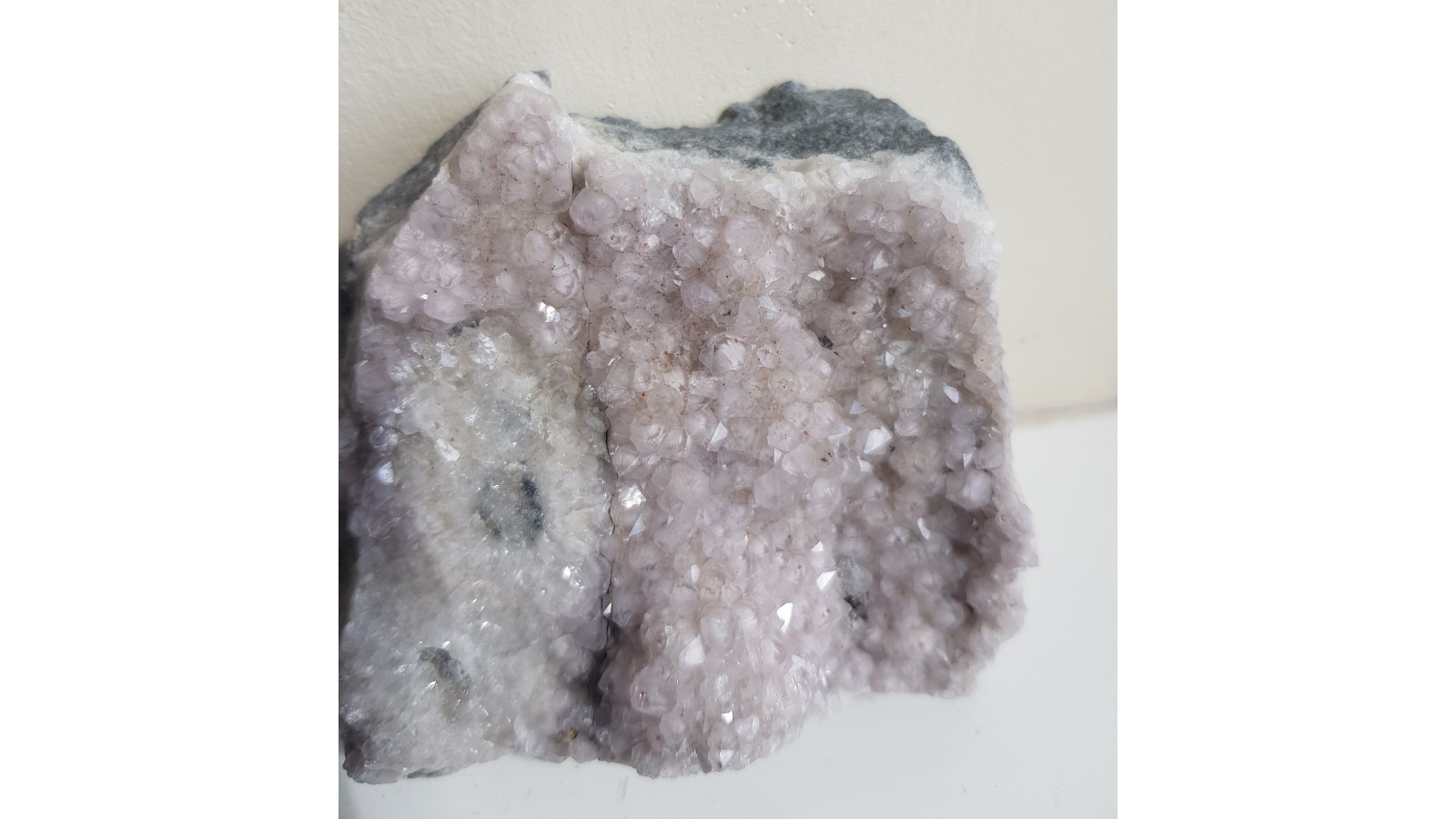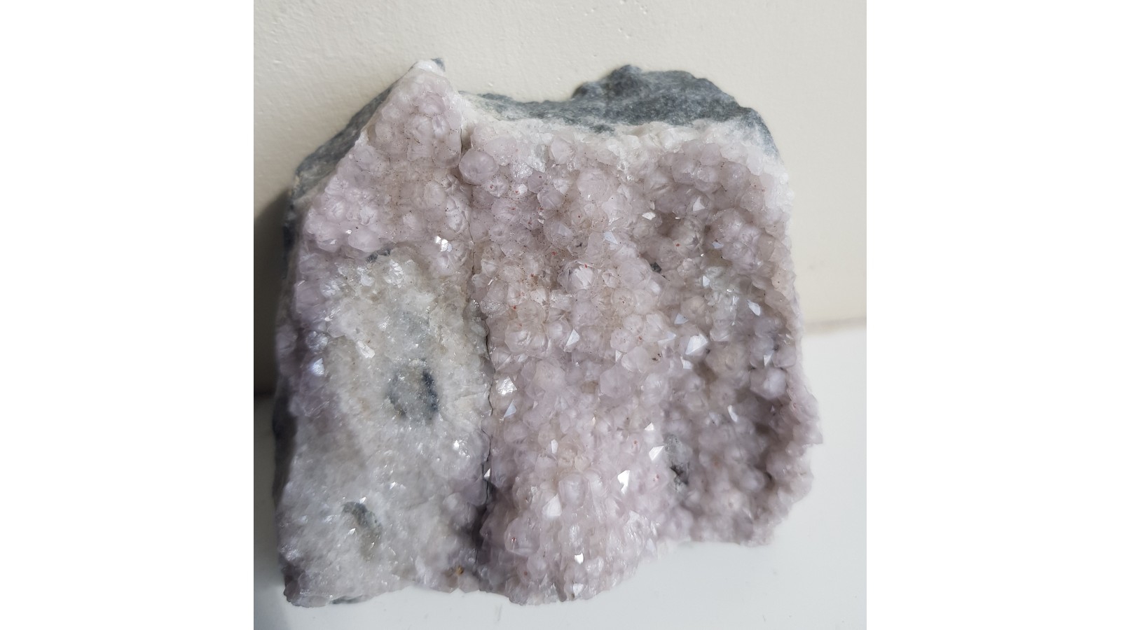 Okaz z nietypowej lokalizacji - najbliższych okolic Lądka-Zdroju. Szczotka kwarcowa z odcieniem ametystowym. Nieuszkodzona, estetyczna. Docięta od spodu w celu zmniejszenia ilości skały. Polecam.