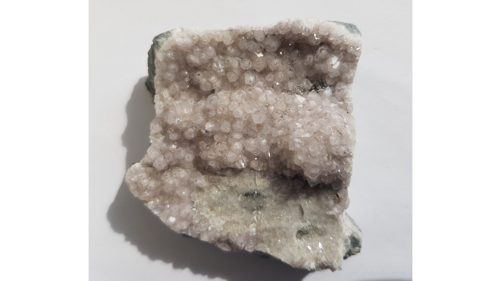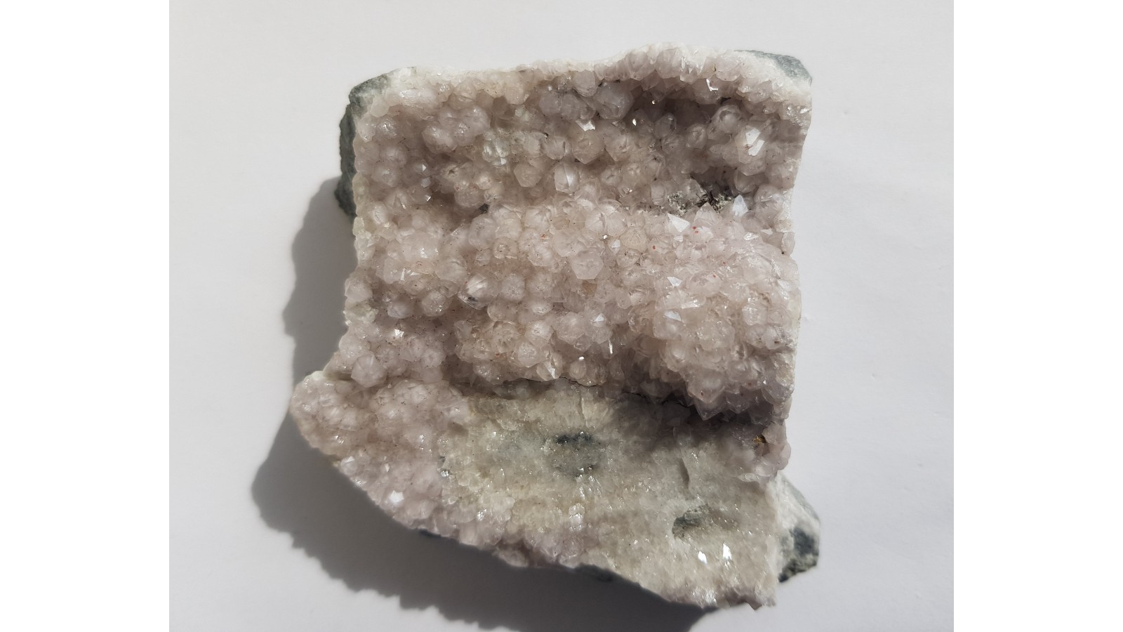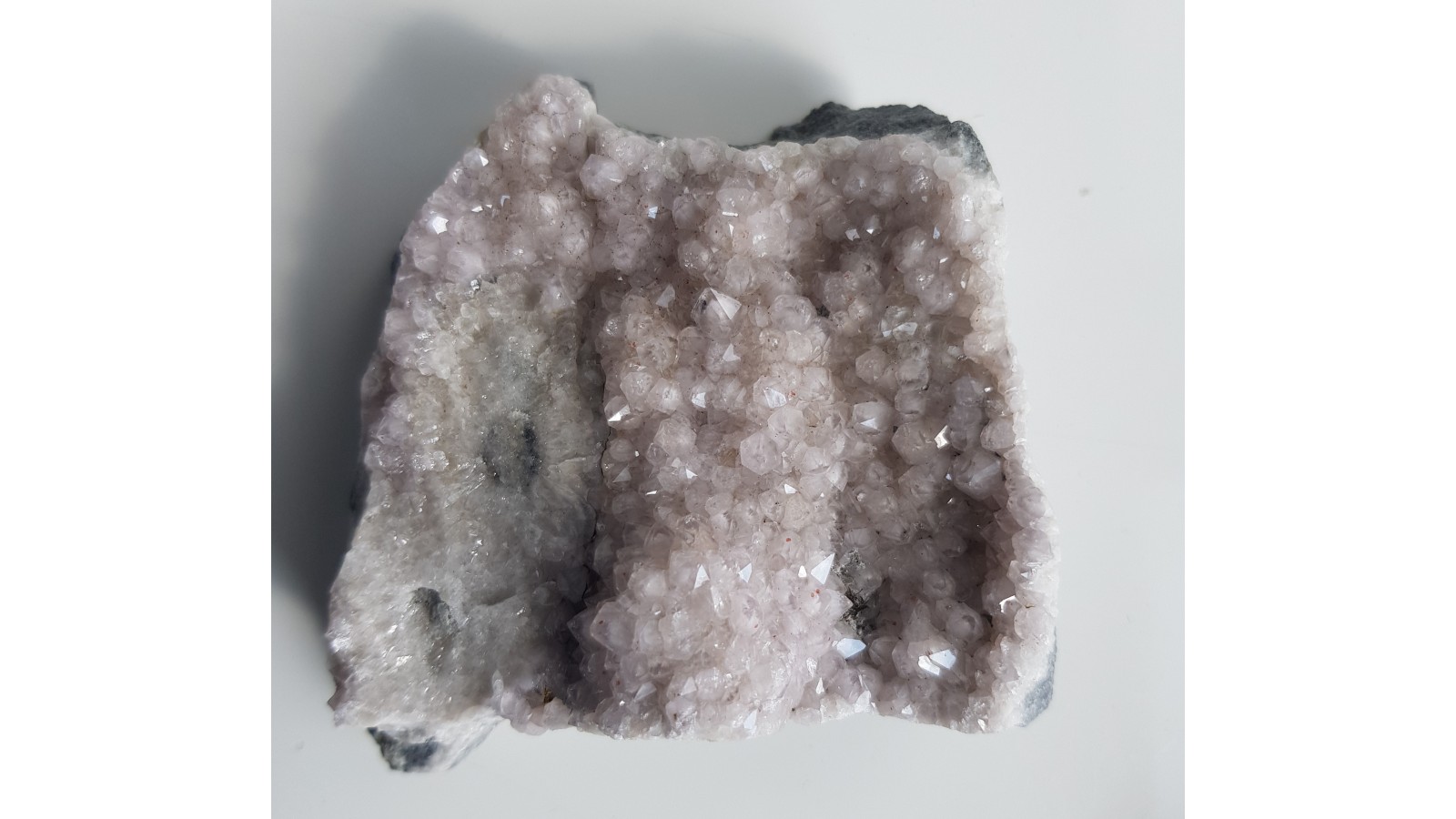 Okaz z nietypowej lokalizacji - najbliższych okolic Lądka-Zdroju. Szczotka kwarcowa z odcieniem ametystowym. Nieuszkodzona, estetyczna. Docięta od spodu w celu zmniejszenia ilości skały. Polecam.