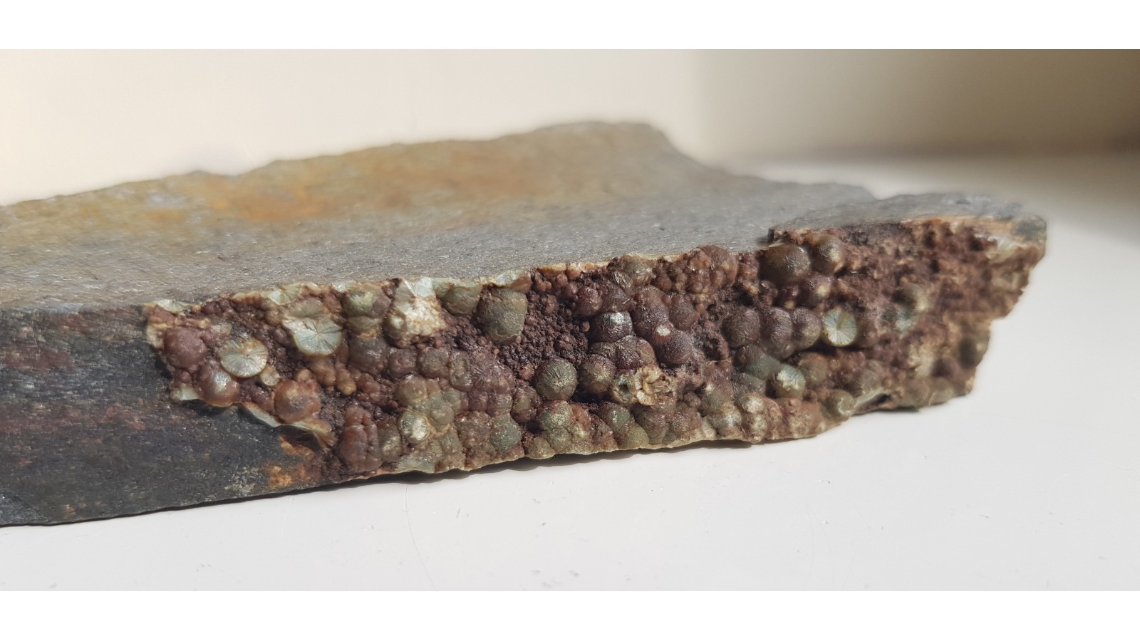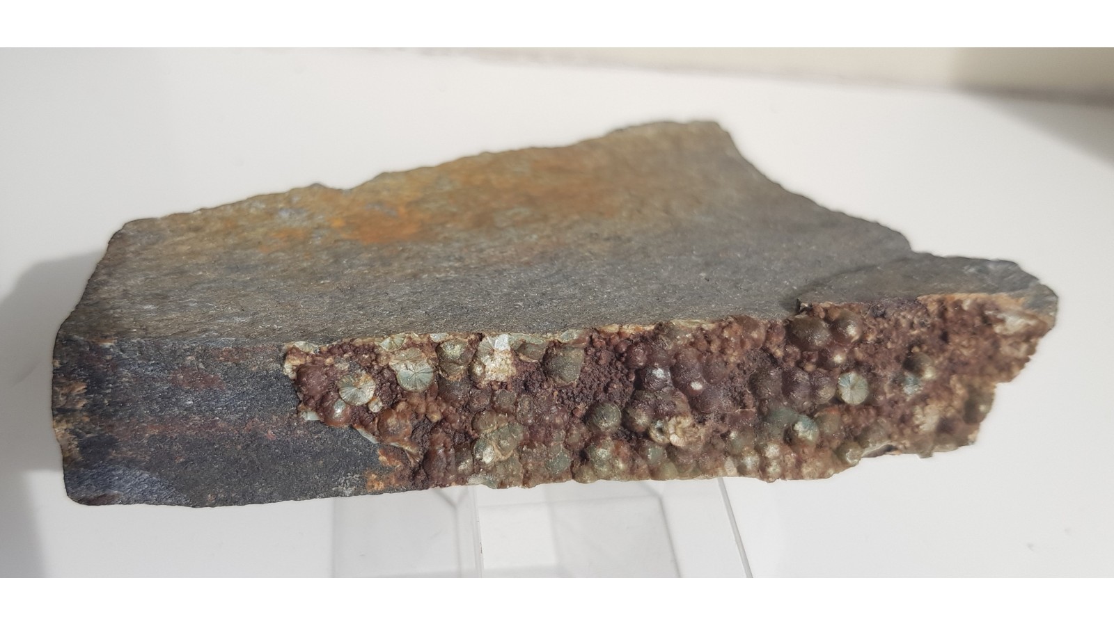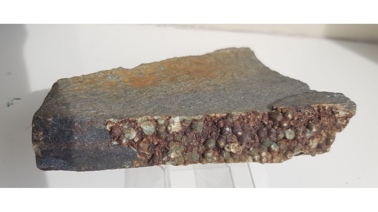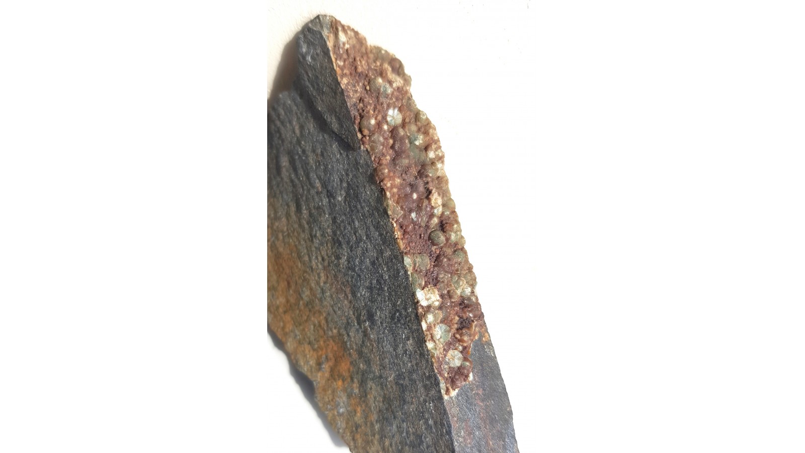 Okaz wavellitu na łupku kwarcowym z Brodziszowa k. Ząbkowic Śl. Pięknie wykształcone sferolity barwy zielonej składające się z igiełkowatych kryształów. Okaz sprzed wielu lat. Słabo znana lokalizacja sudecka. Polecam.