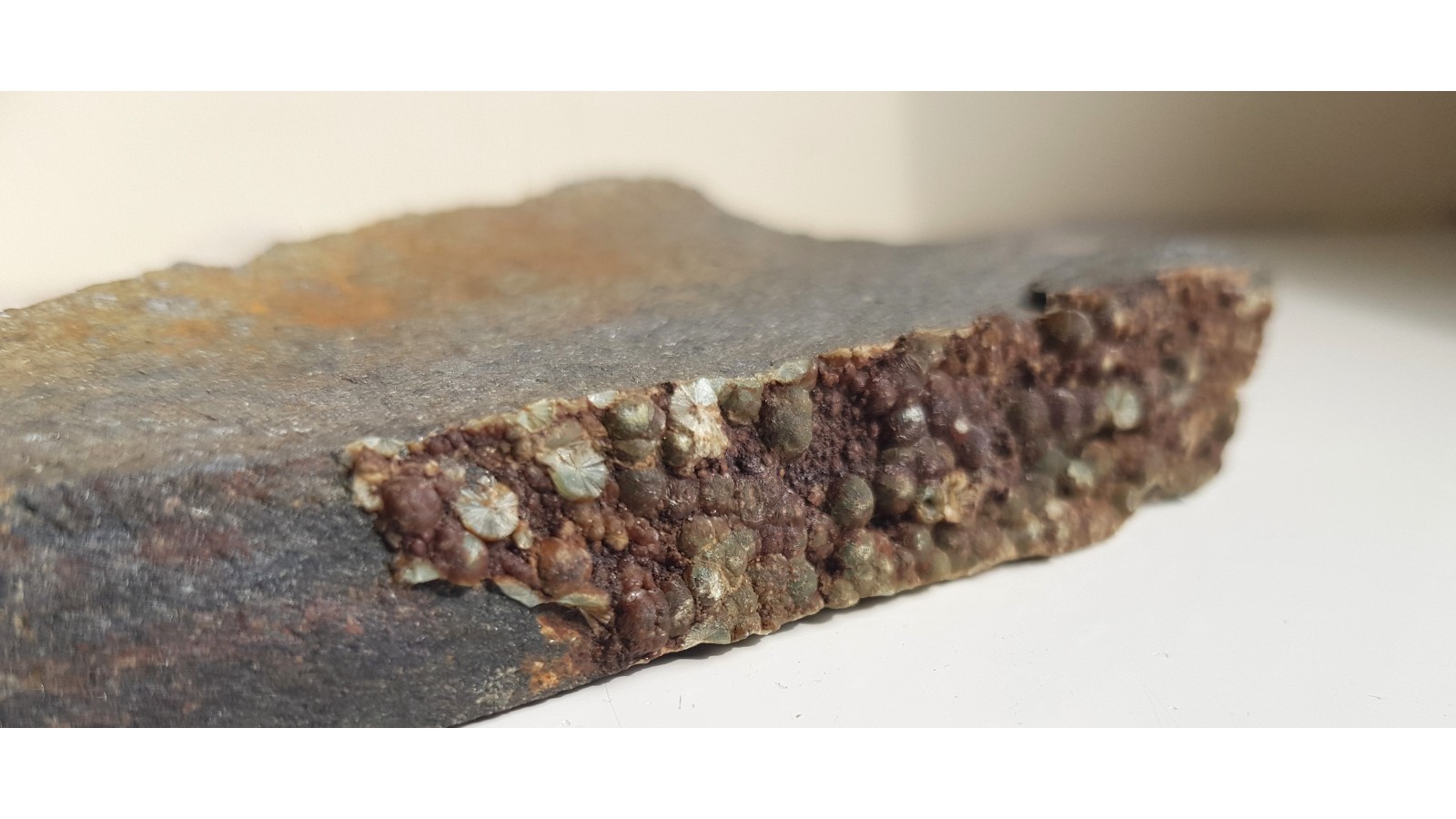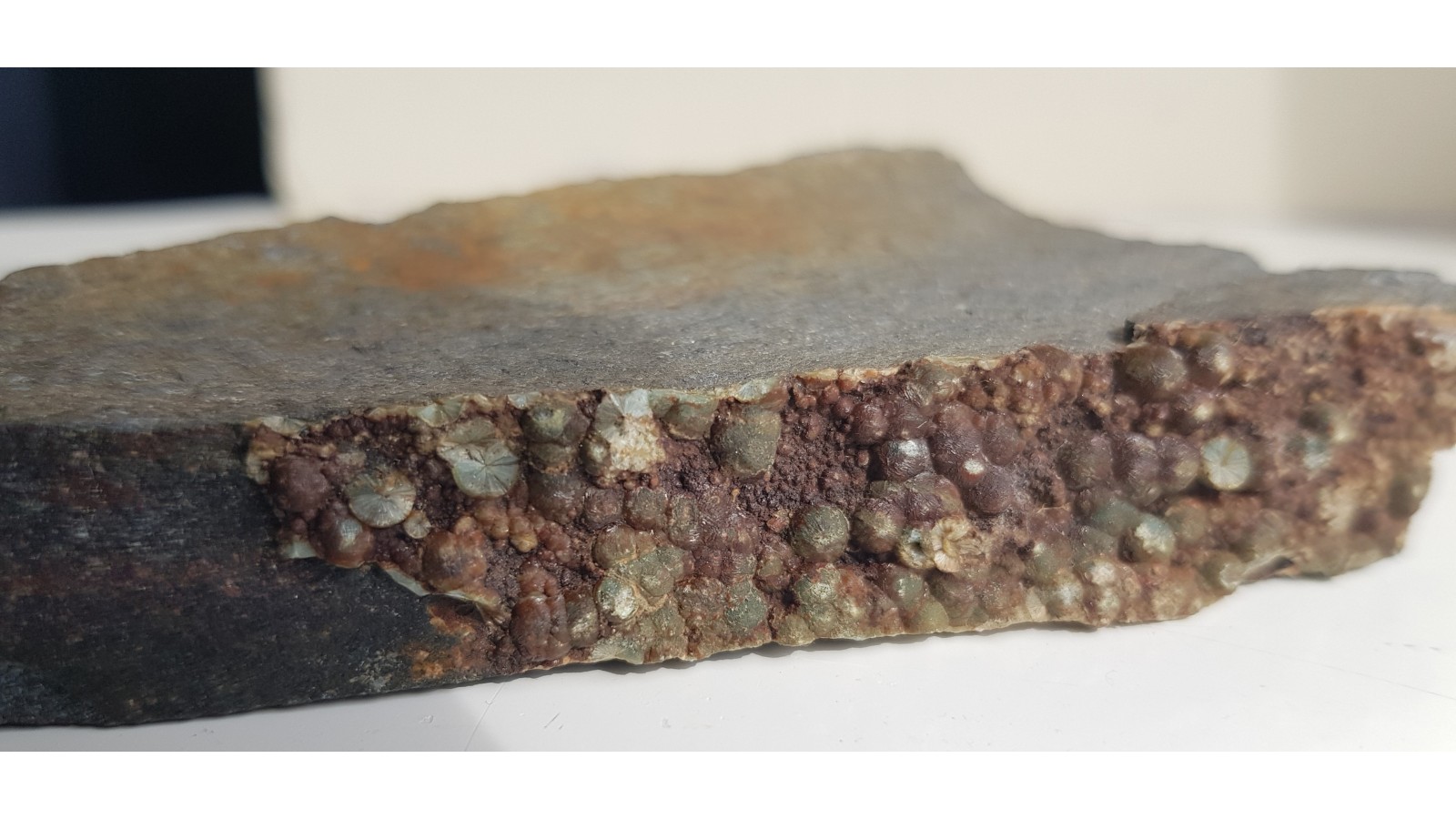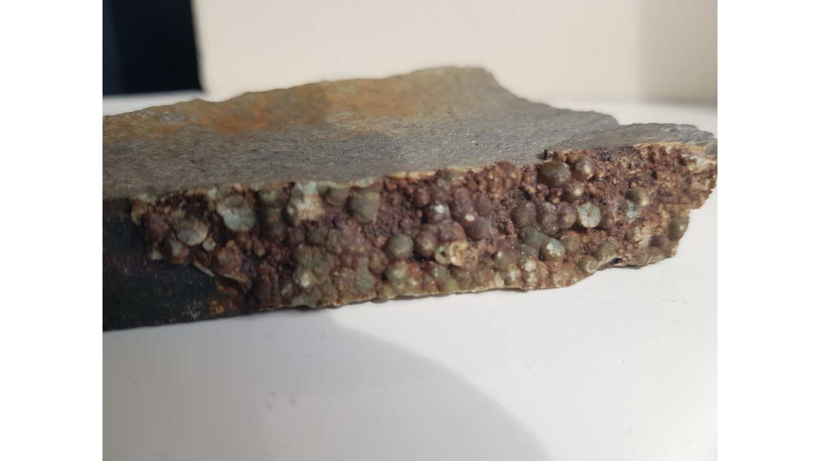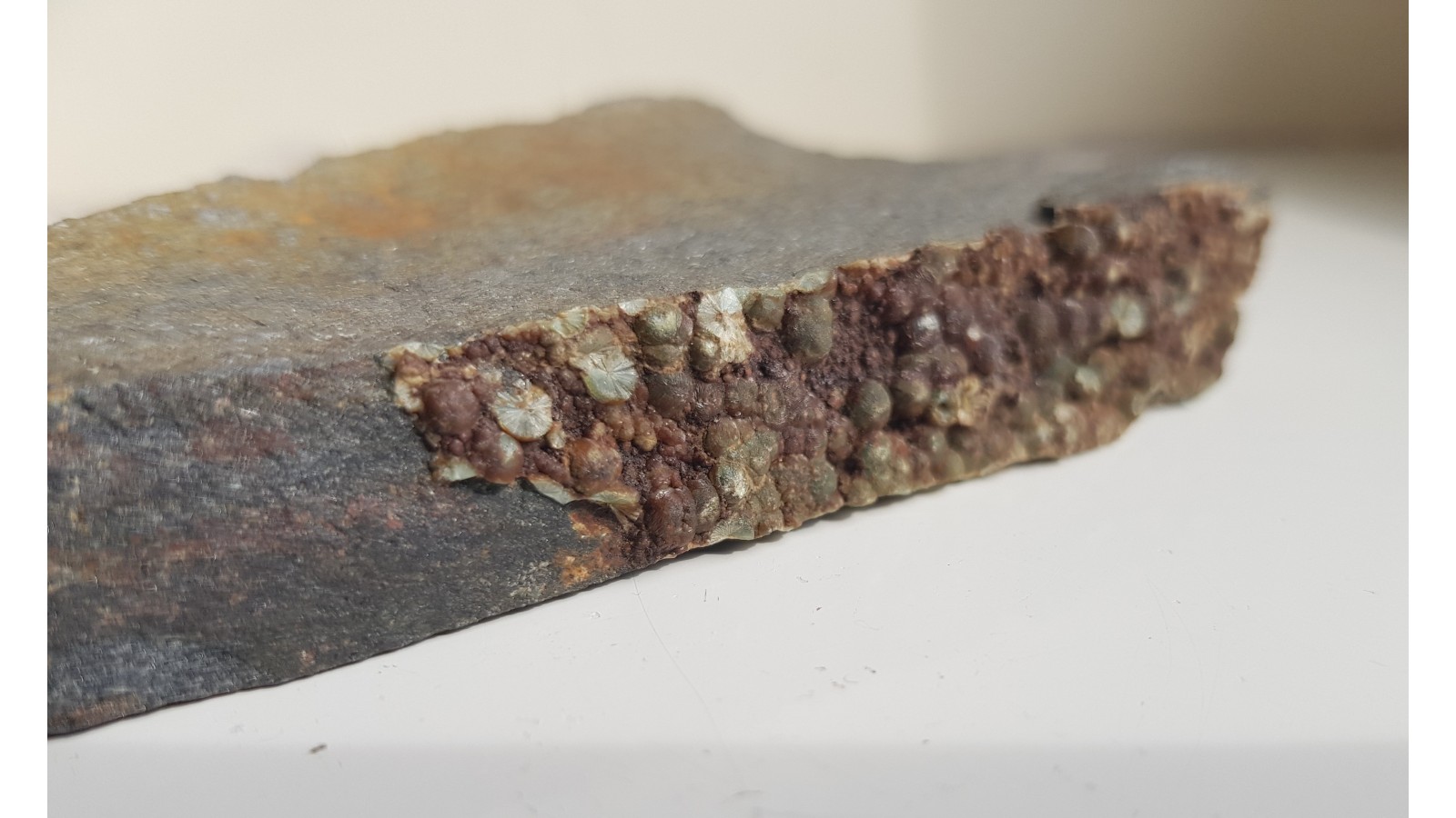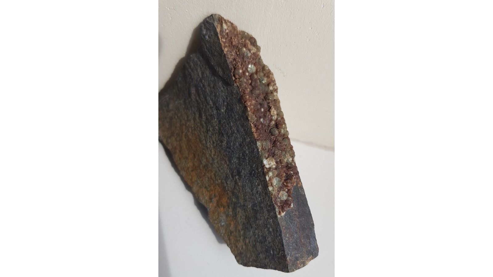Okaz wavellitu na łupku kwarcowym z Brodziszowa k. Ząbkowic Śl. Pięknie wykształcone sferolity barwy zielonej składające się z igiełkowatych kryształów. Okaz sprzed wielu lat. Słabo znana lokalizacja sudecka. Polecam.