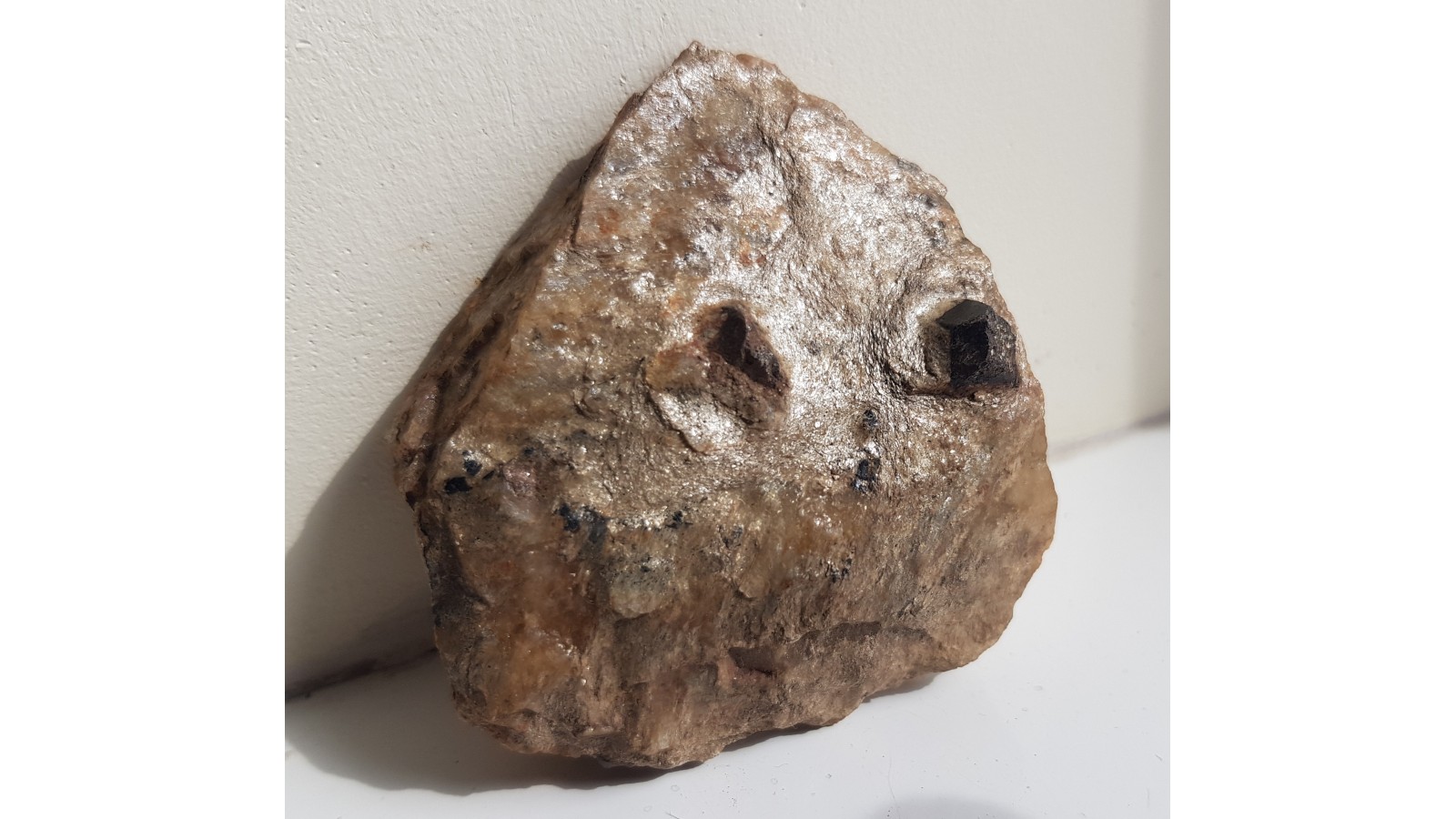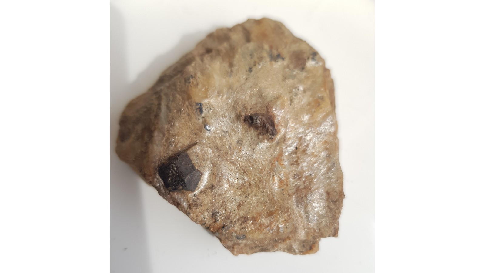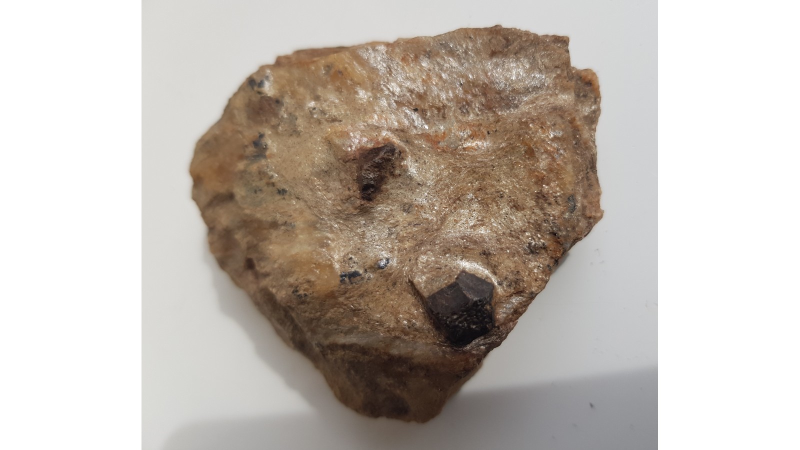 Dosyć duże kryształy - staurolit i granat w łupku mikowym (metapelicie) z Głuchołaz (Opolszczyzna, Sudety Wschodnie, Góry Opawskie). W okazie także małe, blaszkowo rozwinięte kryształy ilmenitu o połysku metalicznym. Granat i sturolit nie są w całości idealnie wykształcone, ale nie są uszkodzone, jedynie nie wszystkie ściany są równie dobrze rozwinięte. Polecam.