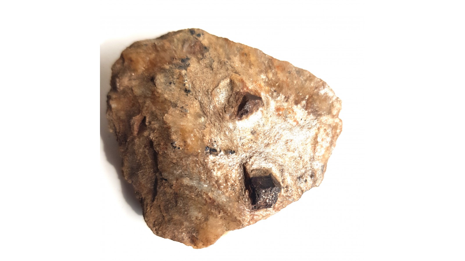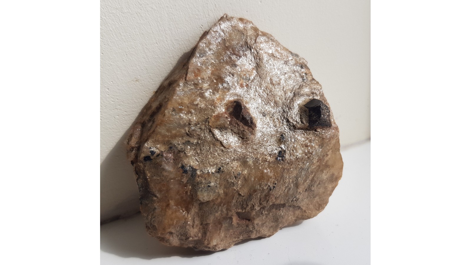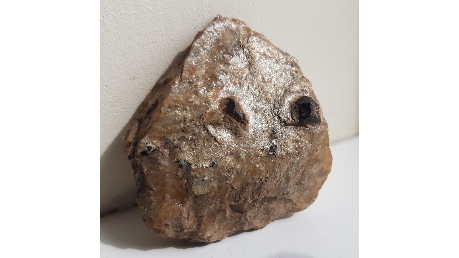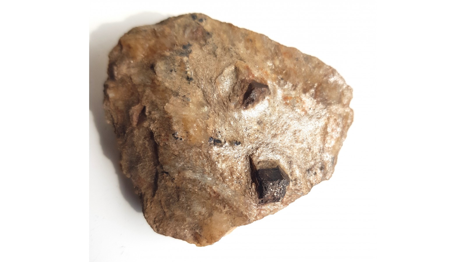 Dosyć duże kryształy - staurolit i granat w łupku mikowym (metapelicie) z Głuchołaz (Opolszczyzna, Sudety Wschodnie, Góry Opawskie). W okazie także małe, blaszkowo rozwinięte kryształy ilmenitu o połysku metalicznym. Granat i sturolit nie są w całości idealnie wykształcone, ale nie są uszkodzone, jedynie nie wszystkie ściany są równie dobrze rozwinięte. Polecam.