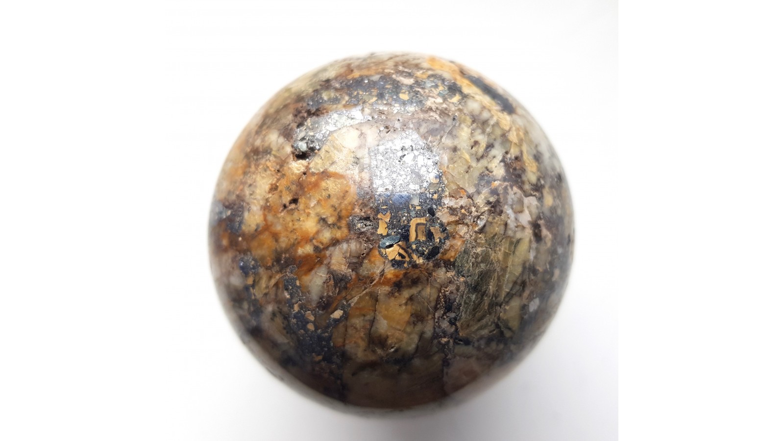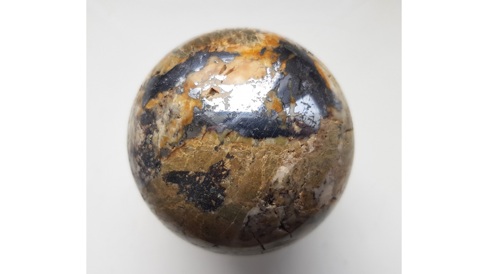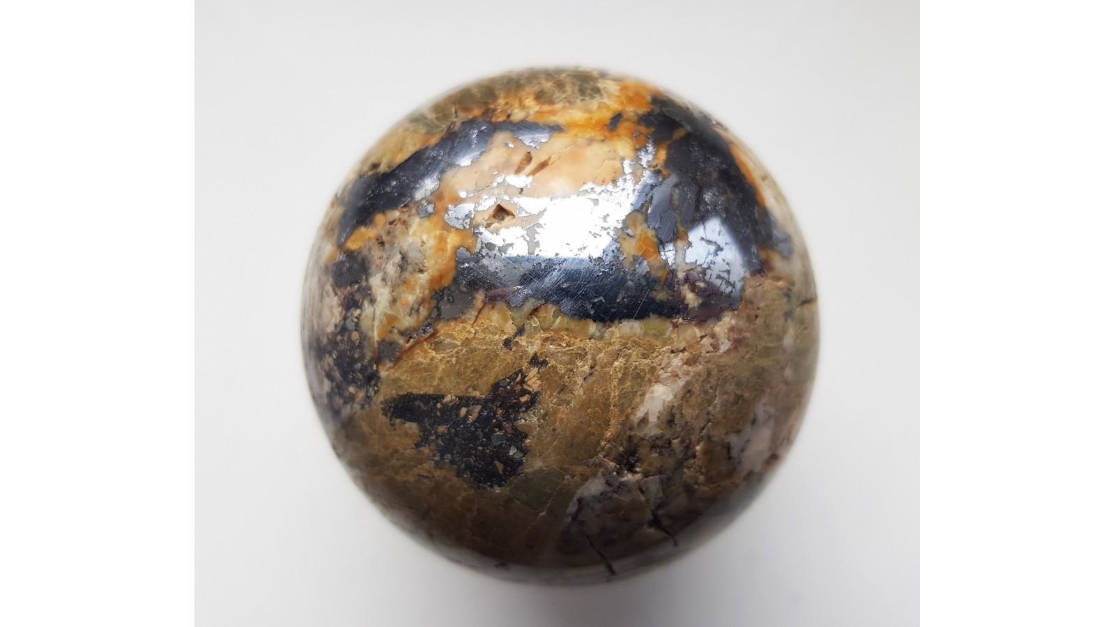Piękna kula z żyły rudnej zawierającej galenę w postaci dużego wydzielenia. Materiał na kulę z dawnej kopani Dorothea w Janowicach Wlk. w Sudetach. Wyjątkowa kula, piękny poler. Polecam.