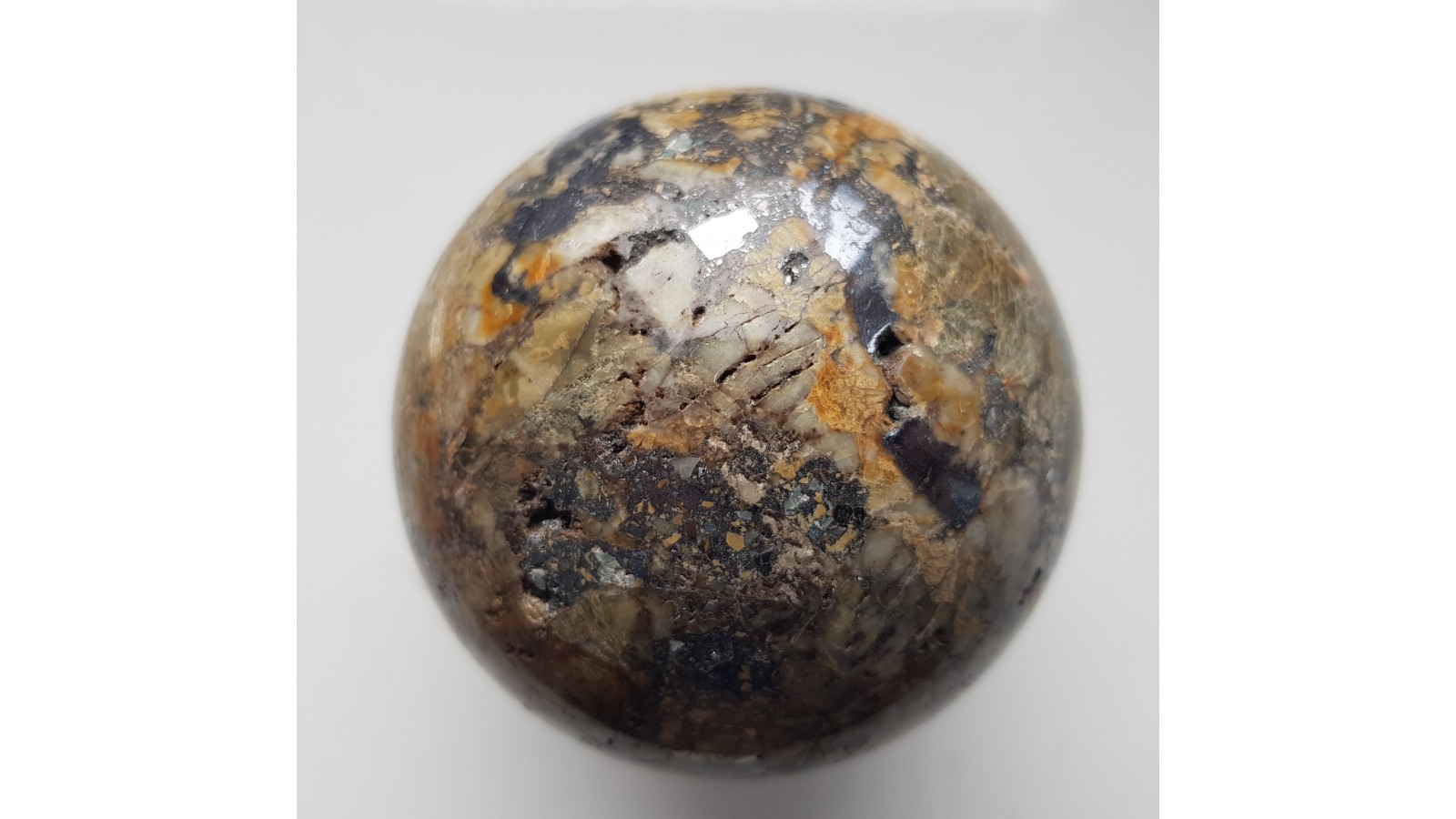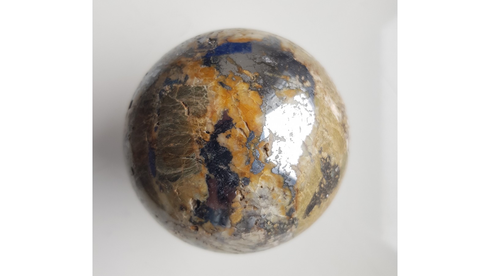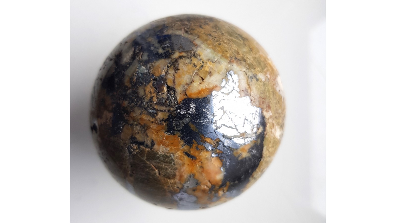 Piękna kula z żyły rudnej zawierającej galenę w postaci dużego wydzielenia. Materiał na kulę z dawnej kopani Dorothea w Janowicach Wlk. w Sudetach. Wyjątkowa kula, piękny poler. Polecam.