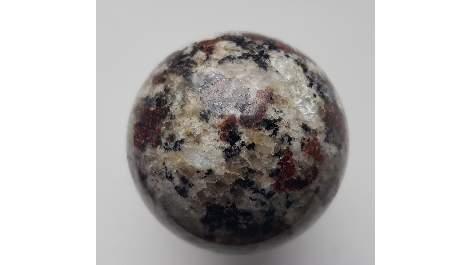Piękna kula z jasnego granulitu z dużą ilością granatów z okolic jeziora Inari w Finlandii. Niektóre skalenie iryzują. Piękny poler. Polecam.