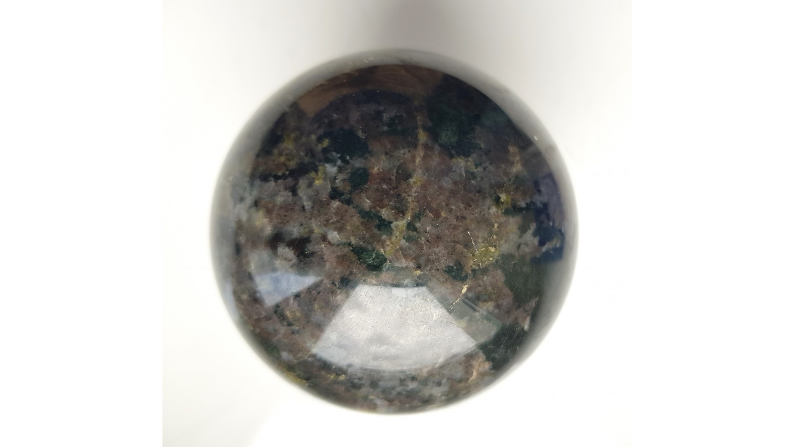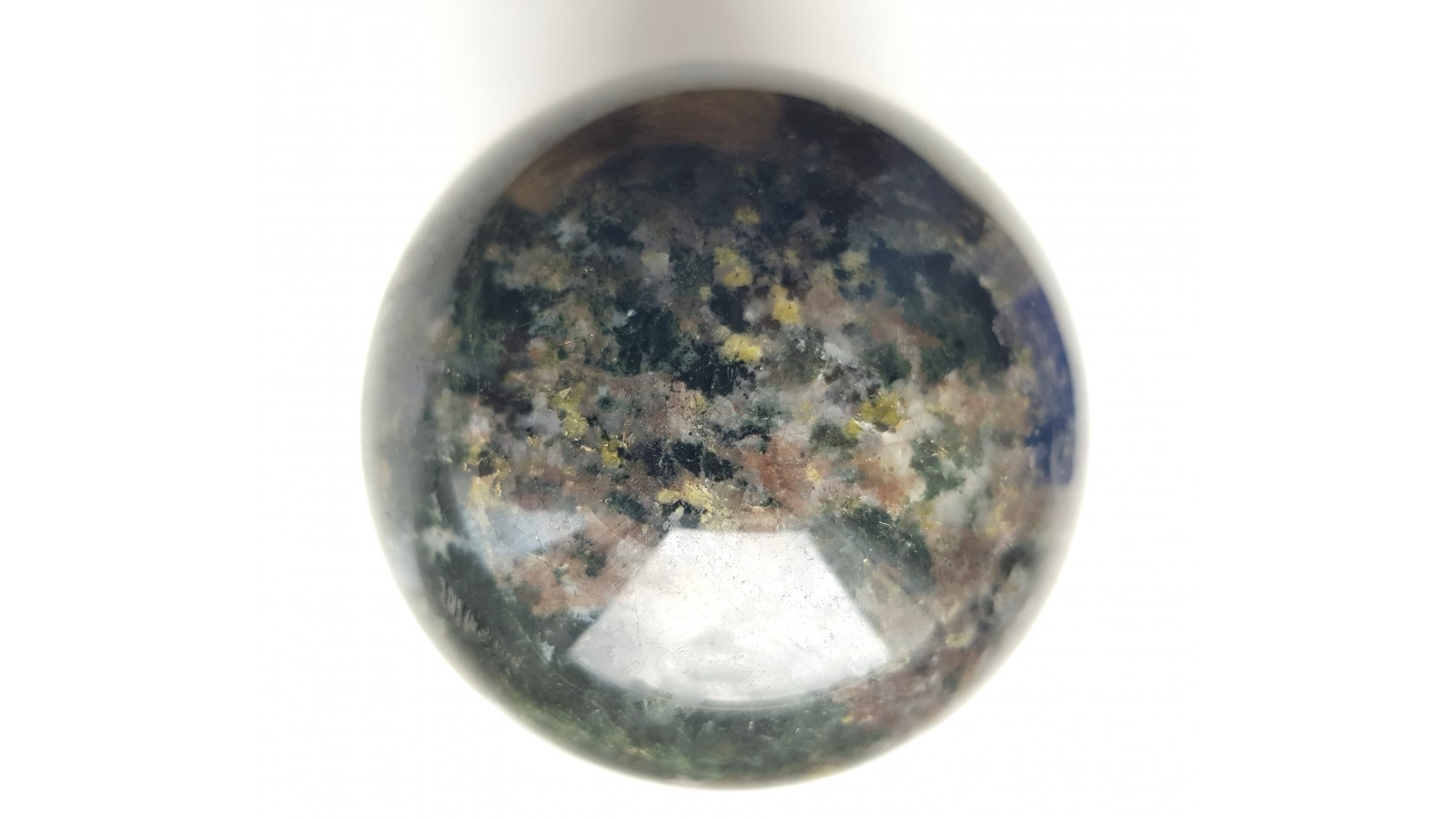 Unikatowa kula wykonana ze skapolitu. Świeci w UV 255 nm na pomarańczowoczerwono. Bardzo trudno dostępne miejsce otoczone bagnami w okolicach Svappavaary, północna Szwecja, niedaleko Kiruny. Dotarcie do starej kopalni i hałdy nie oznaczone, daleko od siedzib ludzkich. Skapolit buduje dużą część okruszcowanego skarnu z chalkopirytem i molibdenitem. Strefy szarofioletowawe to skapolit. Kula masywna, niespękana, bardzo twarda, wyjątkowo piękna. Idealny poler. Polecam.