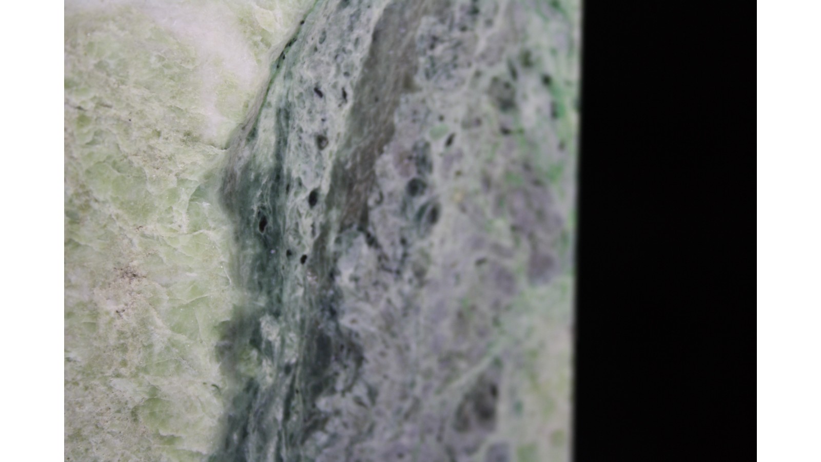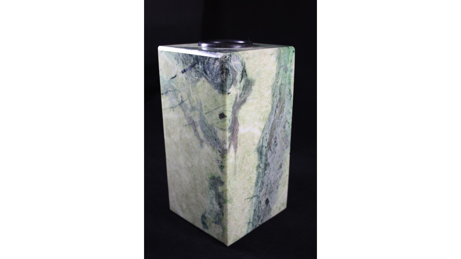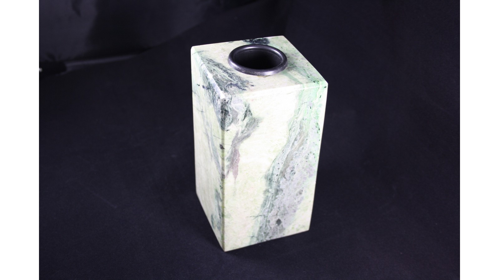 Prostopadłościenny wazon wykonany z rzadkiej, wyjątkowo ozdobnej odmiany skały zwanej rodingitem (nazwa od gór Roding na Nowej Zelandii). Skała, z której wykonano wazon ma barwę jasnozieloną ze smugami i plamami fioletu, szrości, czerni. Wyjątkowe bogactwo deseni i odcieni wymionionych barw powoduje, że wazon jest niezwykle interesujący wizualnie z każdej strony. Skała, z kórej wykonano obiekt pochodzi z kamieniołomu serpentynitu w Nasławicach niepodal Wrocławia. Może stanowić ozdobę każdego interesującego, niebanalnego wnętrza. Będzie z pewnością doatarczał radości z obcowania z czystym pięknem unikatowej skały a dla osób ufających w moc natury będzie emanacją jej niezwykłych możliwości.