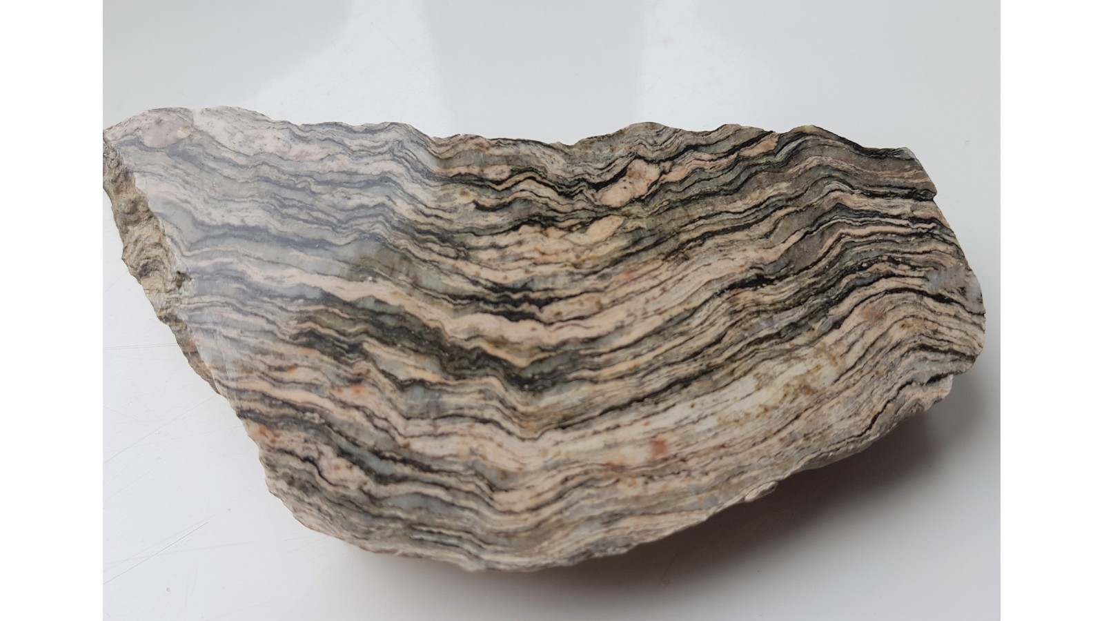 Polerowany okaz gnejsu mylonitycznego (smugowany do mylonitycznego) z Kowar. Ładna płytka, polecam.