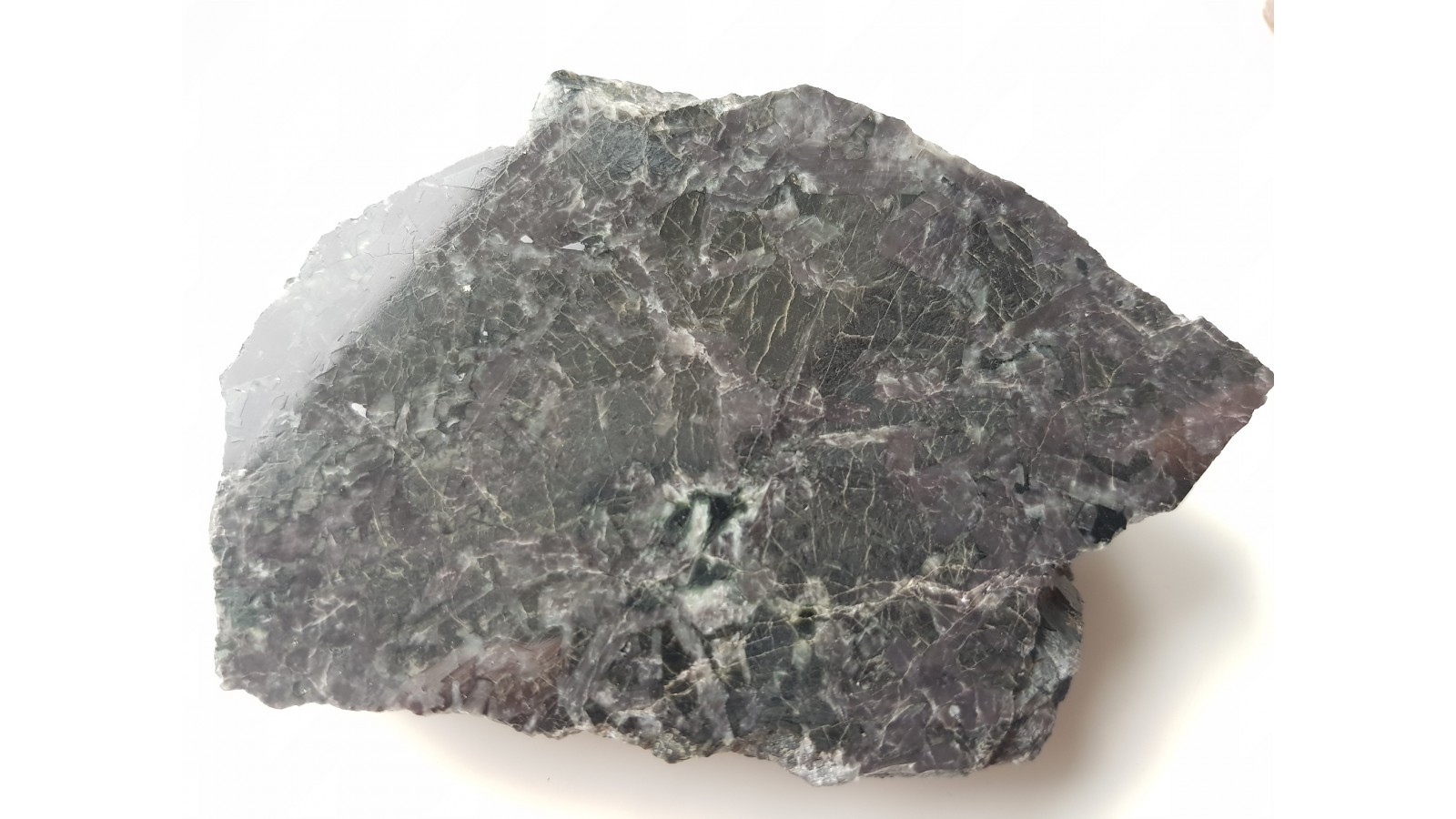 Okaz anortozytu z Nowej Rudy z dawnej kopalni Piast. Piękny poler. Skała w jednym miejscu delikatnie iryzuje, lecz w barwach szrobrązowych, bez charakterystycznej dla labradorytu barwnej iryzacji. Okaz petrologiczny.