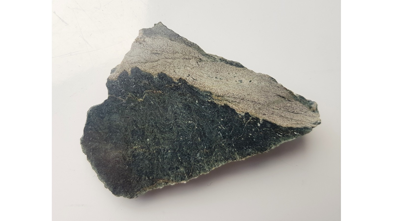 Nefrytoid z bezpośredniego kontaktu leukogranitów Pasma Kamienieckiego z łupkami serycytowymi. Skała poddana dynamometamorfizmowi kontaktowem (silnie sprasowana, "zmięta", zafałdowana). Widoczne "igły" amfiboli, ciemnozielona, niemal czarna barwa. Skała niezwykle zwięzła, trudna do rozbicia. W okazie widoczny zarówno jasny leukogranit, jak i nefrytoid na kontakcie z nim. Doskonały poler. Absolutna rzadkość. Sygnalizowana wcześniej w pracach W. Heflika oraz M. Saschanbińskiego.