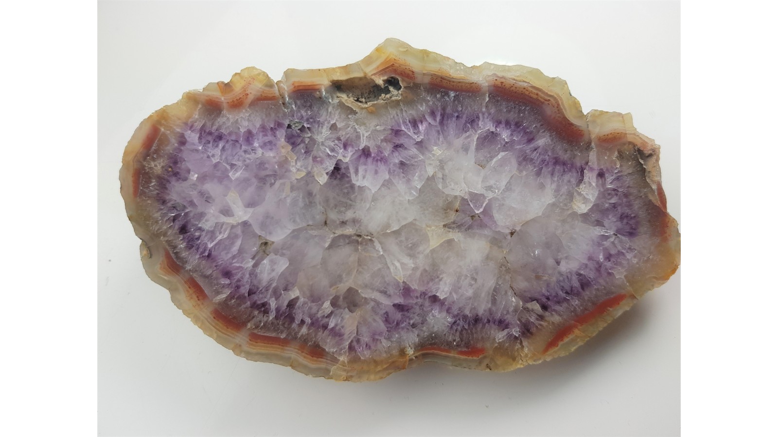 Piękna polerowana połówka geody ametystowo-agatowej z osadów Bobru w Sudetach. Doskonały, estetyczny okaz.
