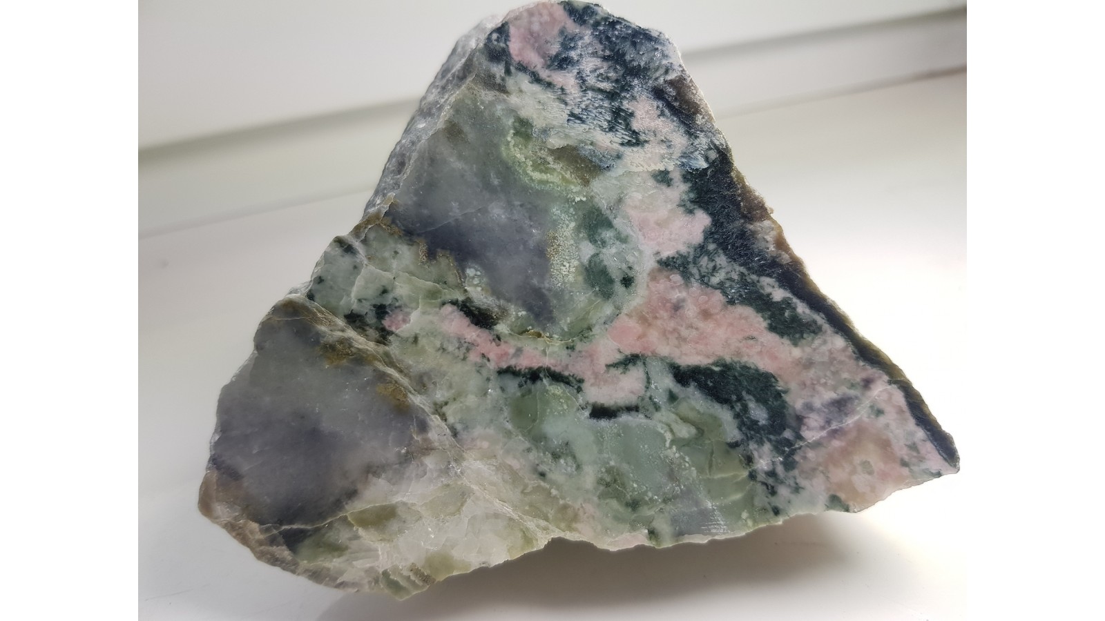 Polerowany okaz skarnu z Łażan k. Żarowa zawierający minerały z grupy serpentynu oraz dokładnie niezidentyfikowane różowe minerały, prawdopodobnie zoisyt.