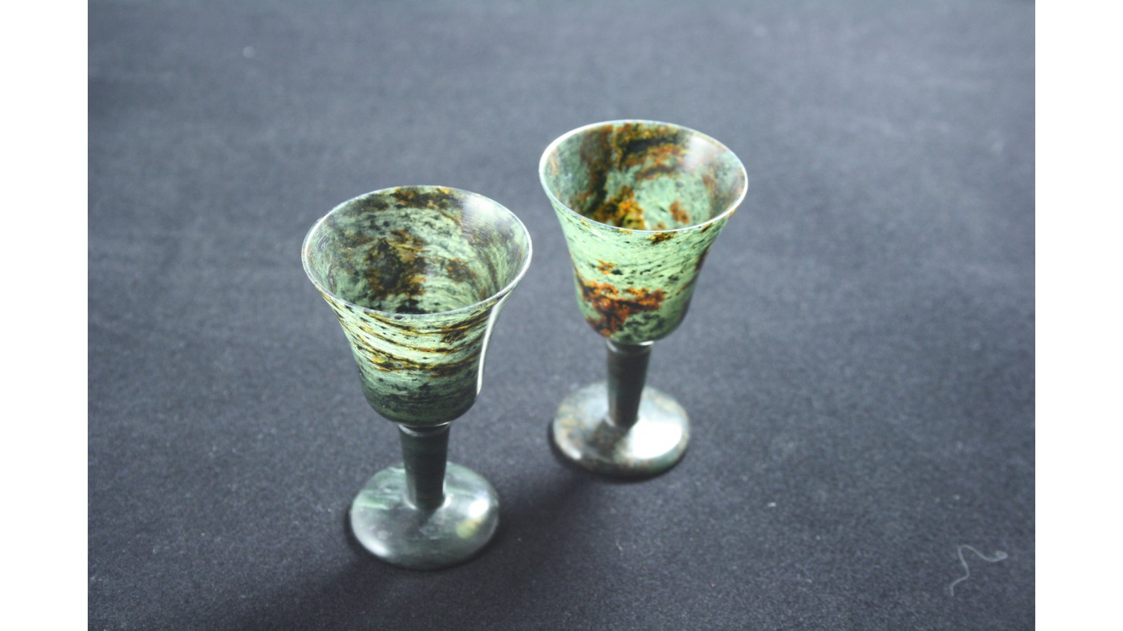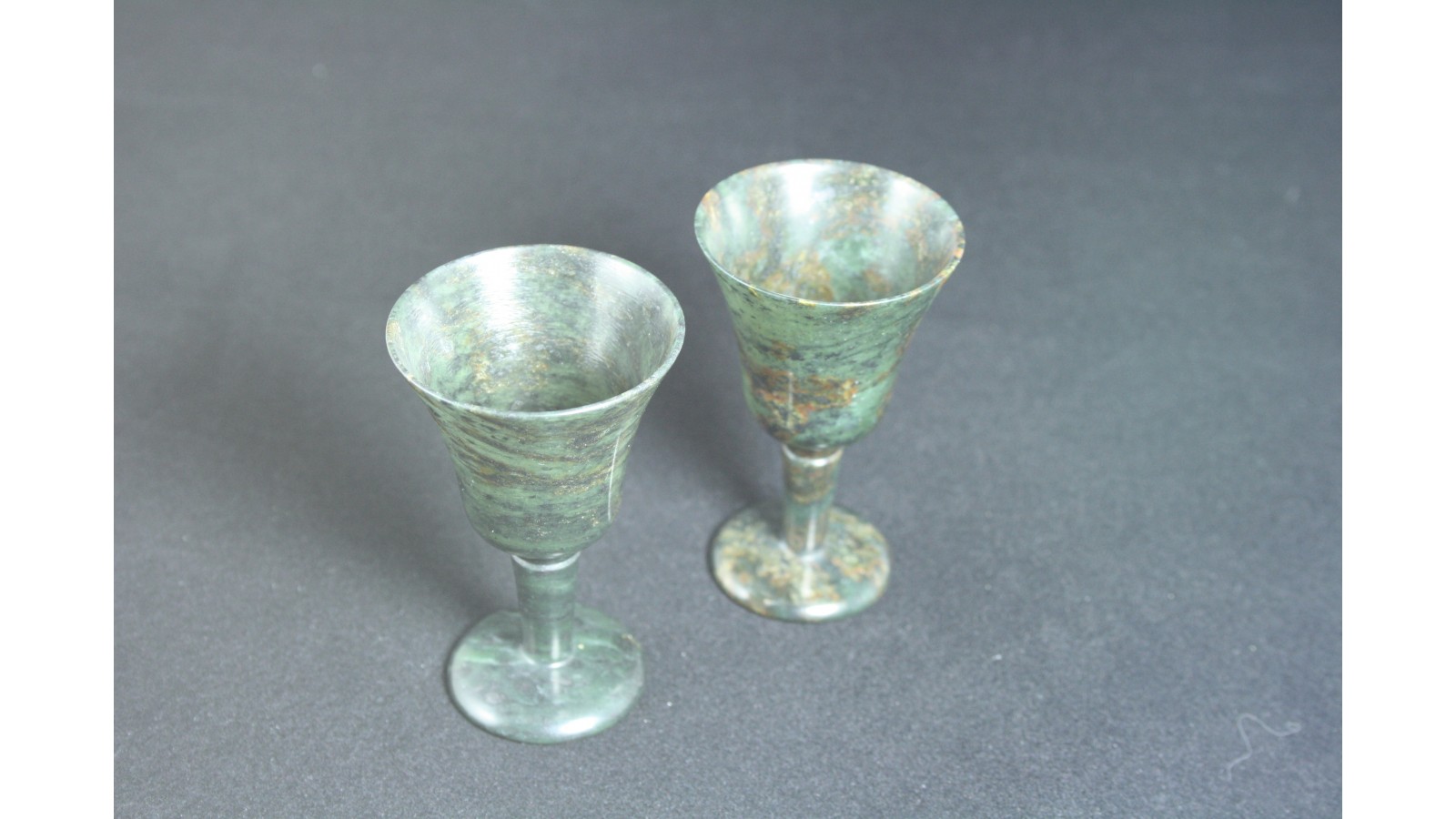 Wyjątkowa para kieliszków wykonanych z niezwykłą precyzją z kamienia - serpentynitu (żmijowca). Kileliszki o cienkich ściankach z łatwością przepuszczają światło, ujawniając barwę, desenie i strukturę naturalnej skały. Są prawdziwie królewskim naczyniem na, jak można sądzić, wyjtkowe okazje i z przeznaczeniem na wyjątkowe alkohole pite przez wyjątkowych właścicieli...