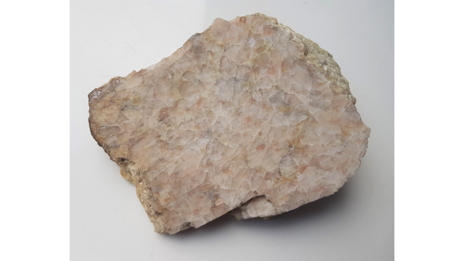 Okaz skały topazowej (niemal monomineralna skała topazowa) o barwie delikatnie różowej. Okaz polerowany. Ciekawa barwa skały, która zazwyczaj jest w tej lokalizacji całkowicie biała bądź bezbarwna.