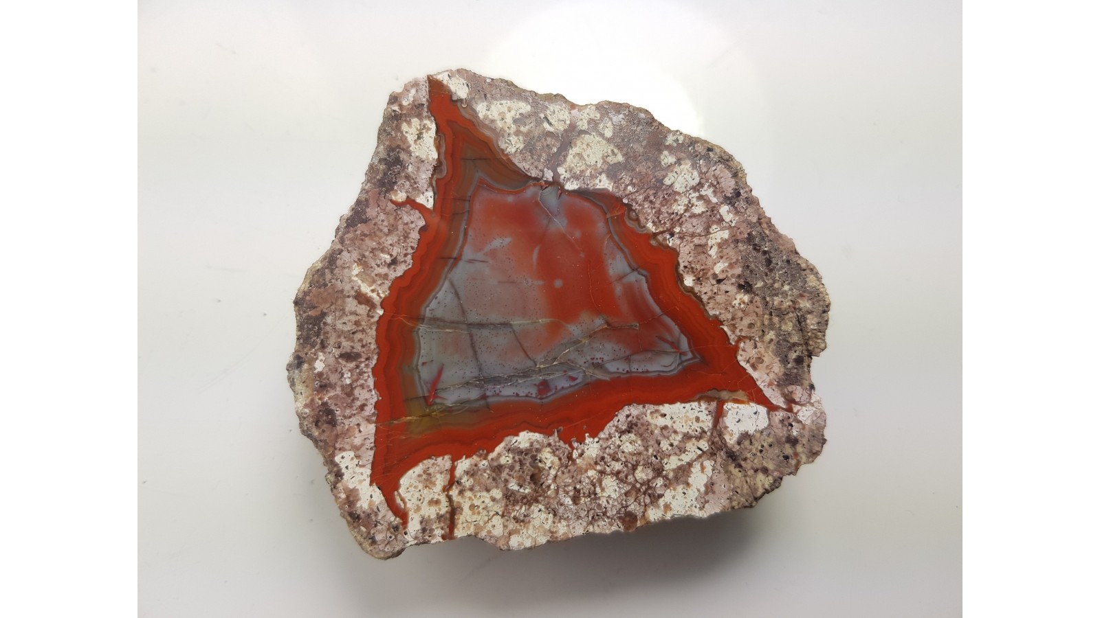 Polerowany agat z Nowego Kościoła. Piękny, nietypowy okaz o barwach - koralowoczerwonej i błękitnej.